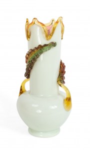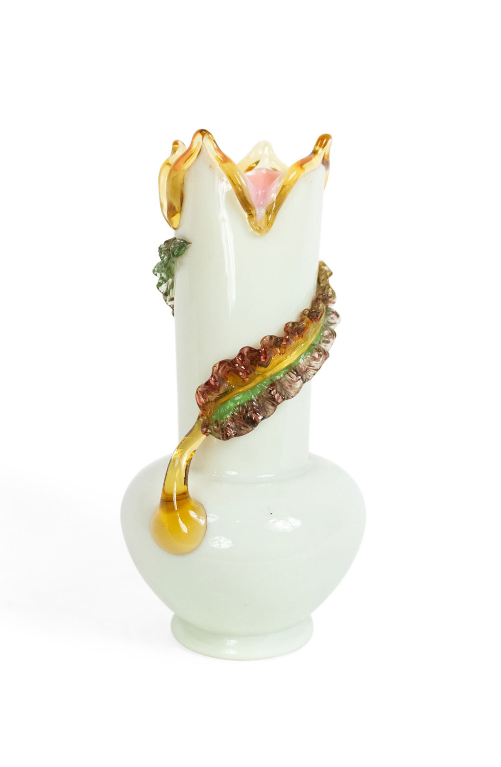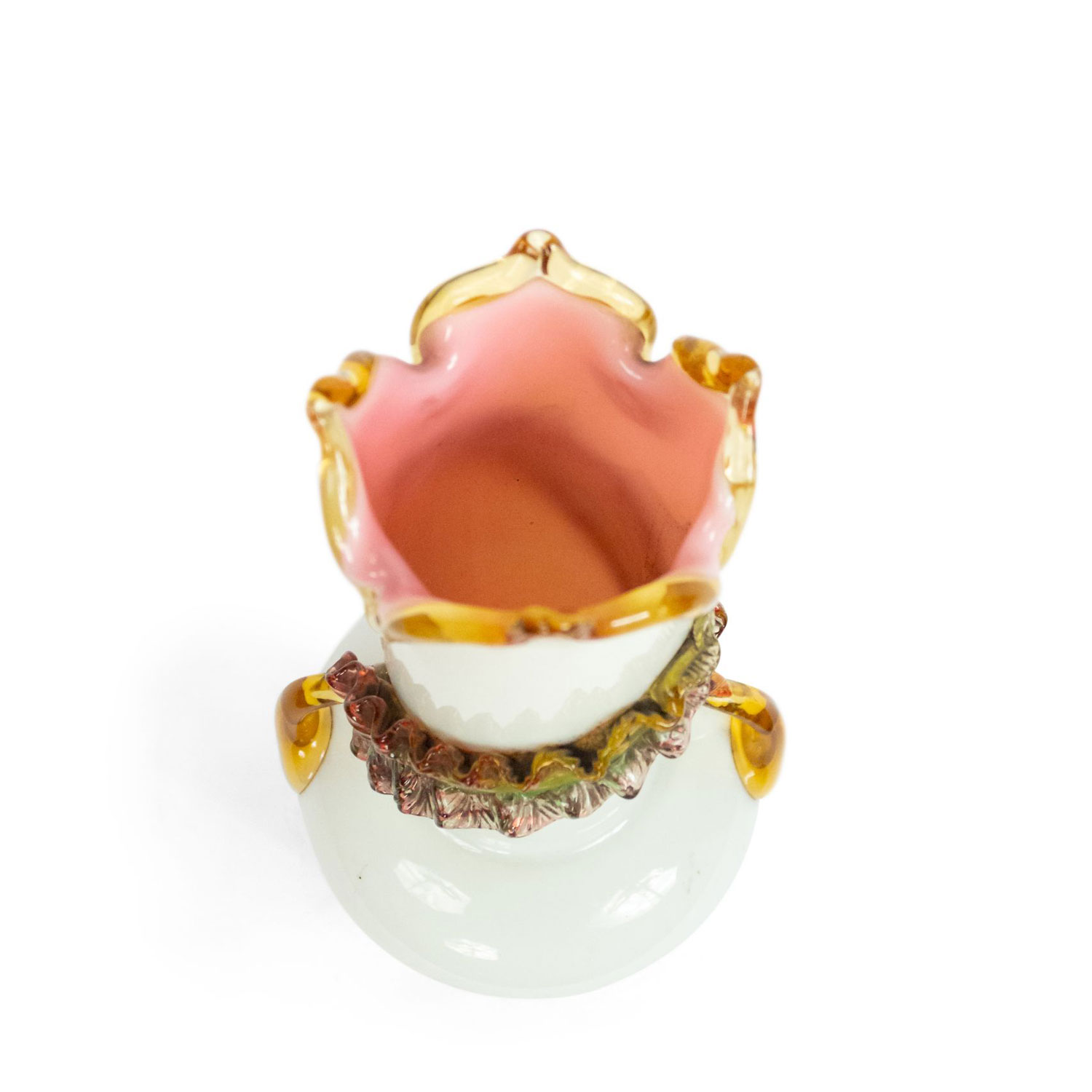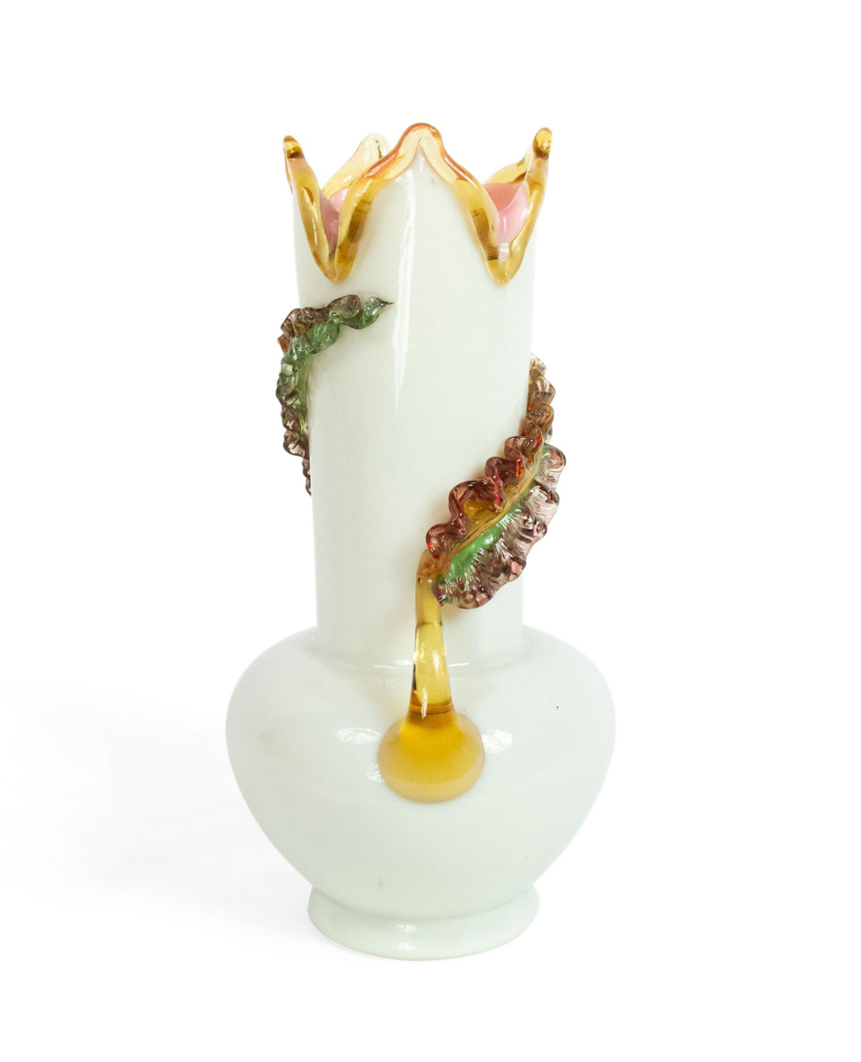 PAIR of Italian 1930's Murano white and pink glass vases with amber and colored leaf glass trim and shaped top. (PRICED AS PAIR).