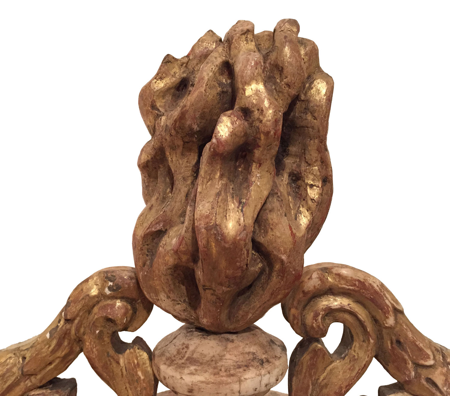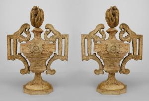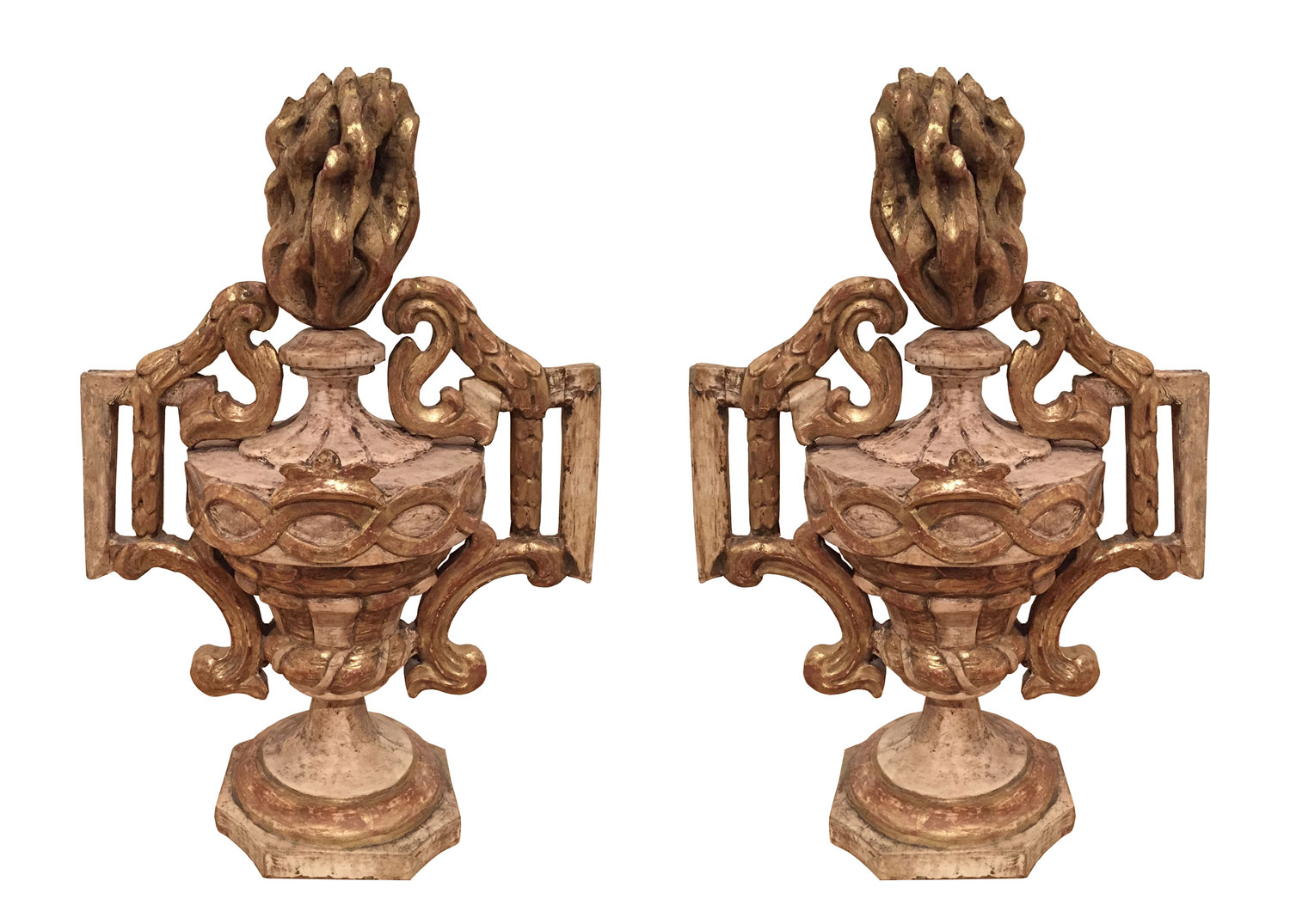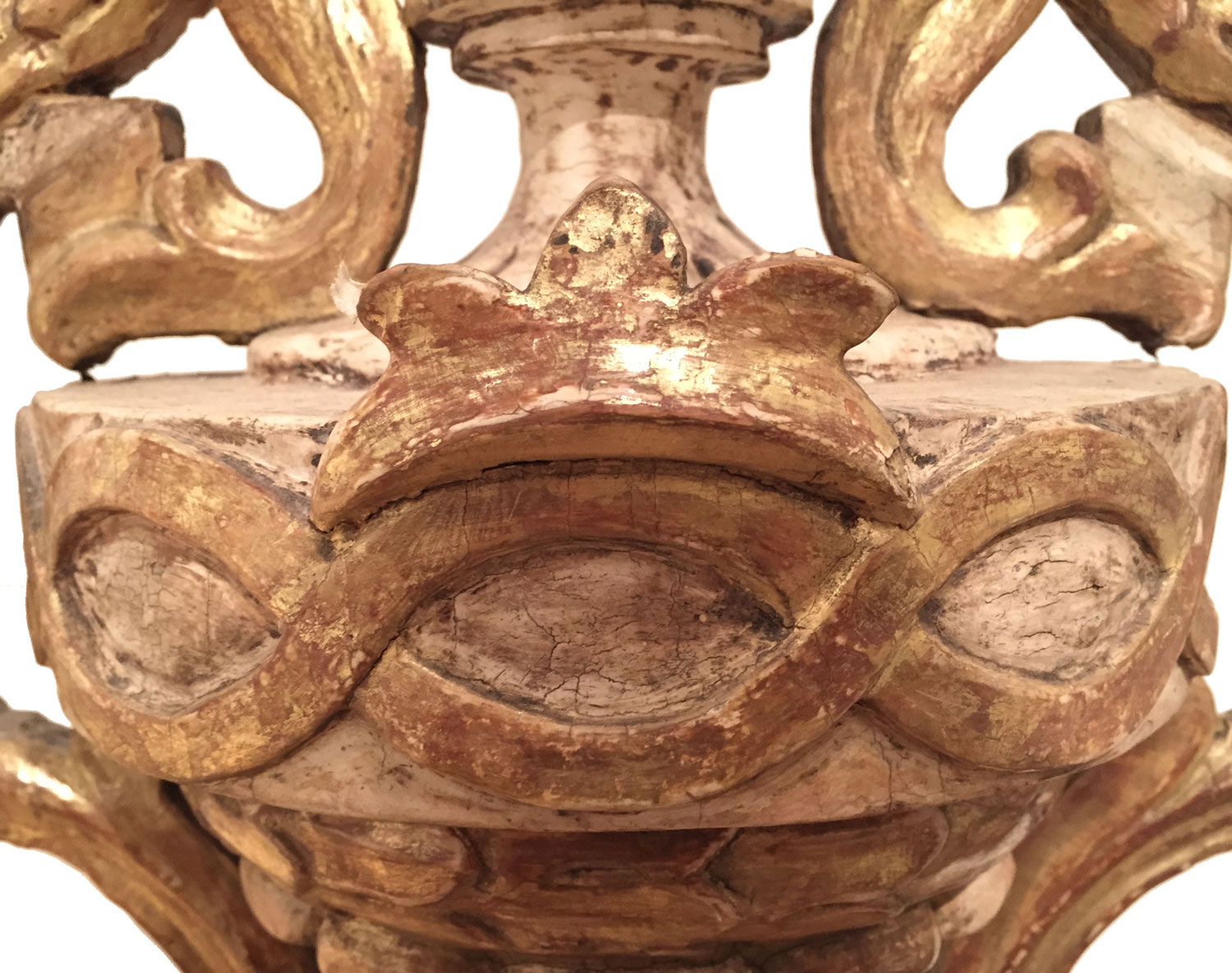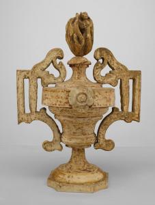 PAIR of Italian Neo-classic (18th Cent) cream painted and gilt trimmed carved urns/finials with gilt flame top and open design side arms (PRICED AS PAIR)