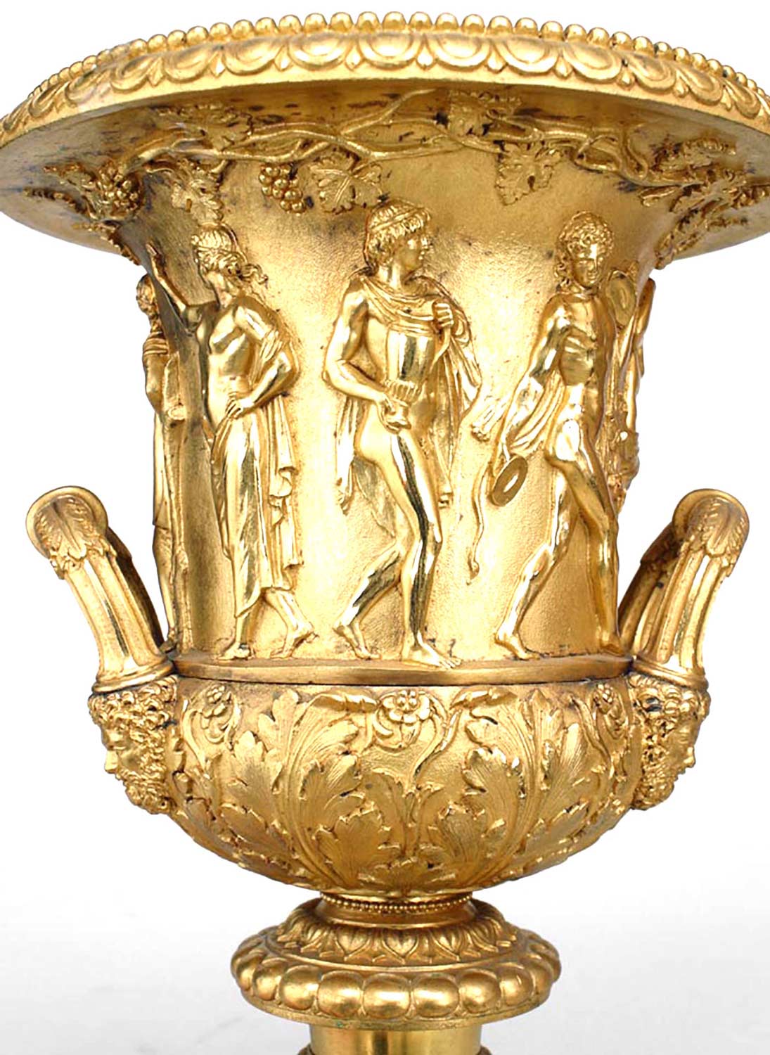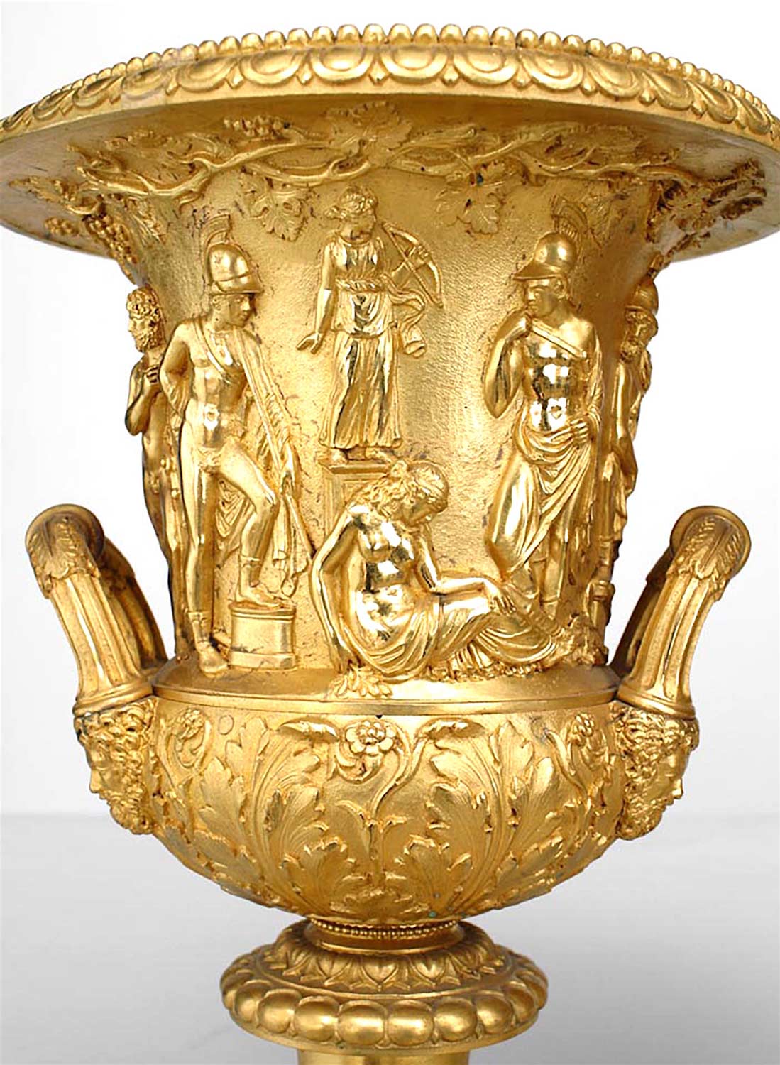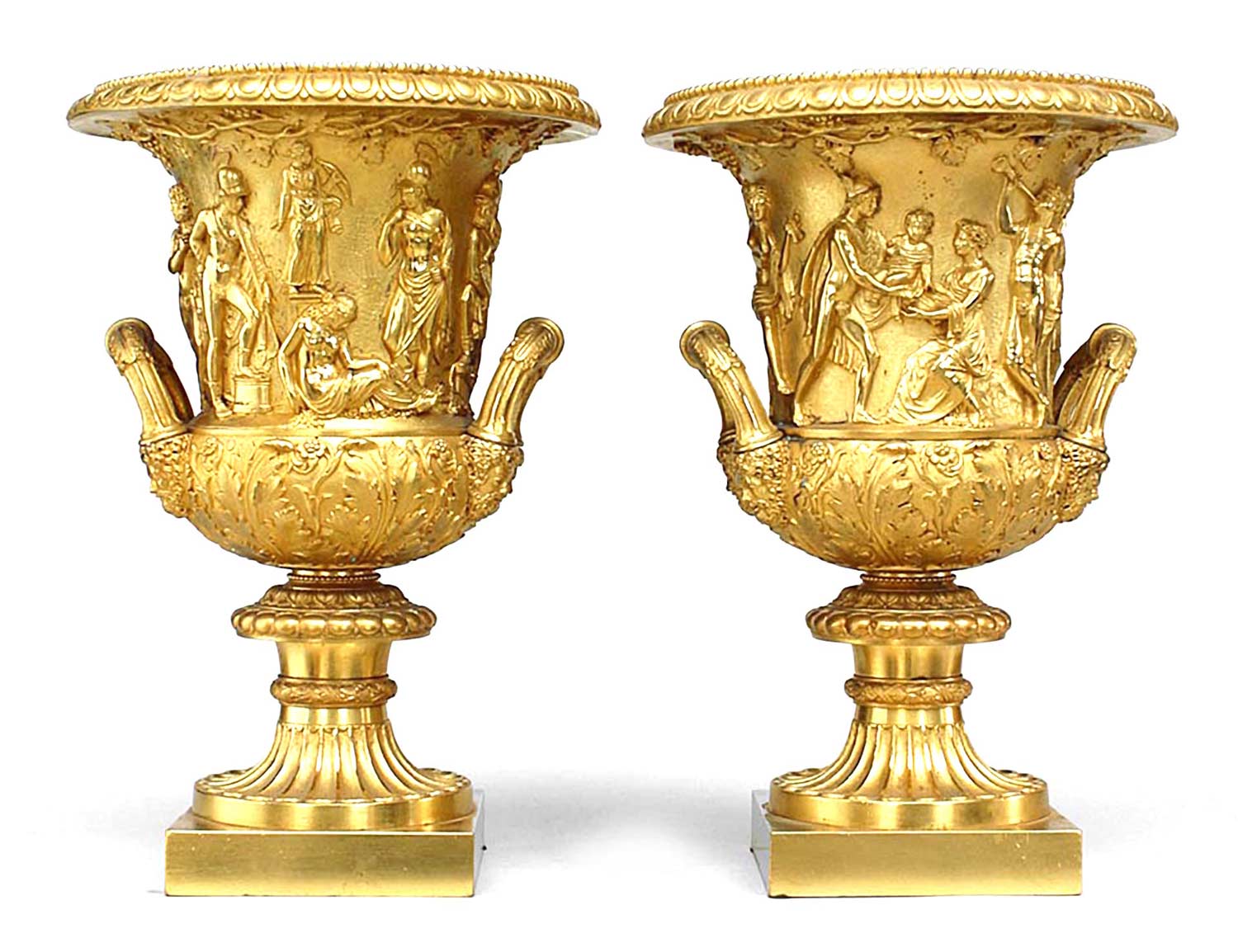 PAIR of Italian Neo-classic style (19th Century) gilt bronze classic urns with handles and figures in relief (models of the Medici vase). (PRICED AS PAIR).