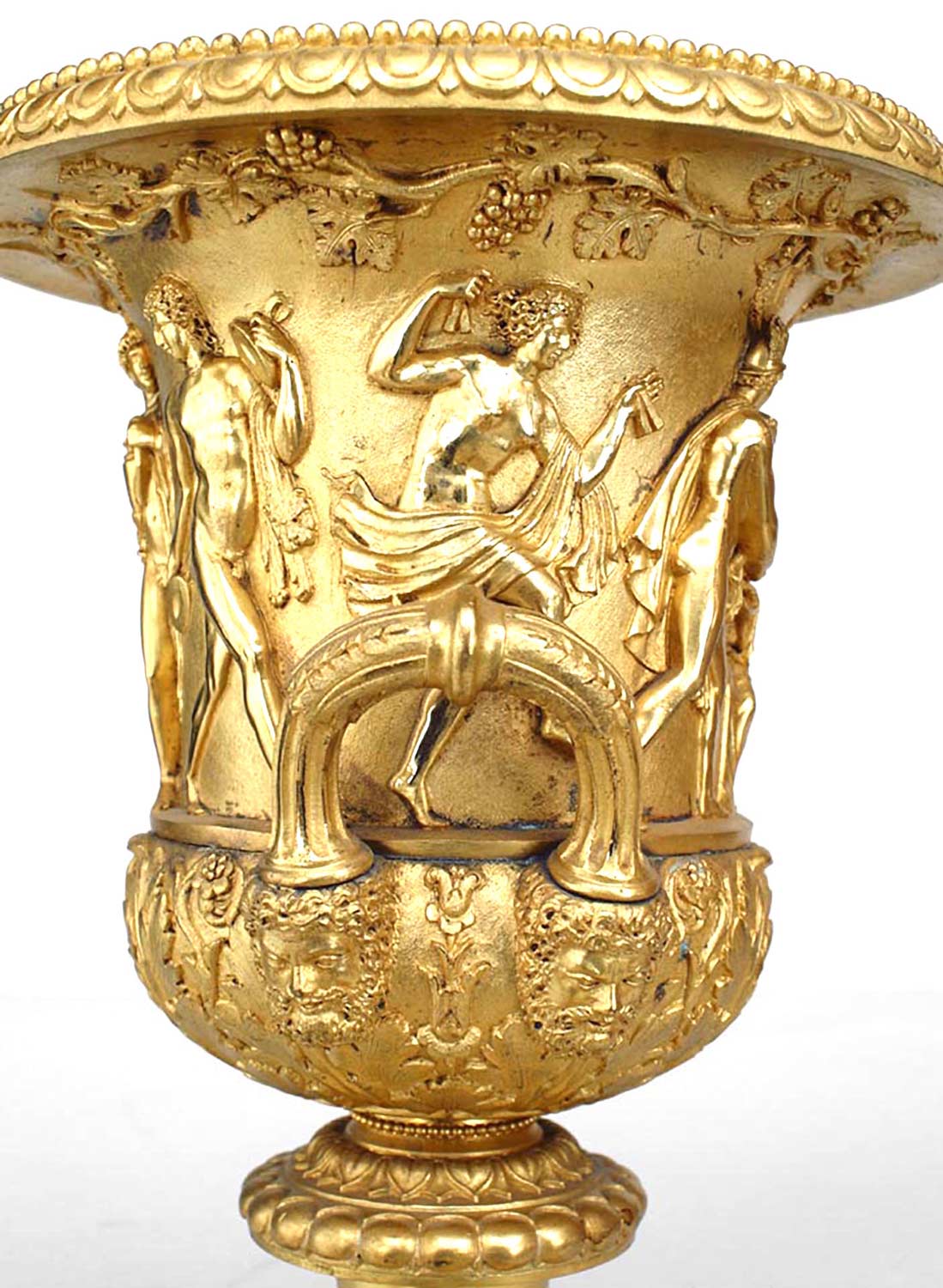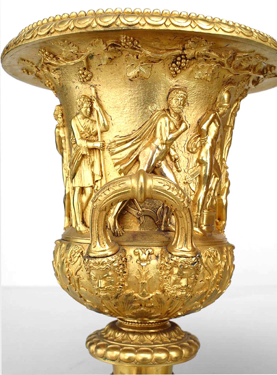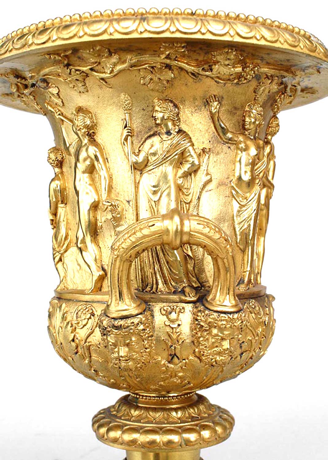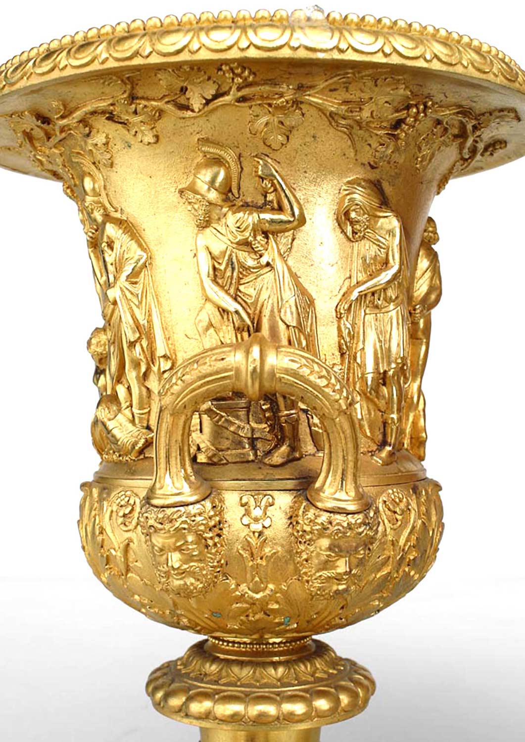 PAIR of Italian Neo-classic style (19th Century) gilt bronze classic urns with handles and figures in relief (models of the Medici vase). (PRICED AS PAIR).