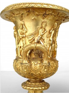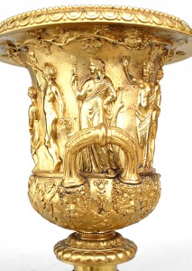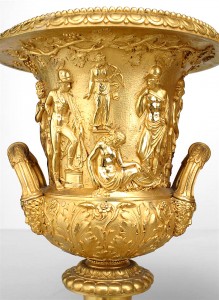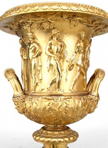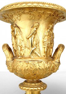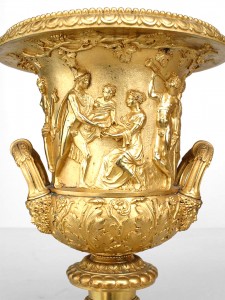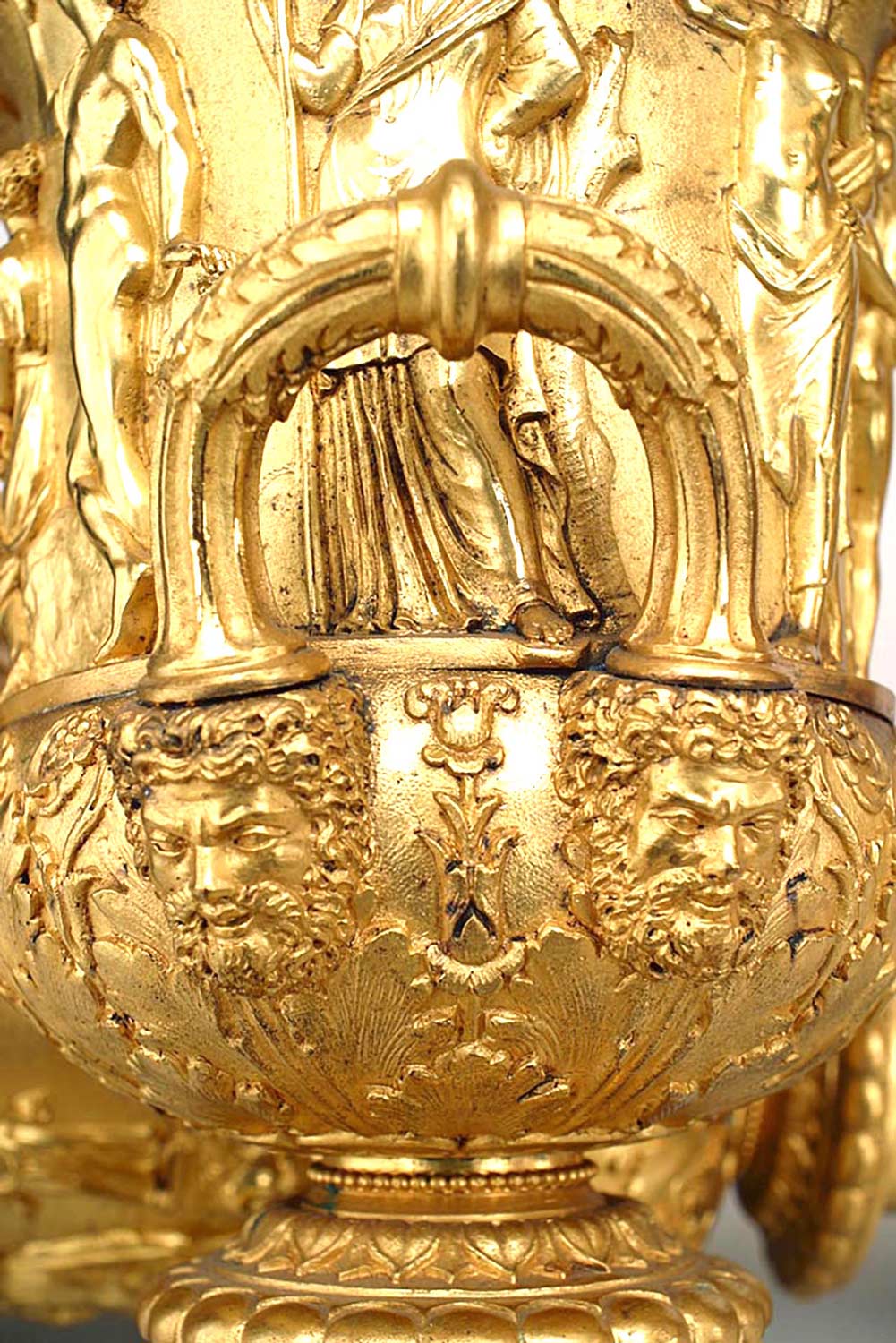 PAIR of Italian Neo-classic style (19th Century) gilt bronze classic urns with handles and figures in relief (models of the Medici vase). (PRICED AS PAIR)