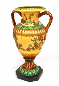 PAIR of Italian Neo-classic style (19/20th Cent) Majolica style glazed yellow & green porcelain floor vases. With large brown handles and floral decoration with grapes in relief on a square blue base. (PRICED AS PAIR).