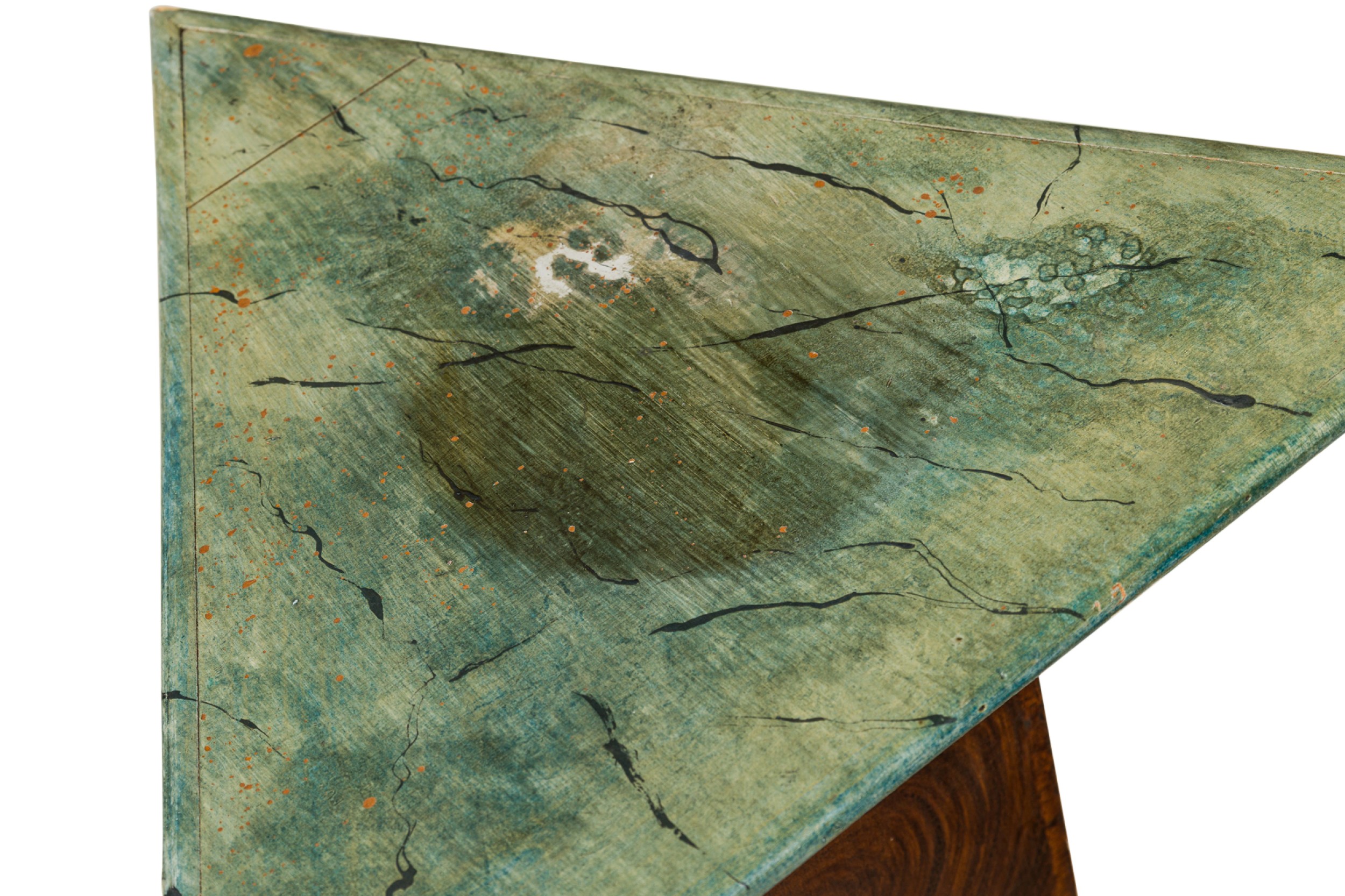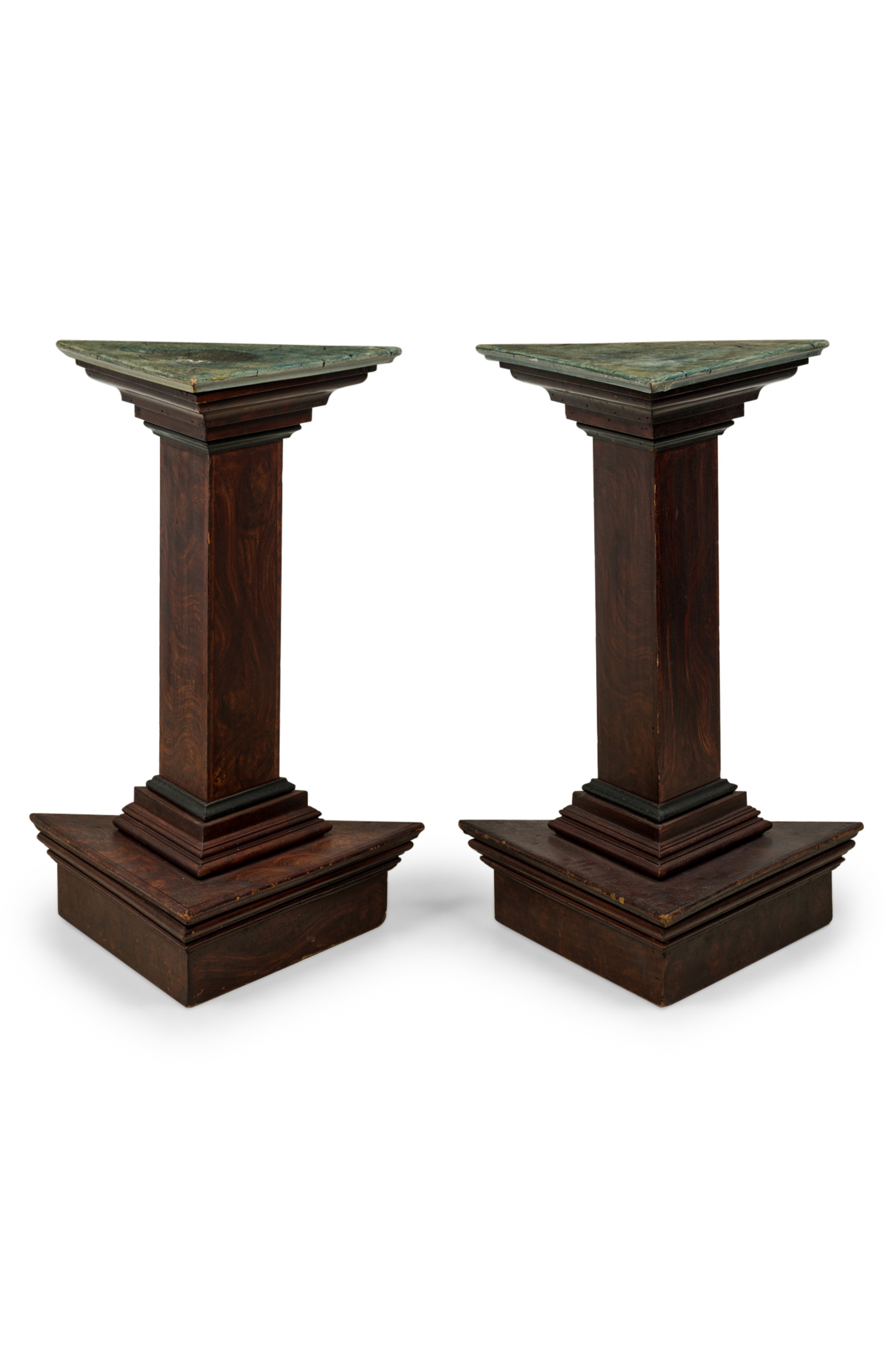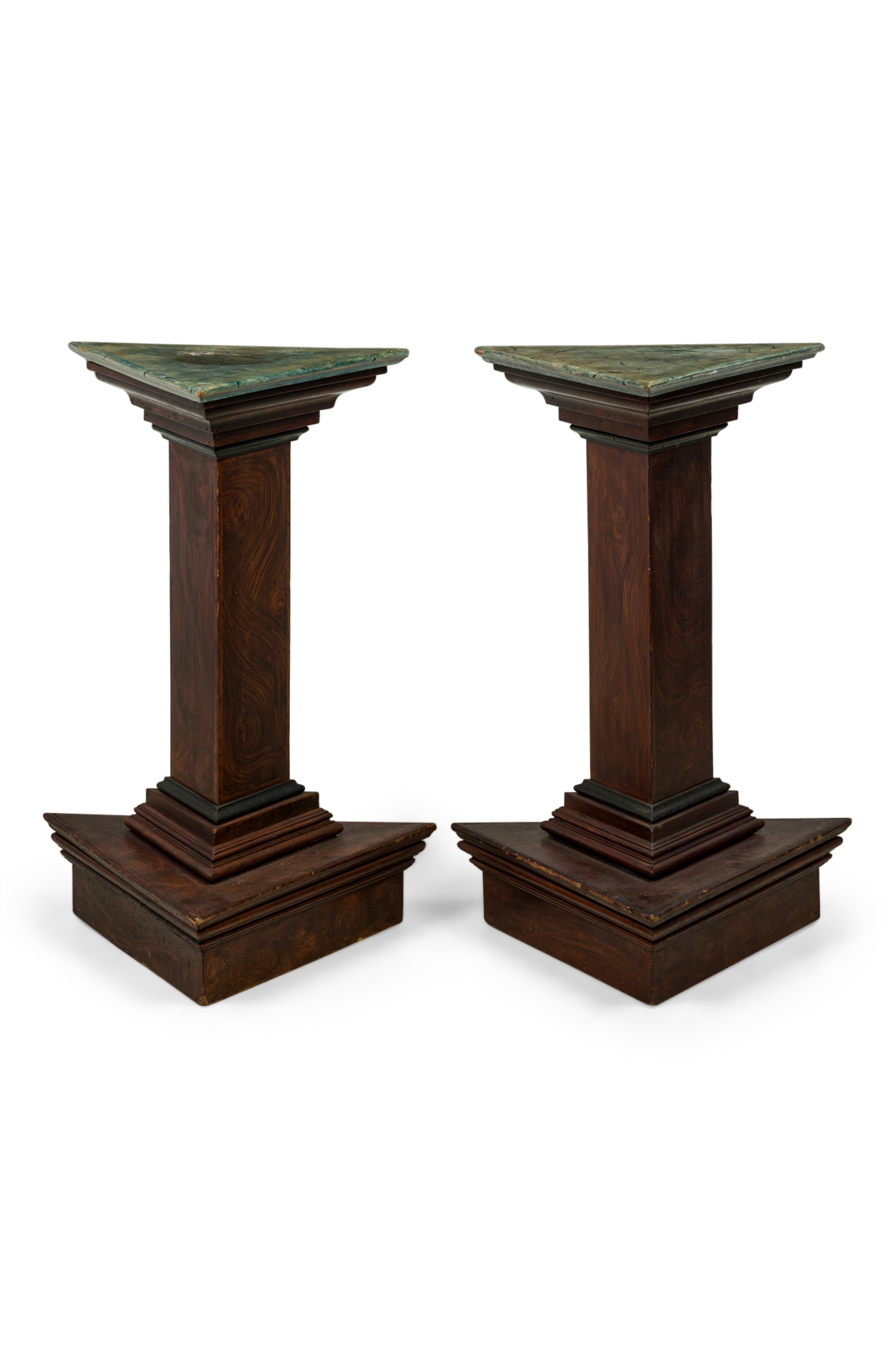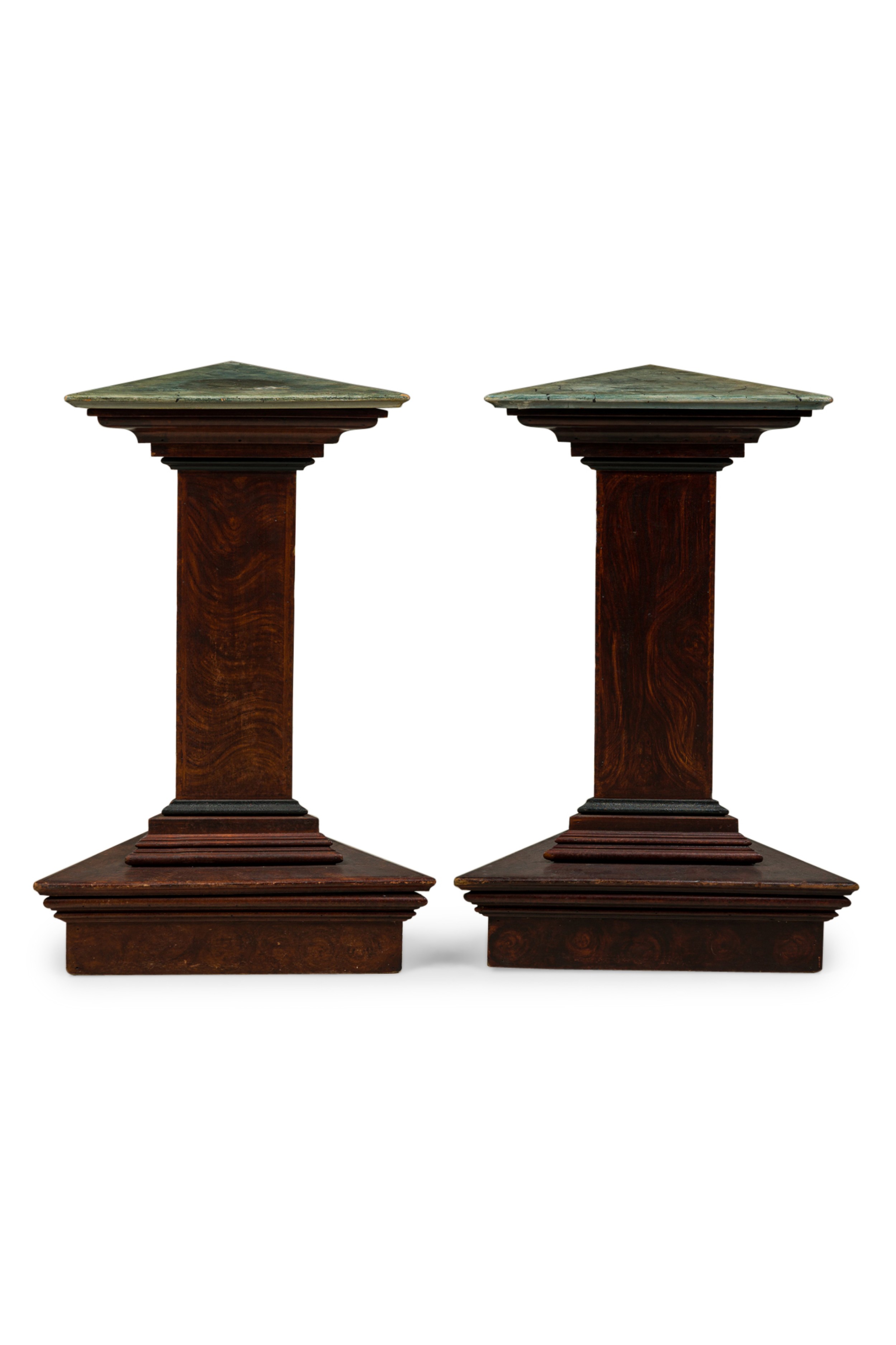 PAIR of Italian Neo-classic style (19/20th Century) dark faux bois (wood) and faux marble painted low pedestals with a triangular shape base and top (PRICED AS PAIR)