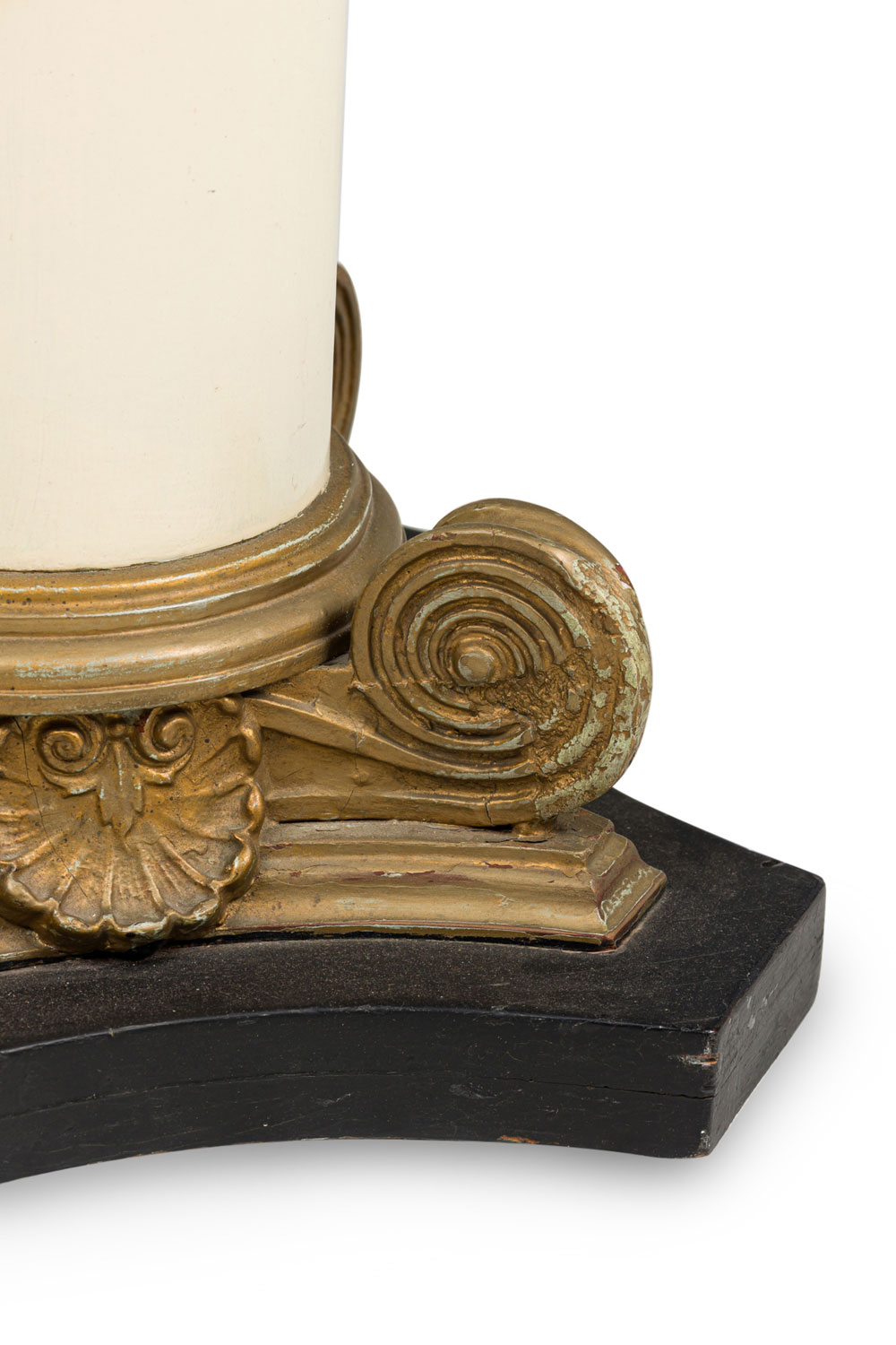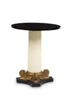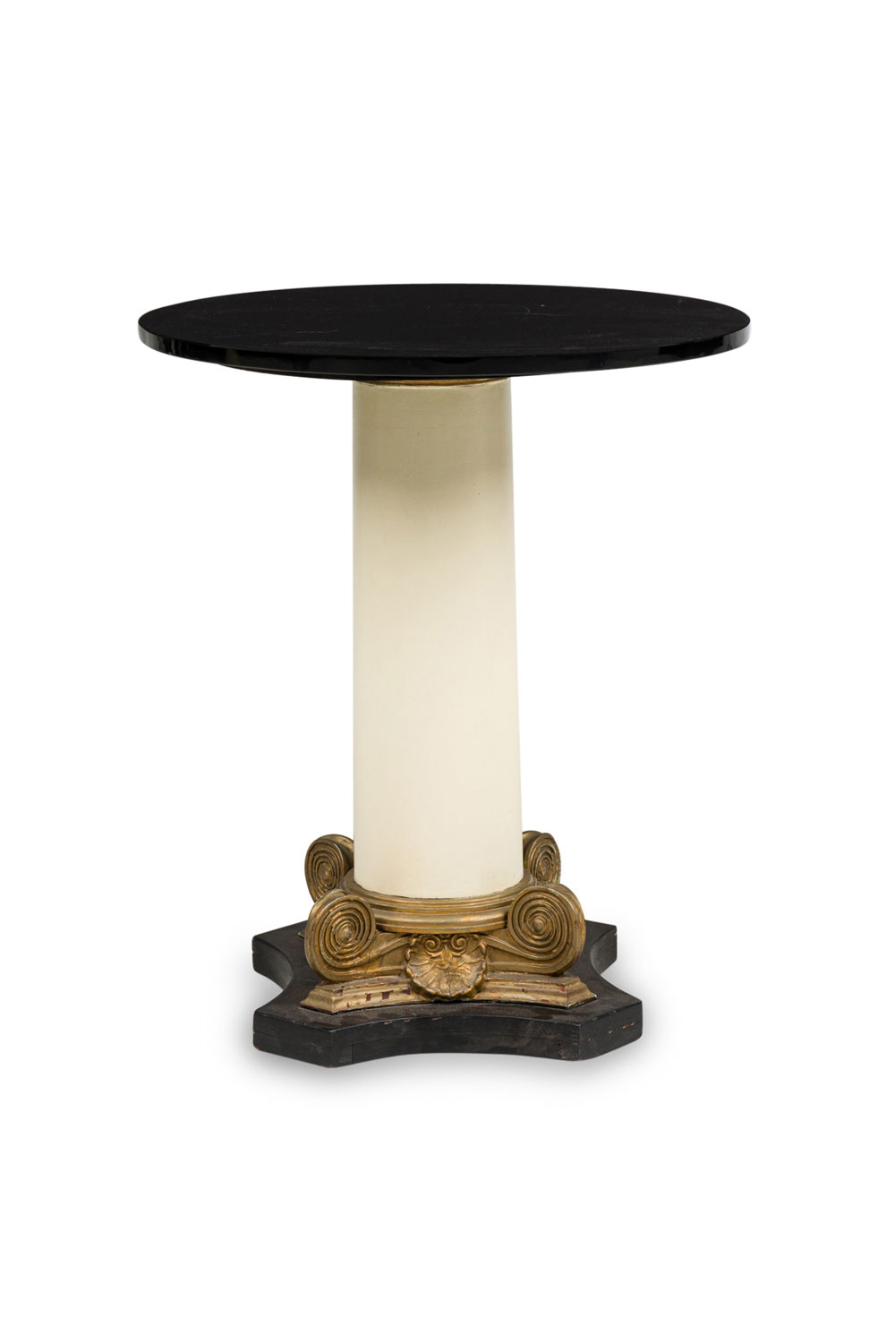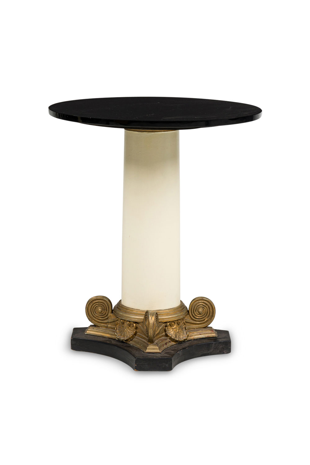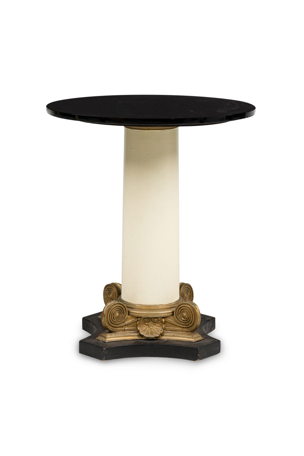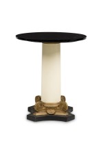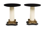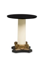 PAIR of Italian Neo-Classic style (20th Century) end tables with a black glass top over a beige pedestal resting on a black trimmed 4 legged base (PRICED AS PAIR).