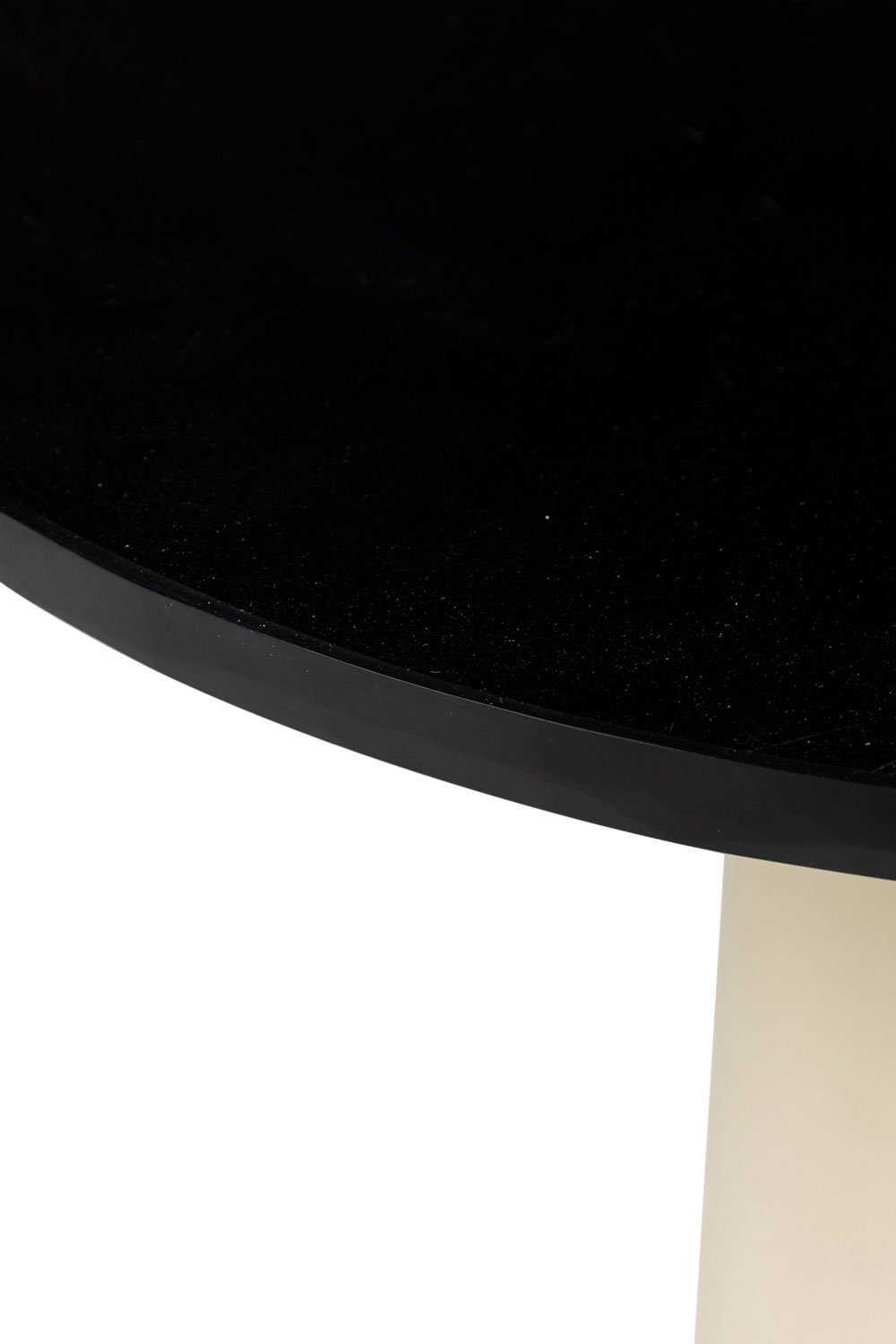 PAIR of Italian Neo-Classic style (20th Century) end tables with a black glass top over a beige pedestal resting on a black trimmed 4 legged base (PRICED AS PAIR)