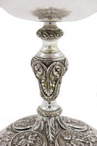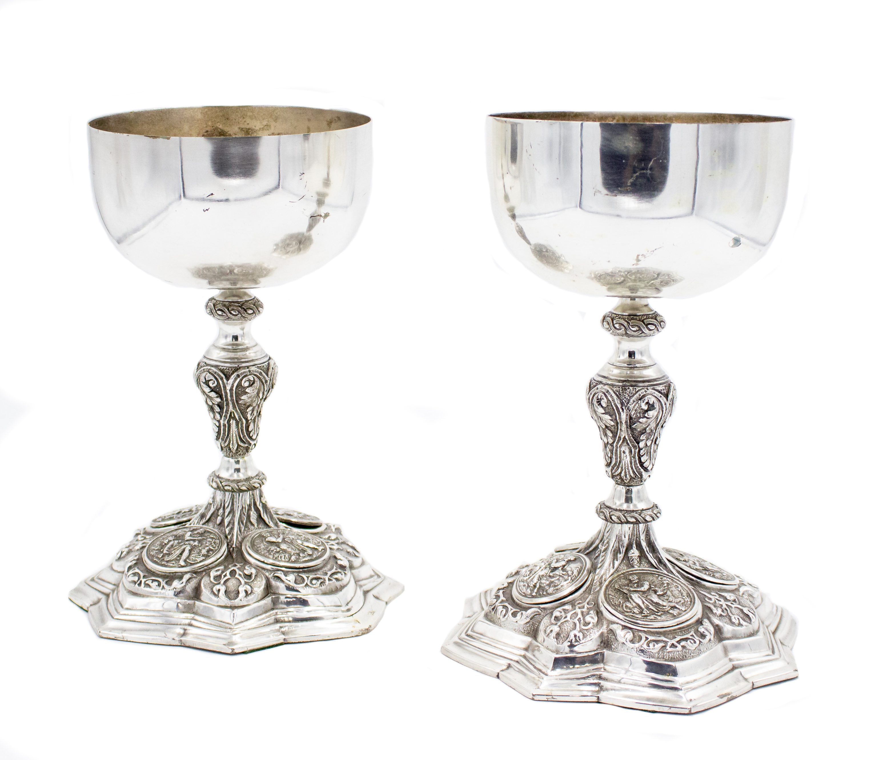PAIR of Italian Renaissance-style (19th Century) silver plate ceremonial chalice cups with 4 medallions on shaped base (PRICED AS PAIR)
