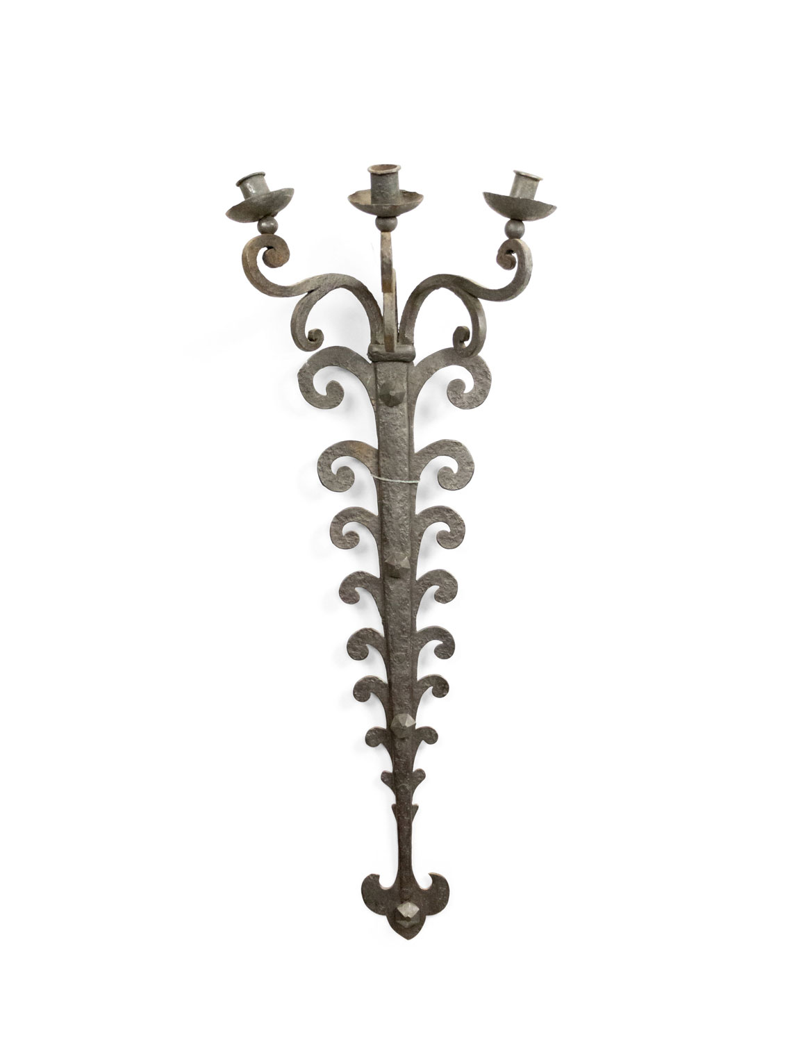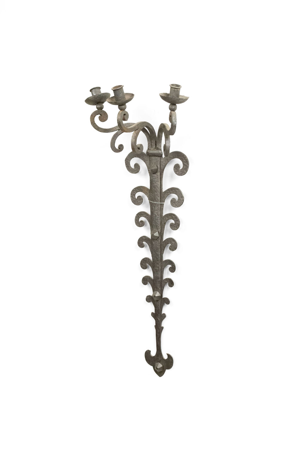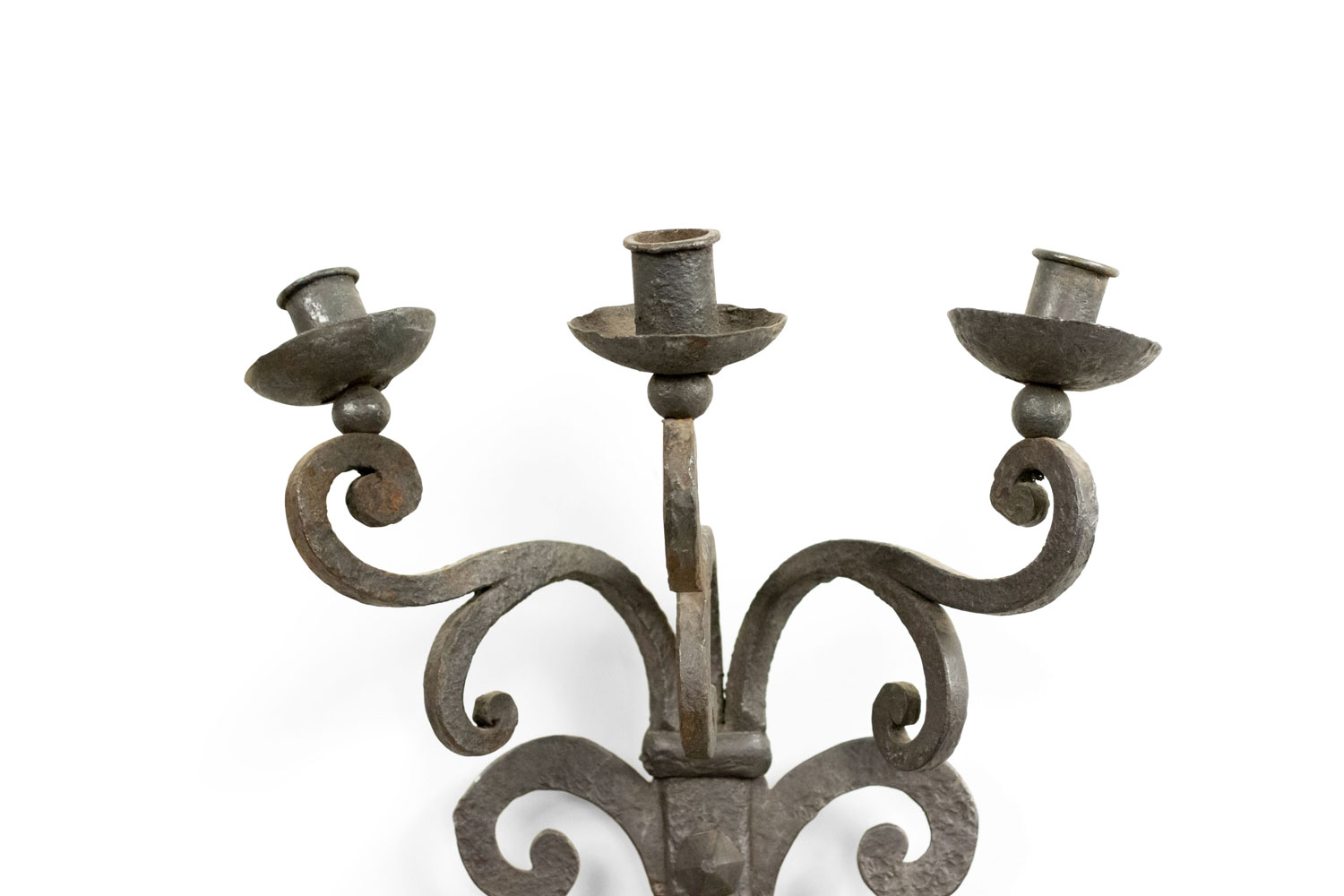 PAIR of Italian Renaissance-Style (20th Century) wrought iron sconces with 3 scroll arms supported by a tapered & tiered scroll design backing. (PRICED AS PAIR)