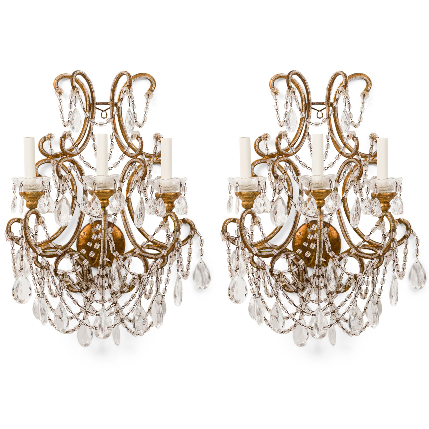 PAIR.. of Italian Venetian style wall sconces with three arms, a gilt metal scroll design, and beaded crystal frame with crystal pendants and swags (PRICED AS PAIR).