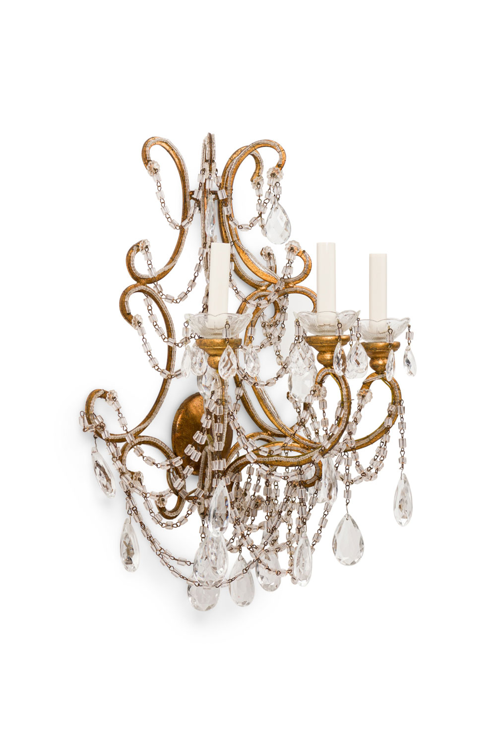 PAIR.. of Italian Venetian style wall sconces with three arms, a gilt metal scroll design, and beaded crystal frame with crystal pendants and swags (PRICED AS PAIR)