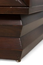 PAIR of American Mid-Century beside tables with a rectangular molding design on the front resting on a pedestal base (PRICED AS PAIR) (JAMES MONT).