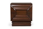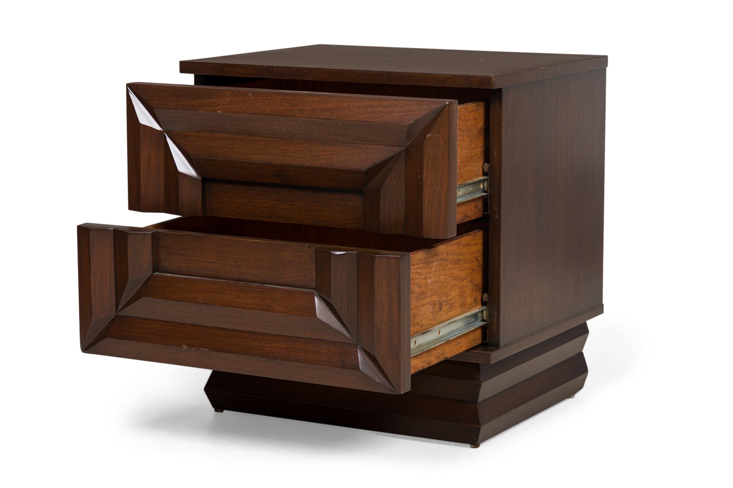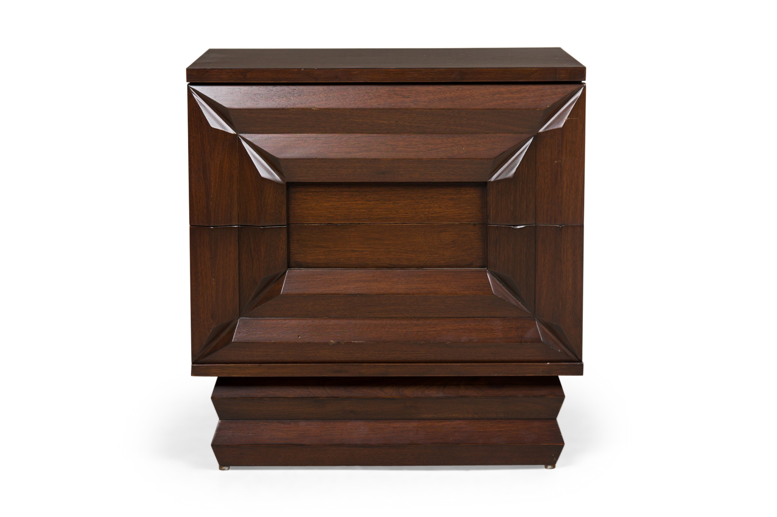 PAIR of American Mid-Century beside tables with a rectangular molding design on the front resting on a pedestal base (PRICED AS PAIR) (JAMES MONT)