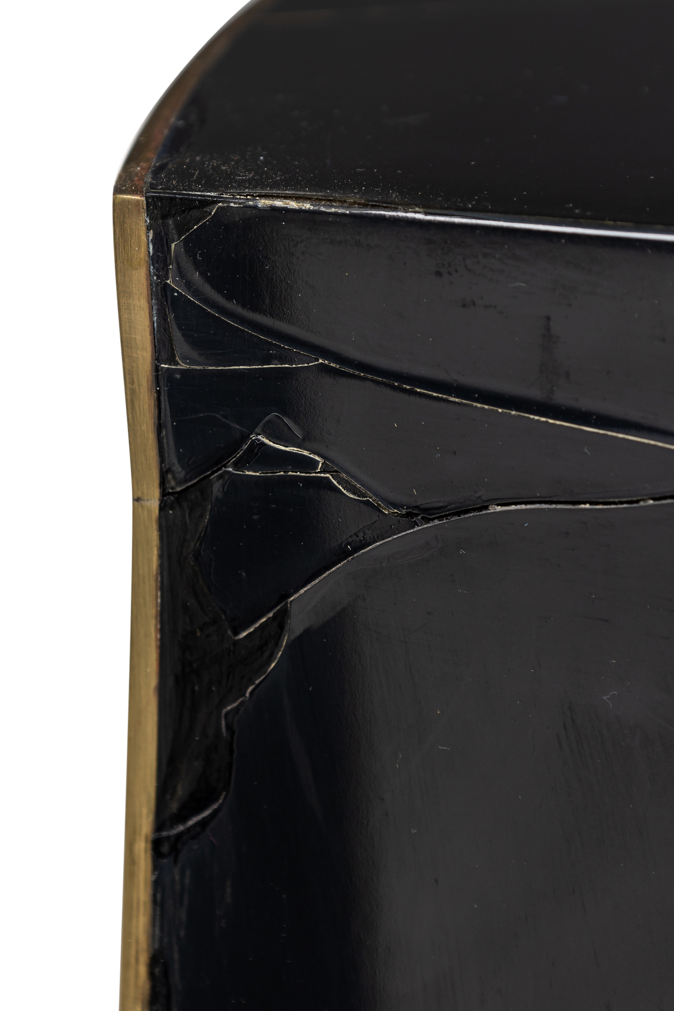 PAIR of American Modern bracket form end / side tables with a dark blue lacquered finish and decorative geometric bone inlay. (Att: KARL SPRINGER)(PRICED AS PAIR).