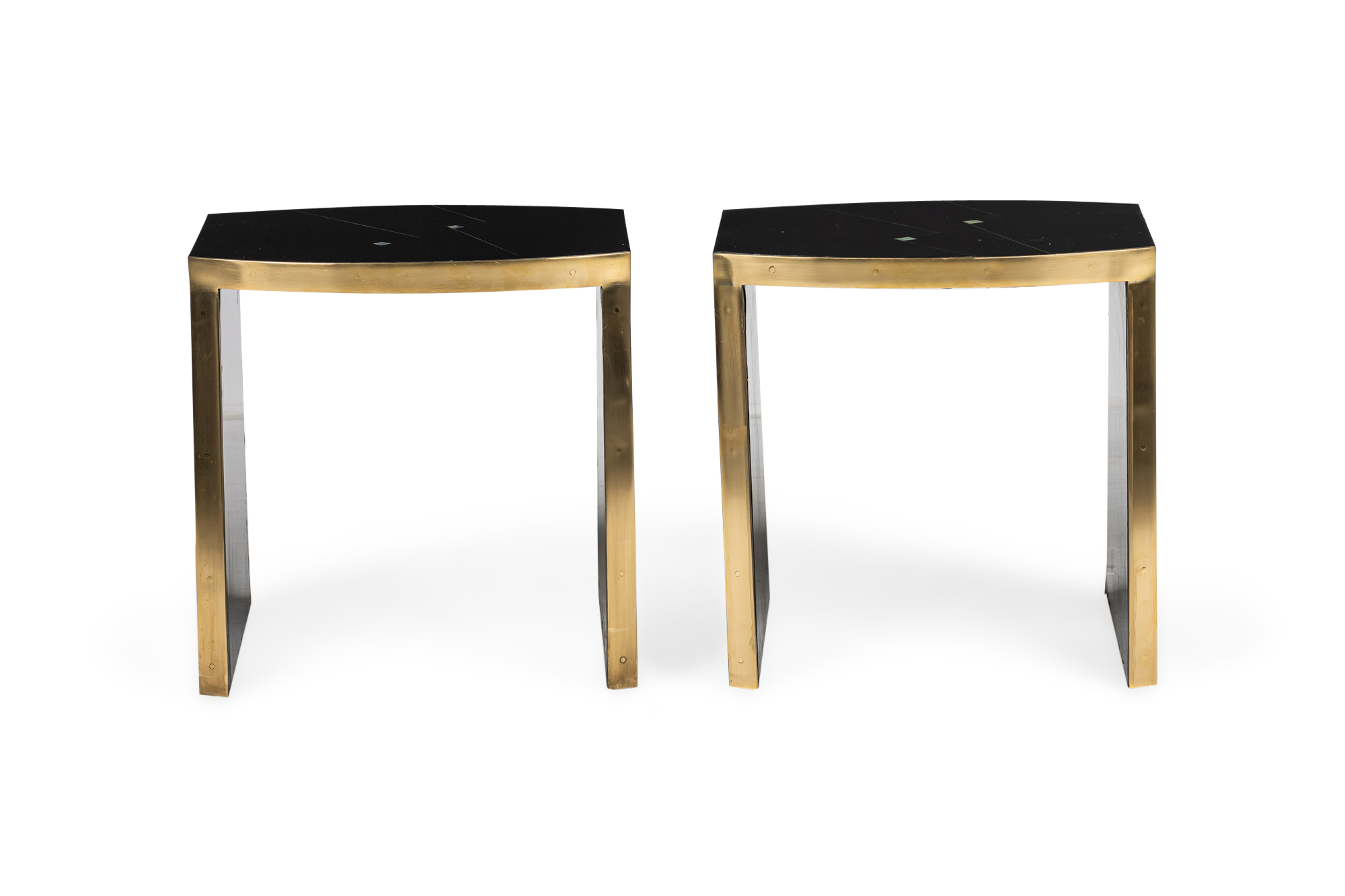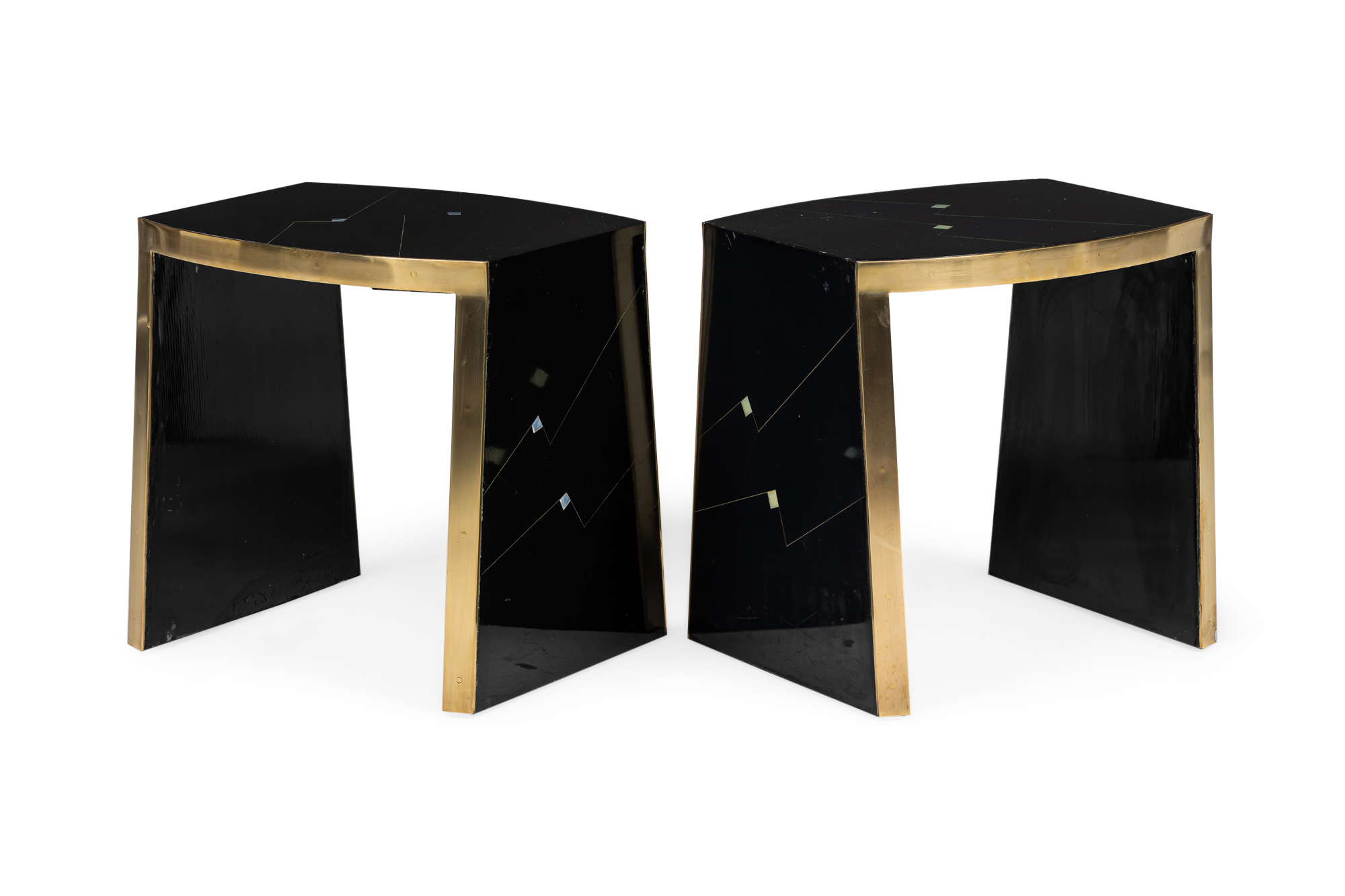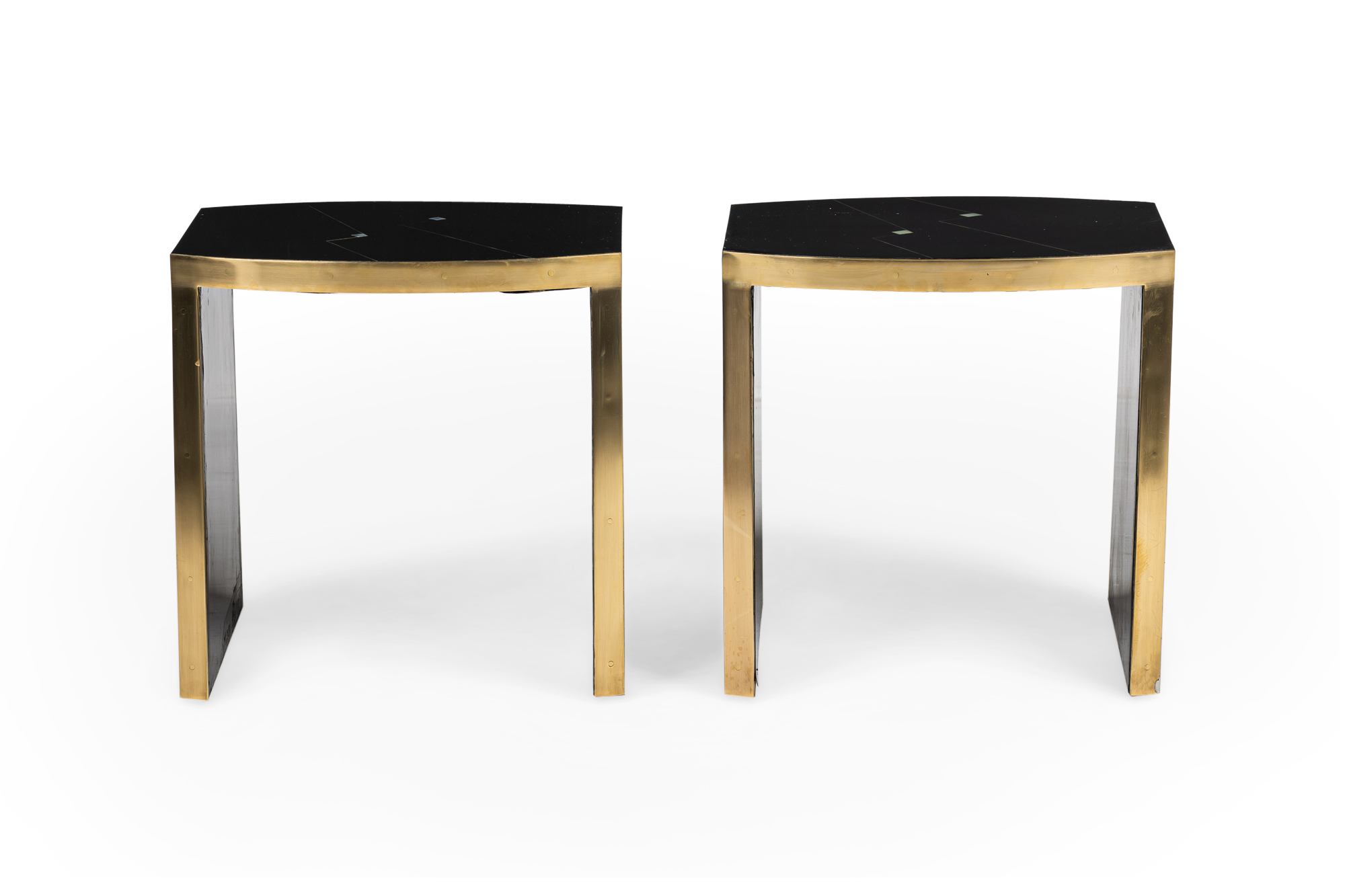PAIR of American Modern bracket form end / side tables with a dark blue lacquered finish and decorative geometric bone inlay. (Att: KARL SPRINGER)(PRICED AS PAIR)