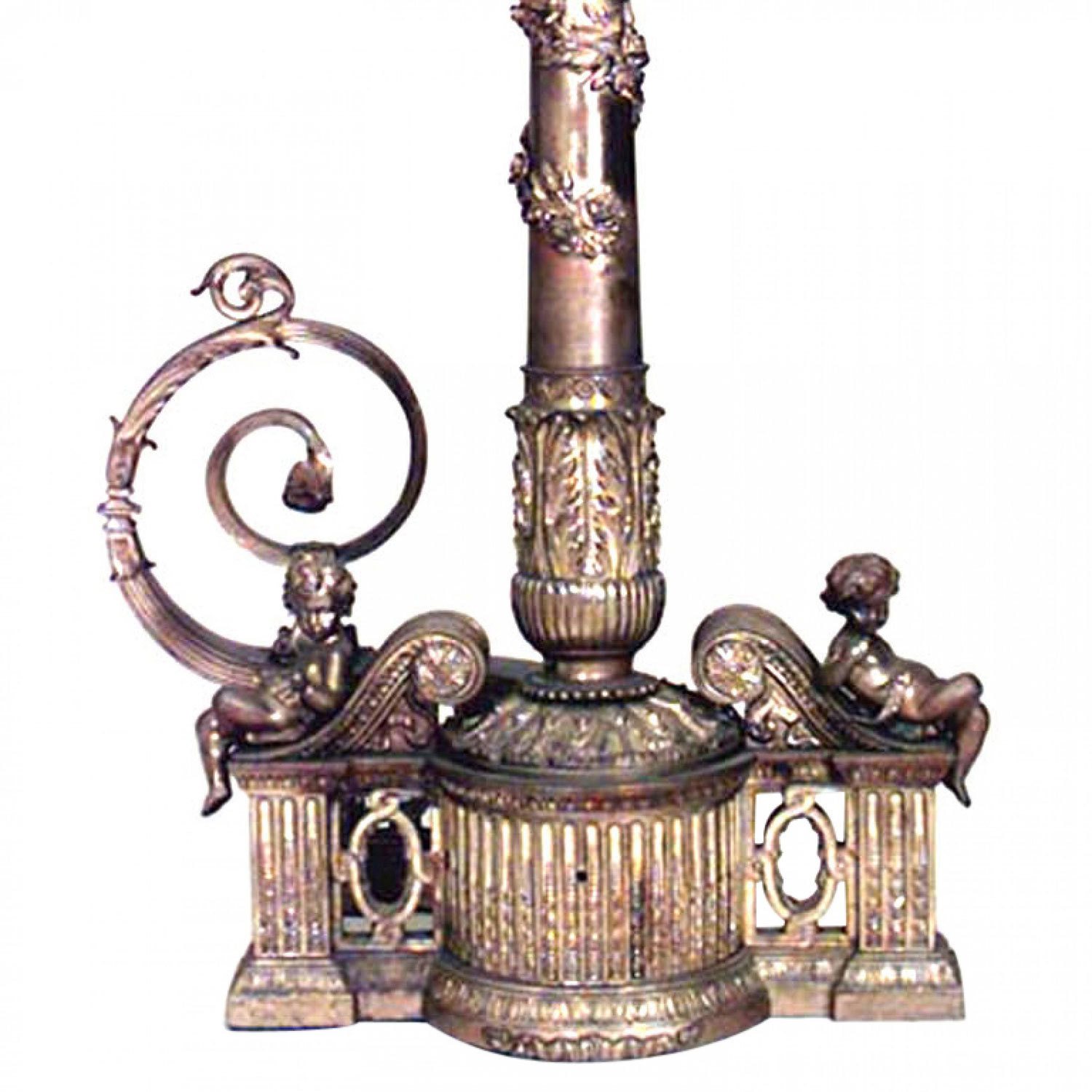 PAIR of French Louis XVI-style (19th Century) bronze dore andirons with fluted design and cupids on base with scroll back. (PRICED AS PAIR)