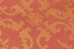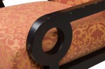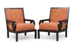PAIR of Mid-Century English style oversized club / armchairs with dark finished walnut frames with square backs and armrests with circular cutouts, upholstered in a rust orange and gold patterned damask fabric. (MAITLAND-SMITH) (PRICED AS PAIR).