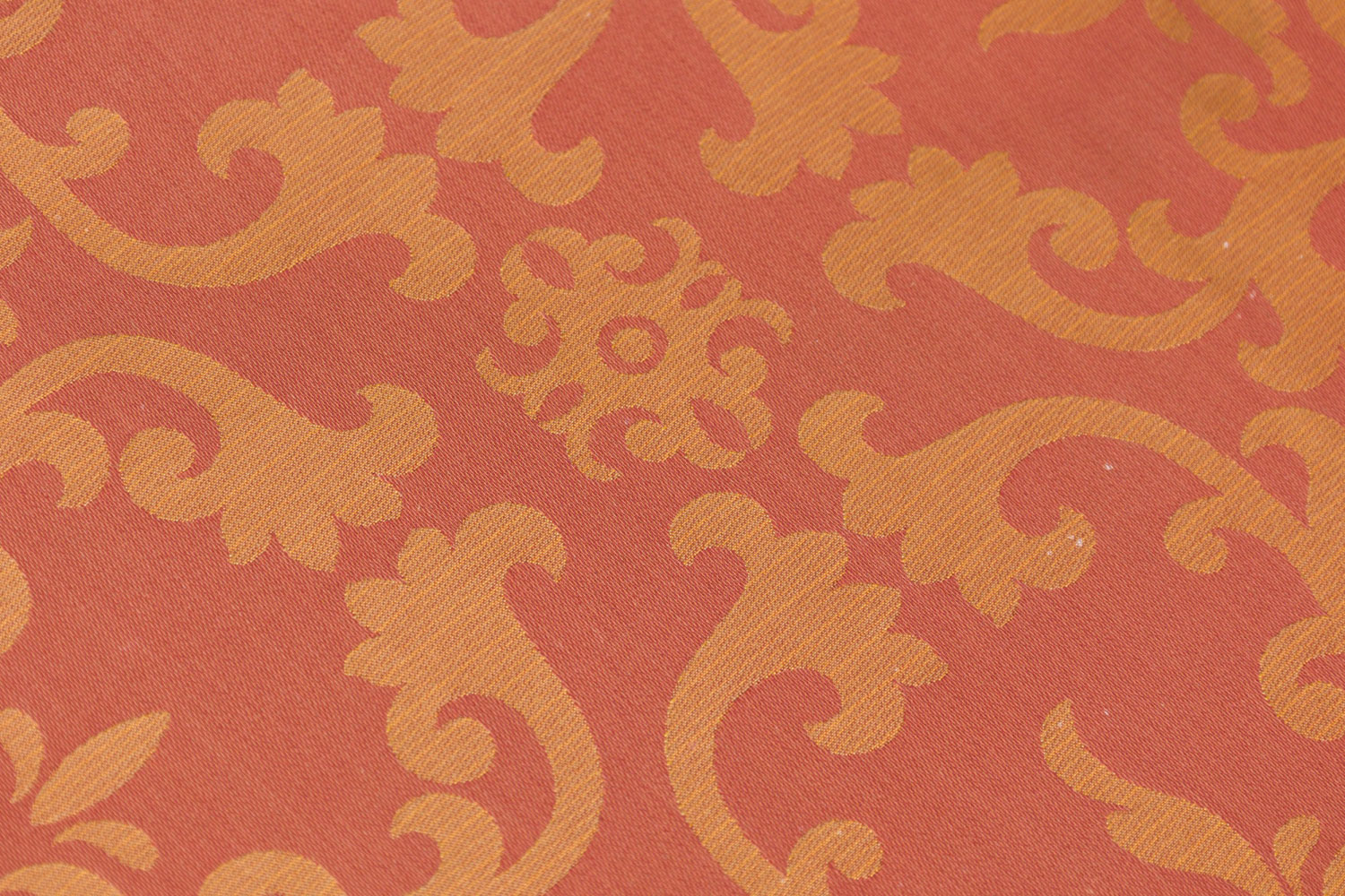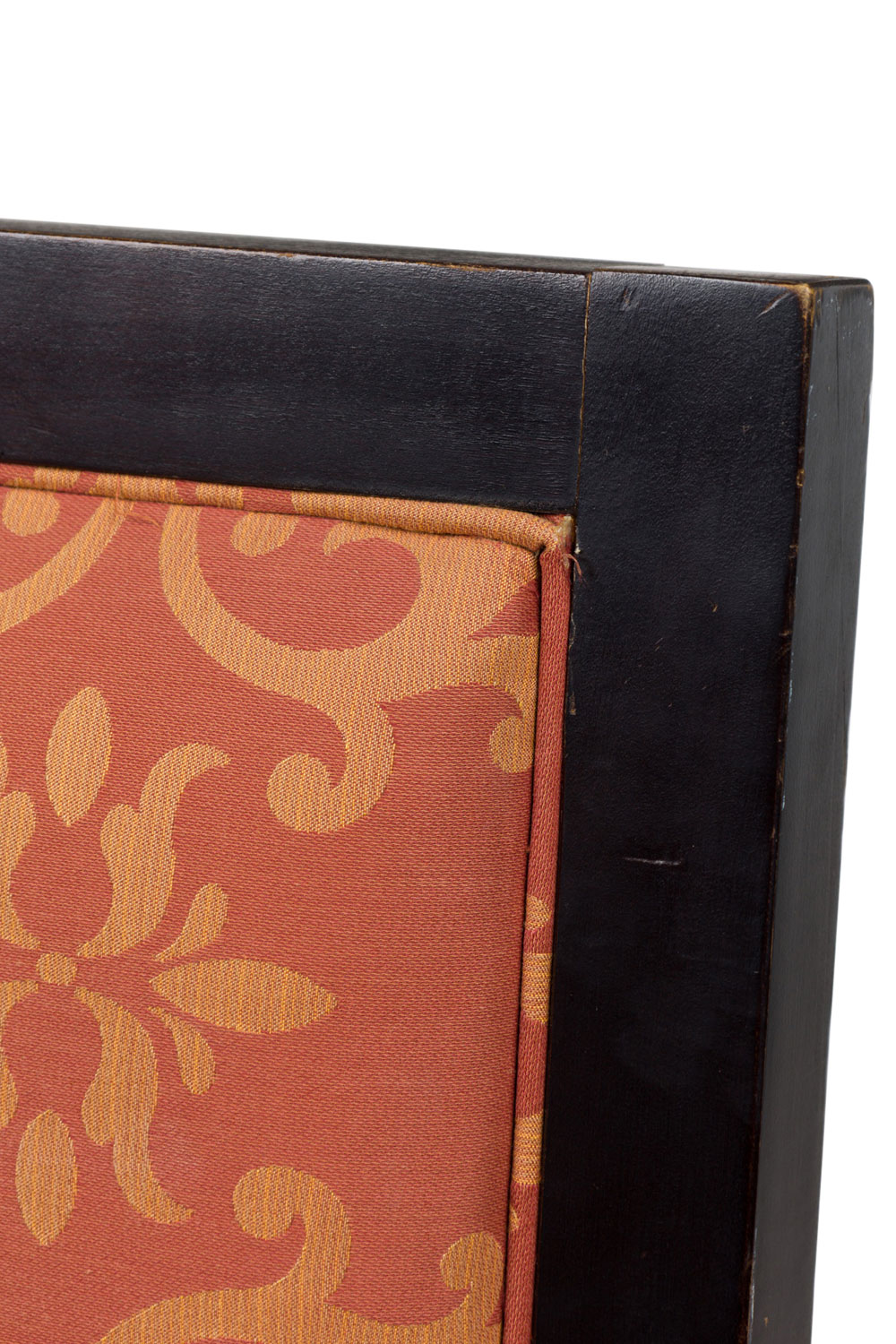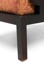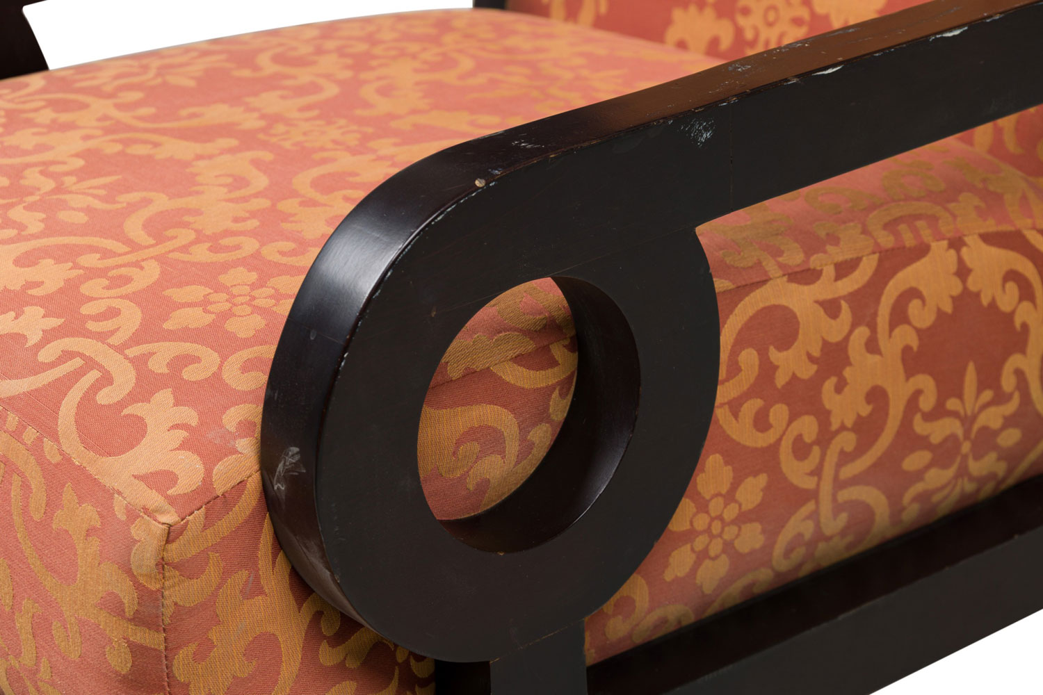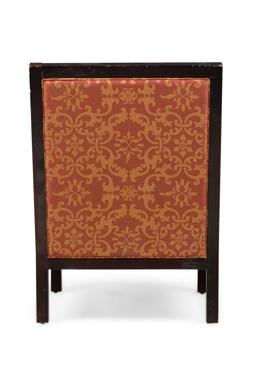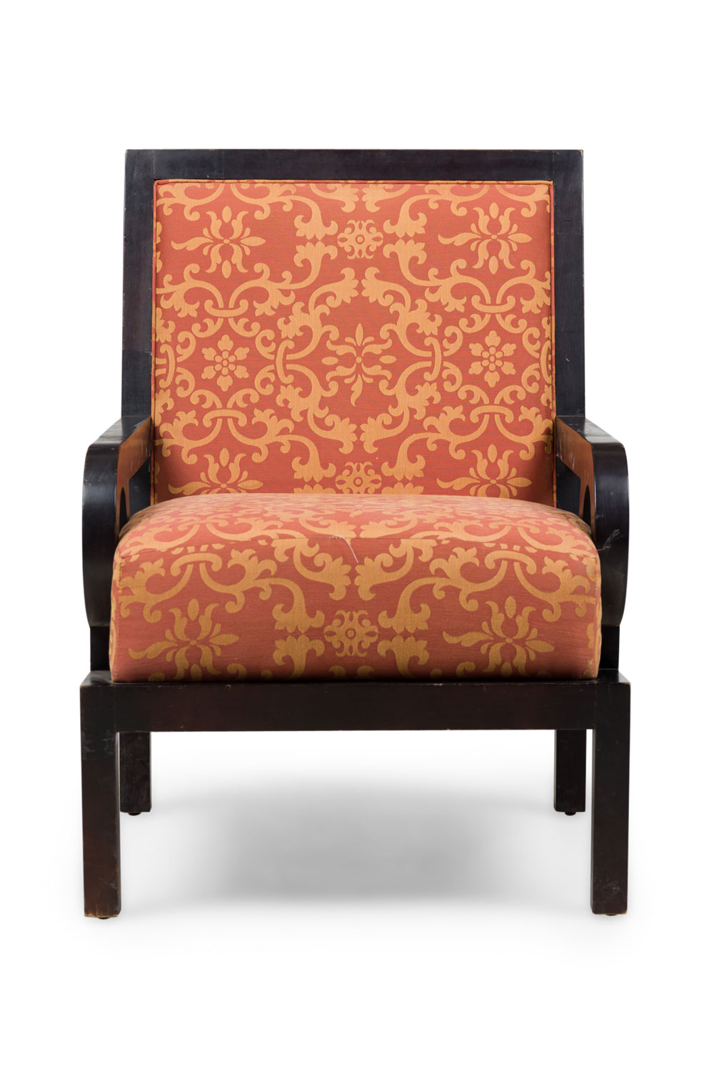 PAIR of Mid-Century English style oversized club / armchairs with dark finished walnut frames with square backs and armrests with circular cutouts, upholstered in a rust orange and gold patterned damask fabric. (MAITLAND-SMITH) (PRICED AS PAIR)