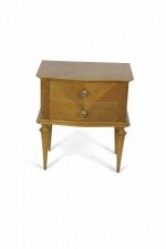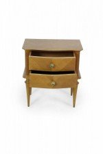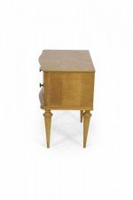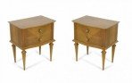 PAIR of French Mid-Century (1940s) maple two-drawer bedside commodes with parquetry pattern veneer, bronze drawer pulls and trim supported on fluted tapered legs. (PRICED AS PAIR)