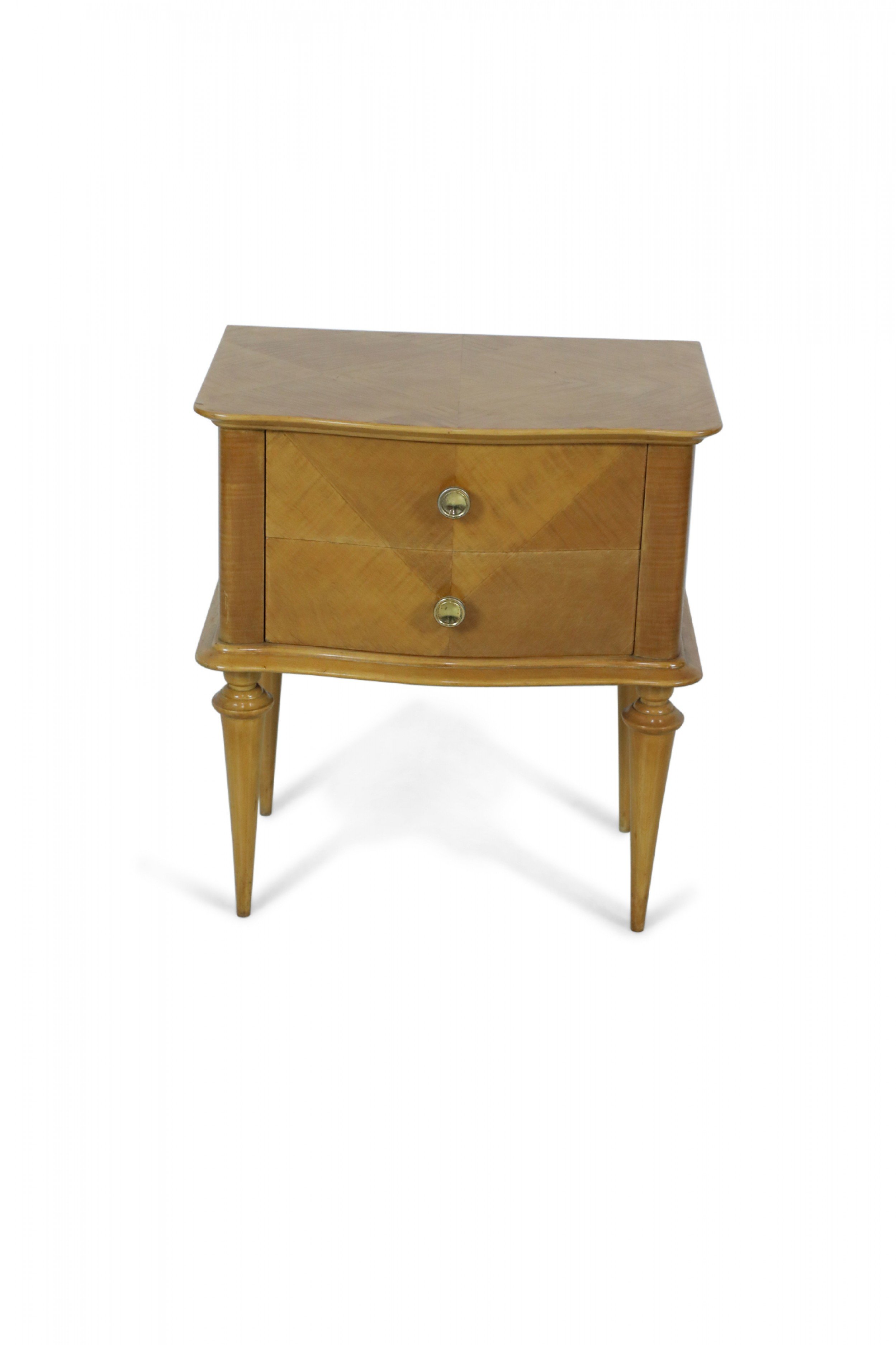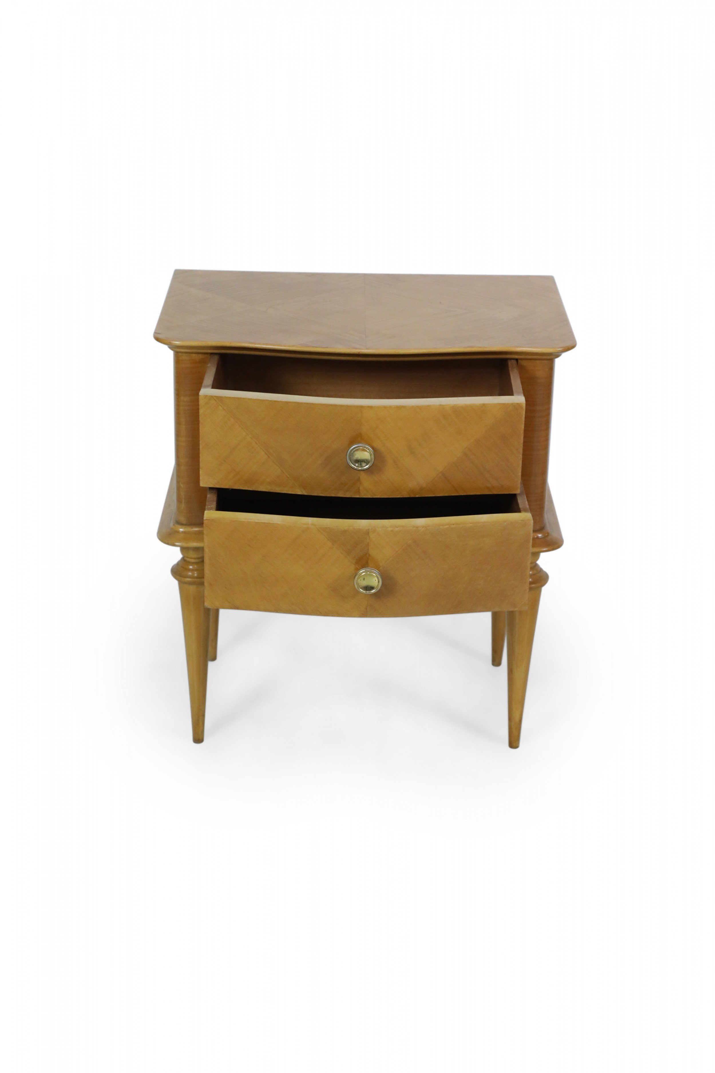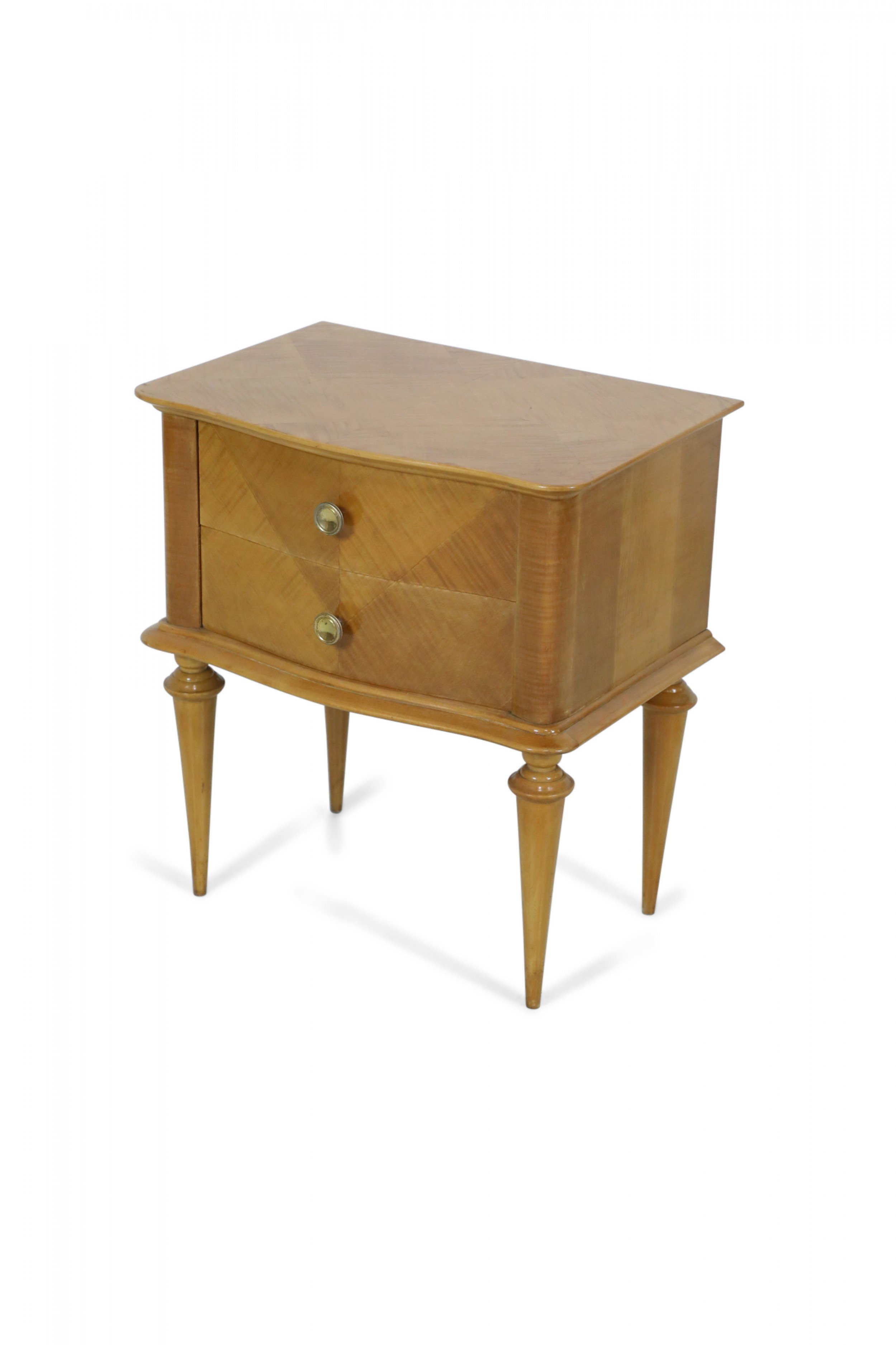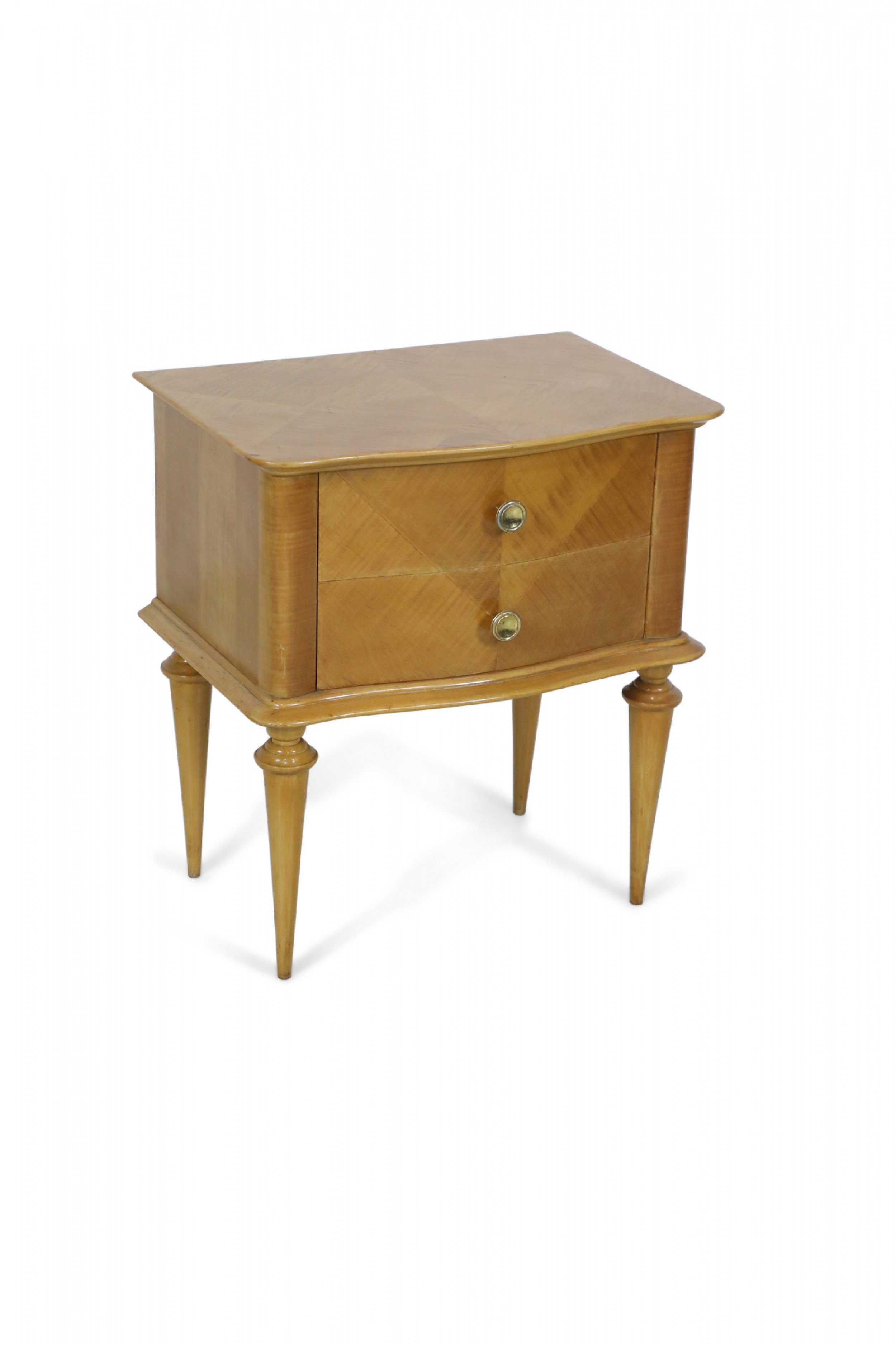 PAIR of French Mid-Century (1940s) maple two-drawer bedside commodes with parquetry pattern veneer, bronze drawer pulls and trim supported on fluted tapered legs. (PRICED AS PAIR).