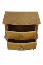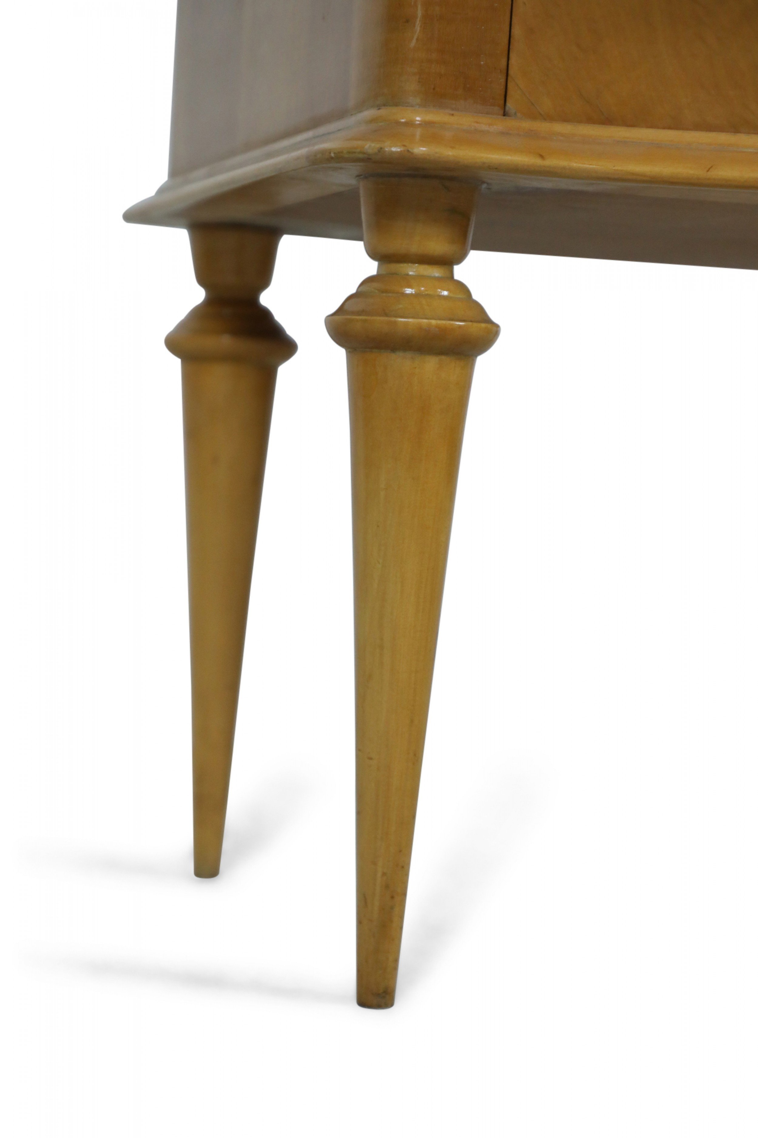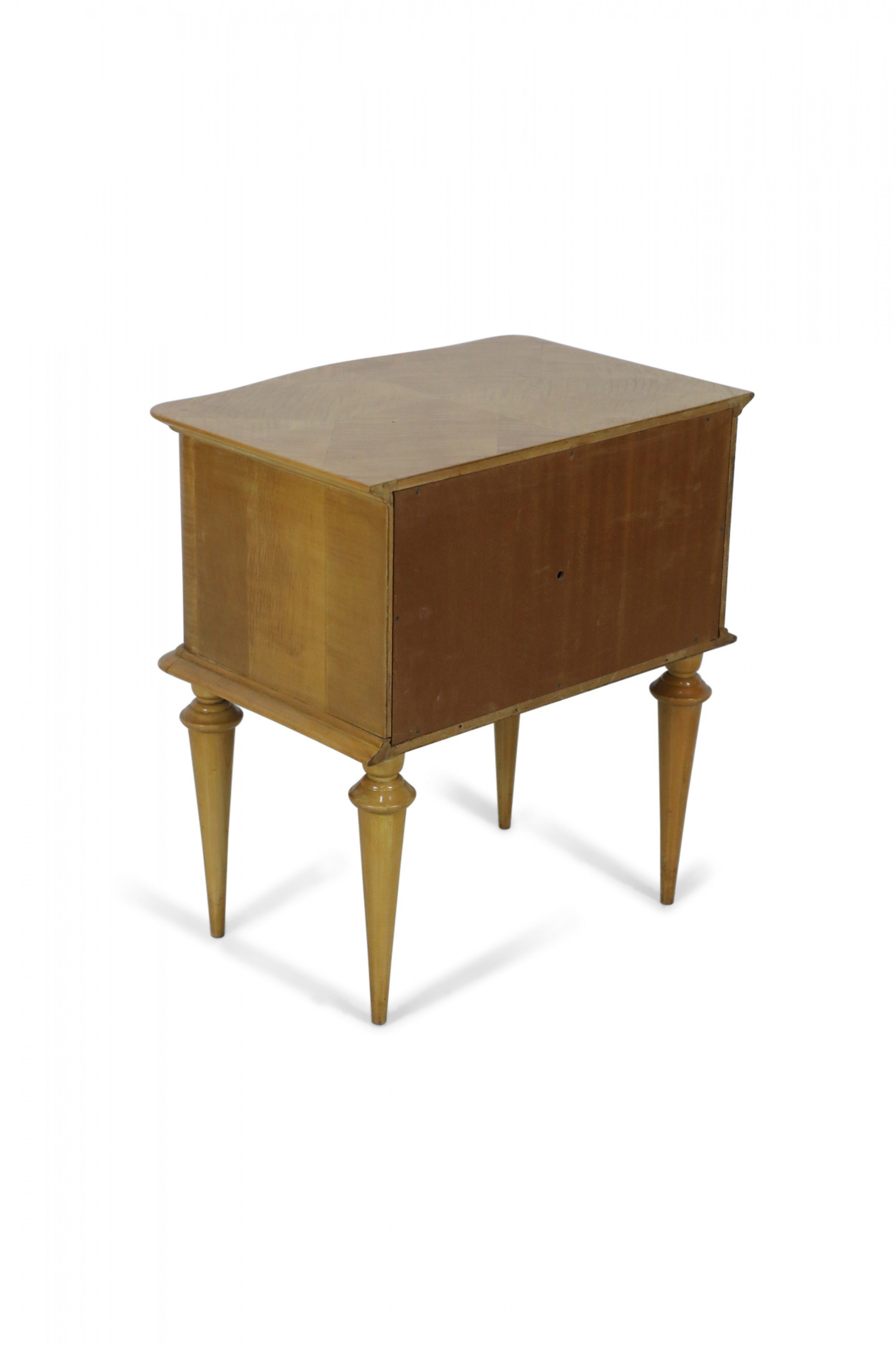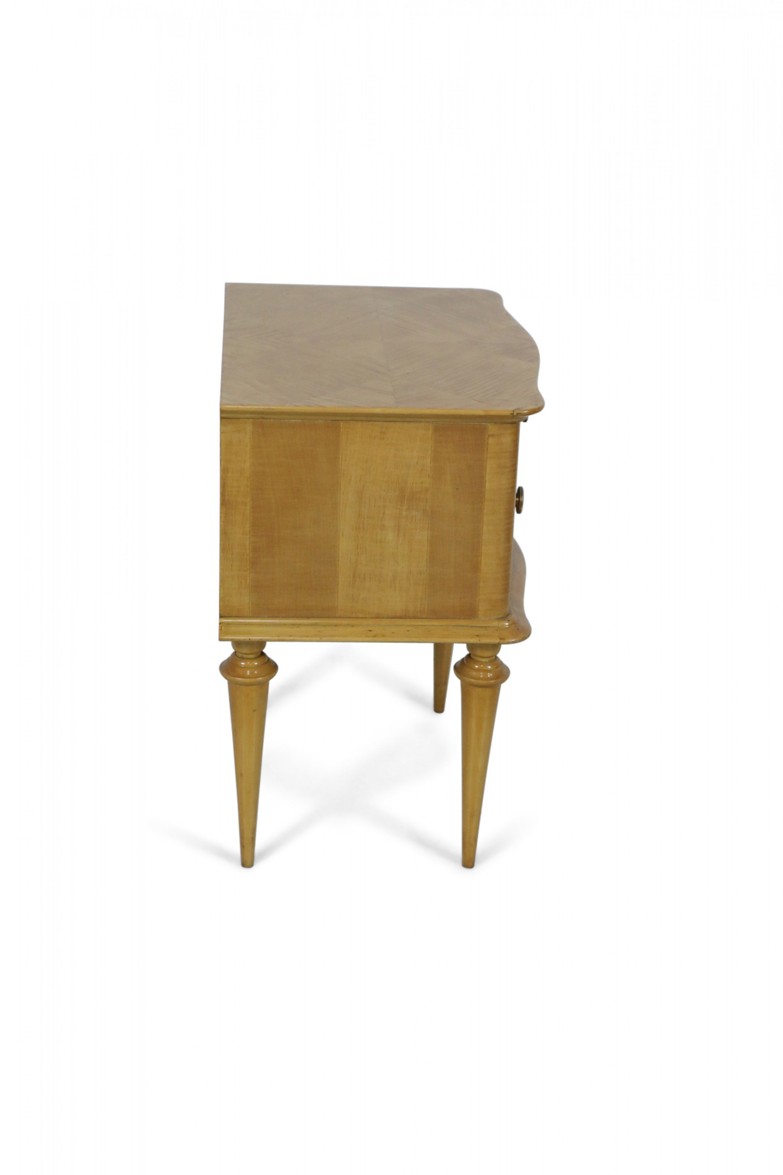 PAIR of French Mid-Century (1940s) maple two-drawer bedside commodes with parquetry pattern veneer, bronze drawer pulls and trim supported on fluted tapered legs. (PRICED AS PAIR).