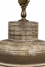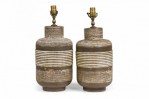 PAIR of Mid-Century American ceramic table lamps in textured banded barrel form with flattened rounded shoulders tapering toward cylindrical necks which house brass spindle stems, both with functioning light switch sockets, the bodies accented by a smooth beige glaze, resting on tapered cylindrical feet. (PRICED AS PAIR)
