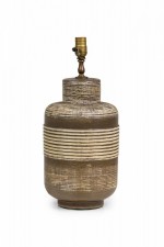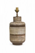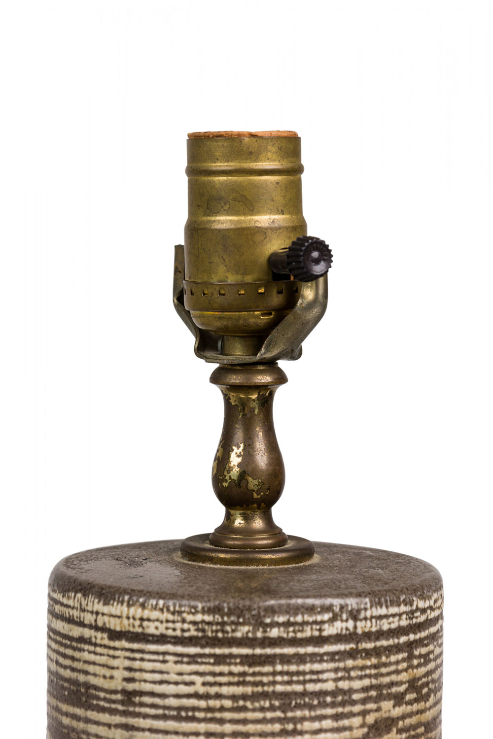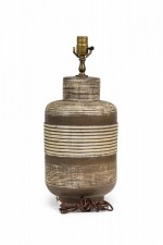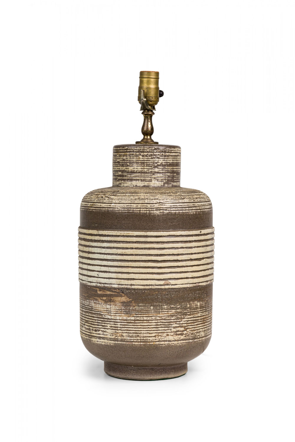 PAIR of Mid-Century American ceramic table lamps in textured banded barrel form with flattened rounded shoulders tapering toward cylindrical necks which house brass spindle stems, both with functioning light switch sockets, the bodies accented by a smooth beige glaze, resting on tapered cylindrical feet. (PRICED AS PAIR).