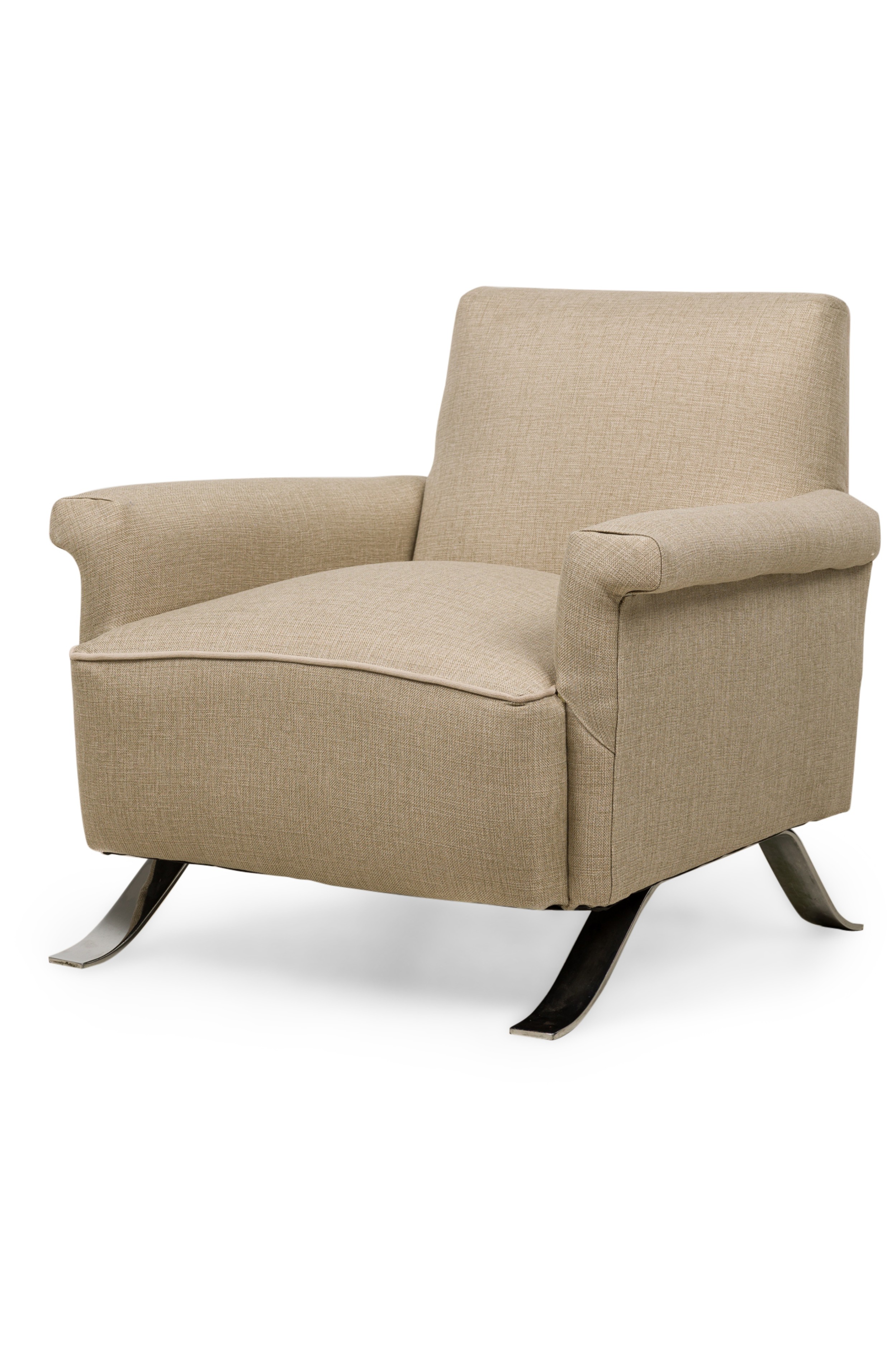 PAIR of Mid-Century American (circa 1970) chrome lounge / armchairs with low back, curled arms and upholstered in a fine beige weave fabric, resting on 4 splayed, concave legs. (PRICED AS PAIR).