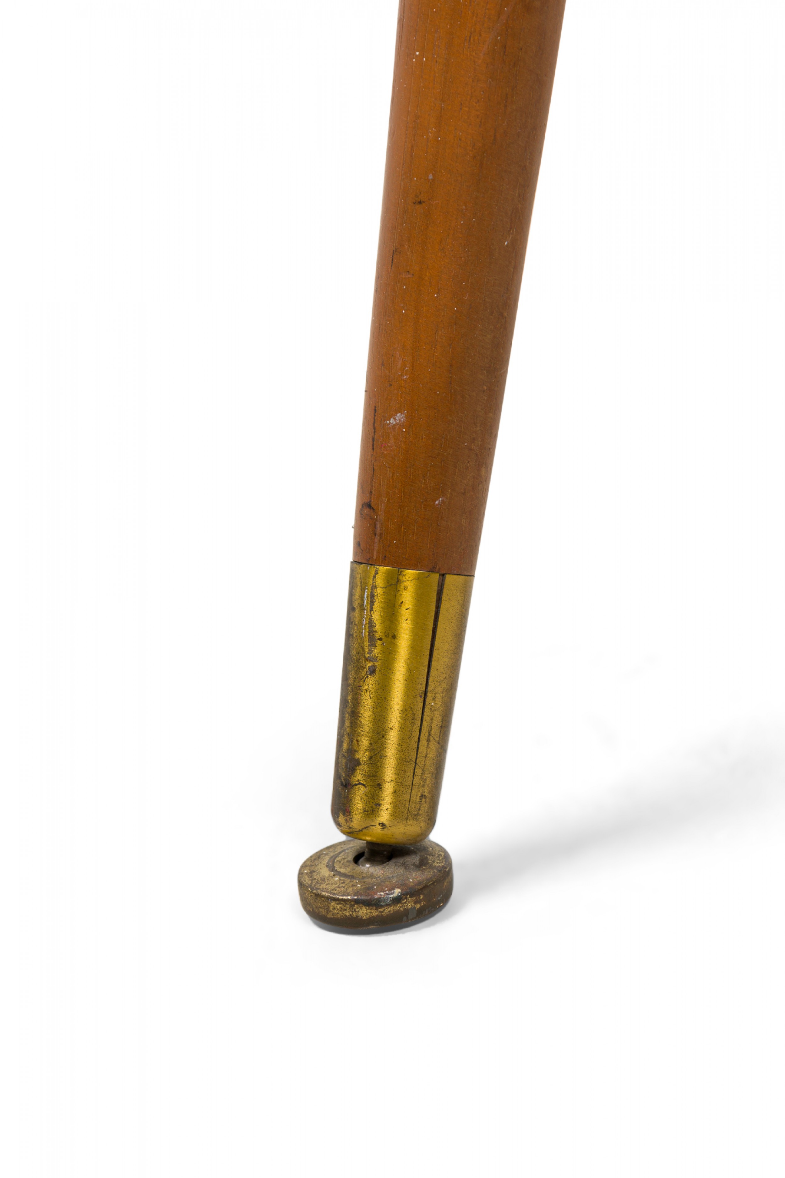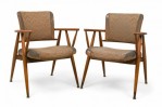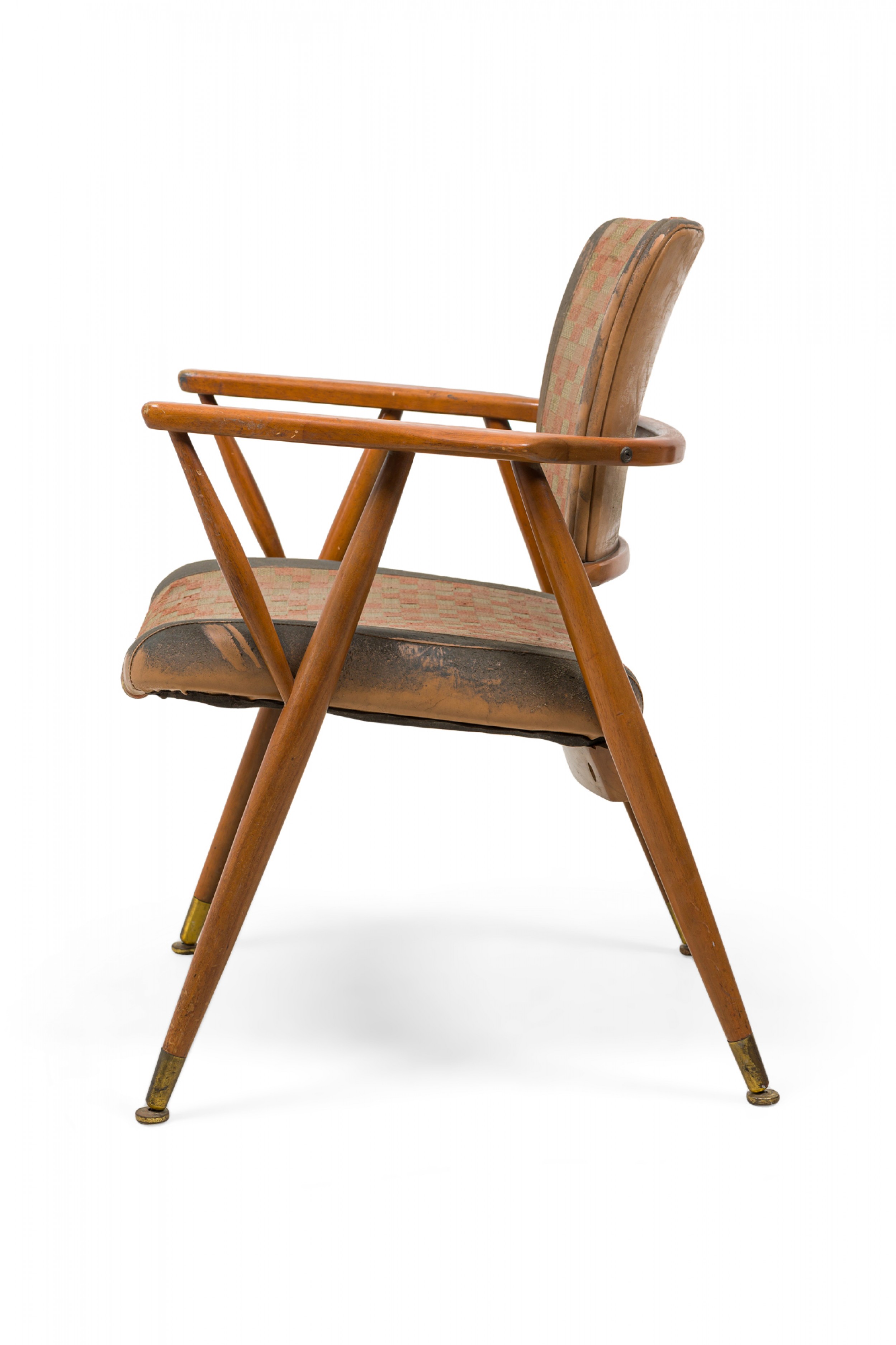PAIR of Mid-Century American armchairs with shaped horseshoe arms unified with the backrest as one piece,with shaped back and seat cushions upholstered in a beige and gray checkerboard patterned suede / fabric combination, standing on 4 extended tapered legs with brass sabots and disc feet. (in the style of GIO PONTI) (PRICED AS PAIR)