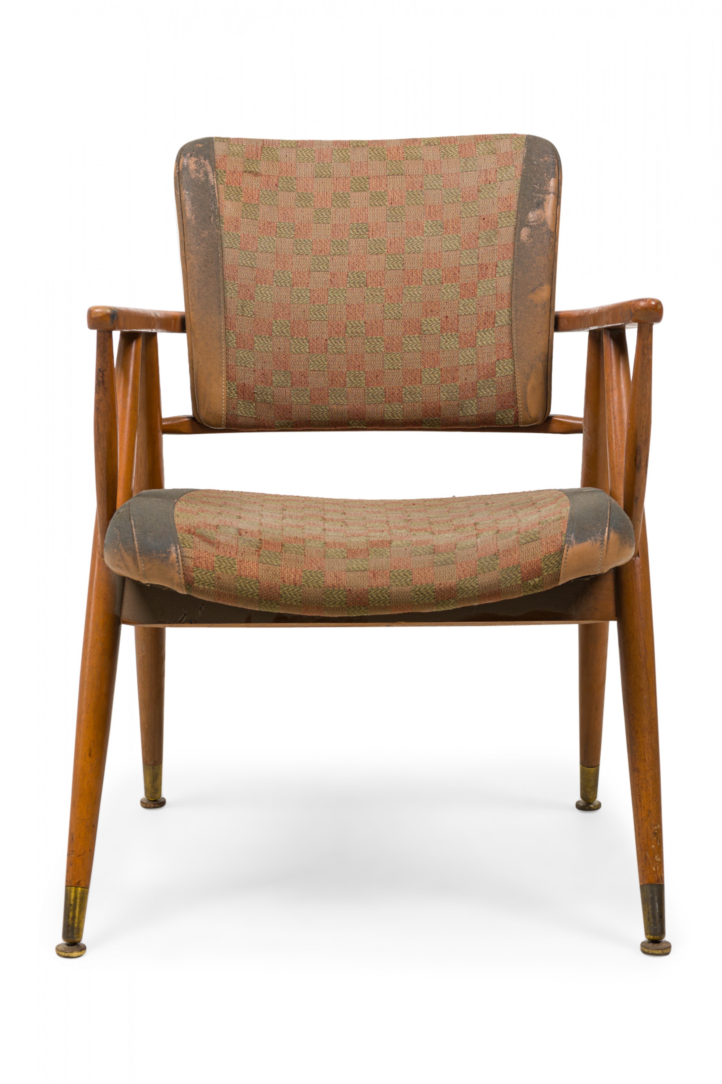 PAIR of Mid-Century American armchairs with shaped horseshoe arms unified with the backrest as one piece,with shaped back and seat cushions upholstered in a beige and gray checkerboard patterned suede / fabric combination, standing on 4 extended tapered legs with brass sabots and disc feet. (in the style of GIO PONTI) (PRICED AS PAIR).