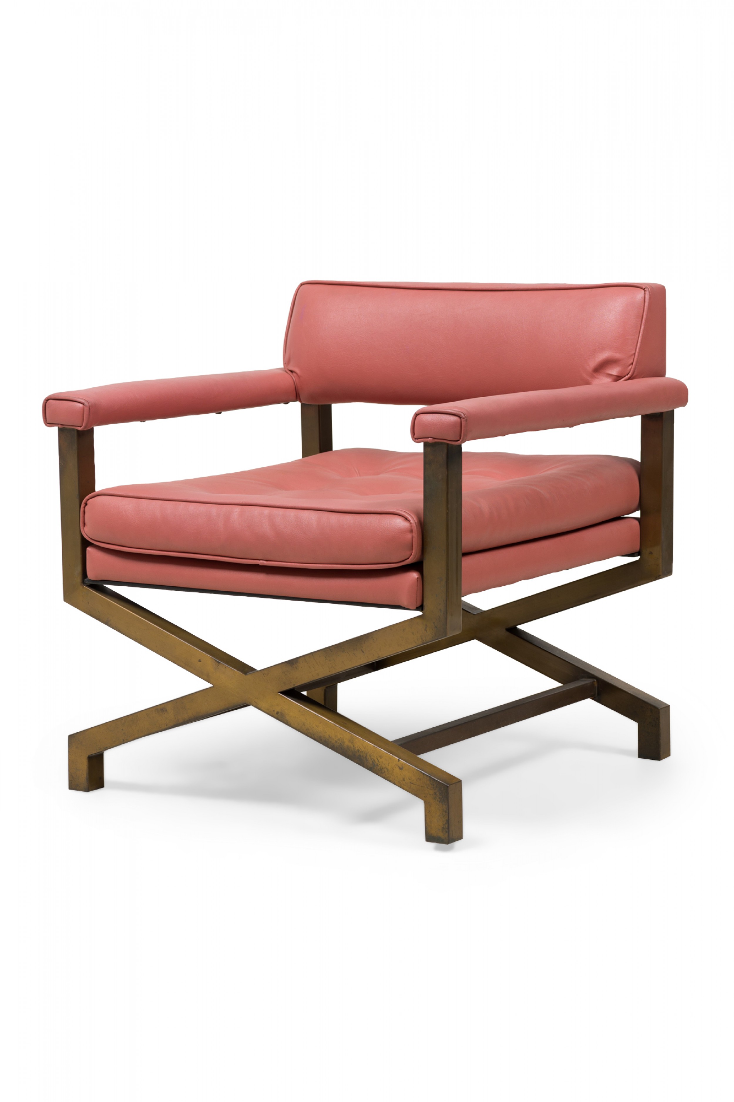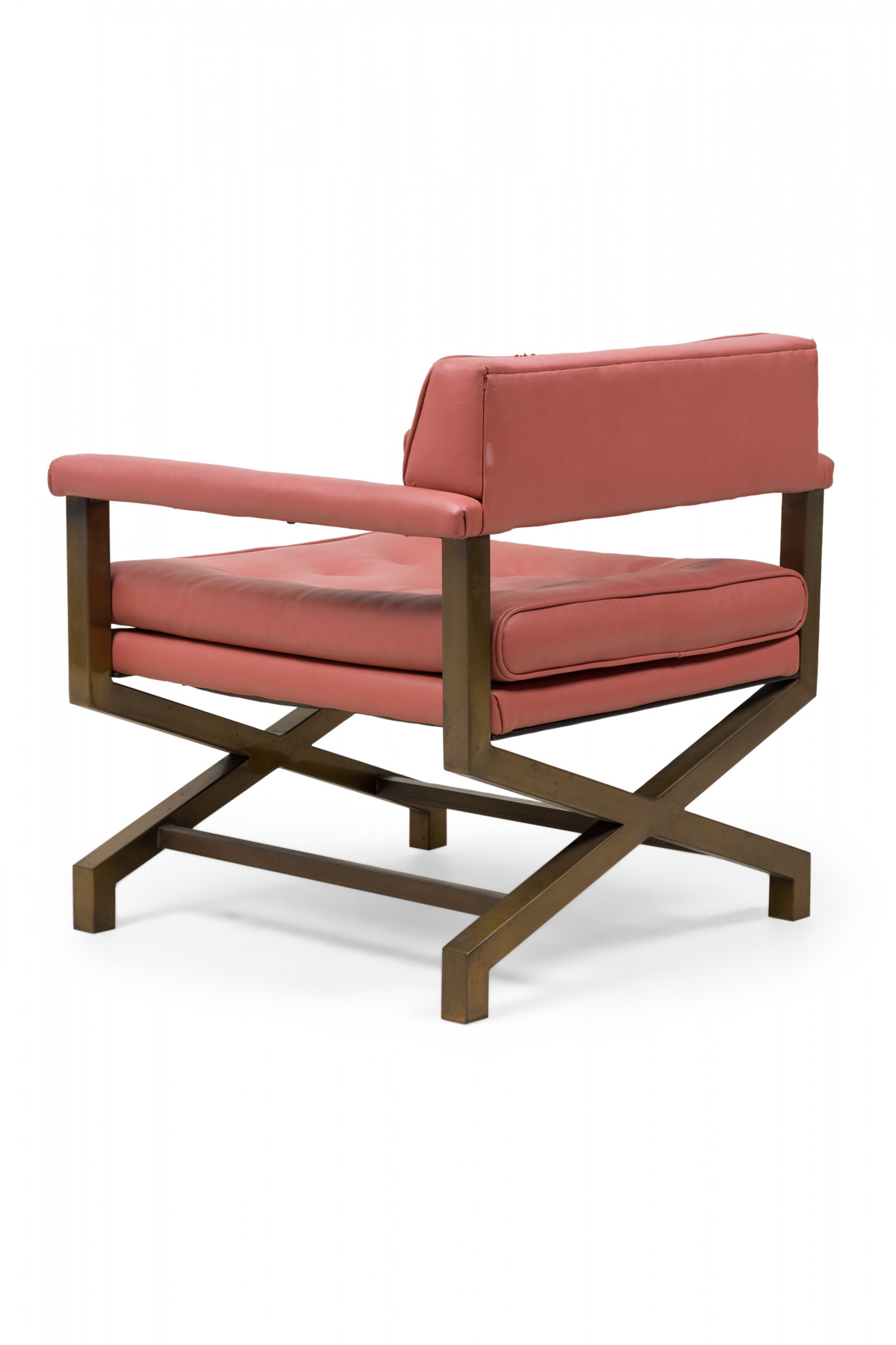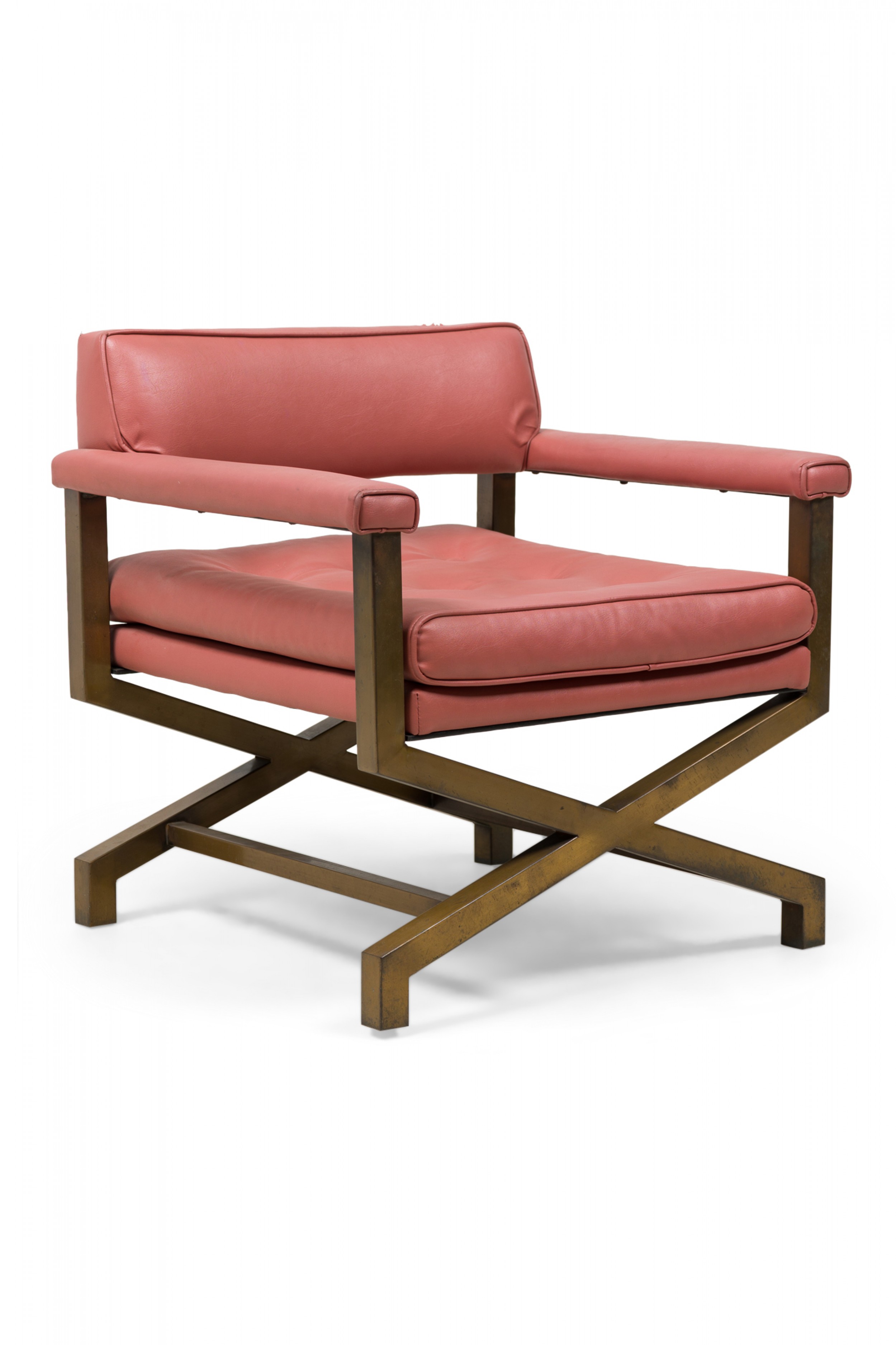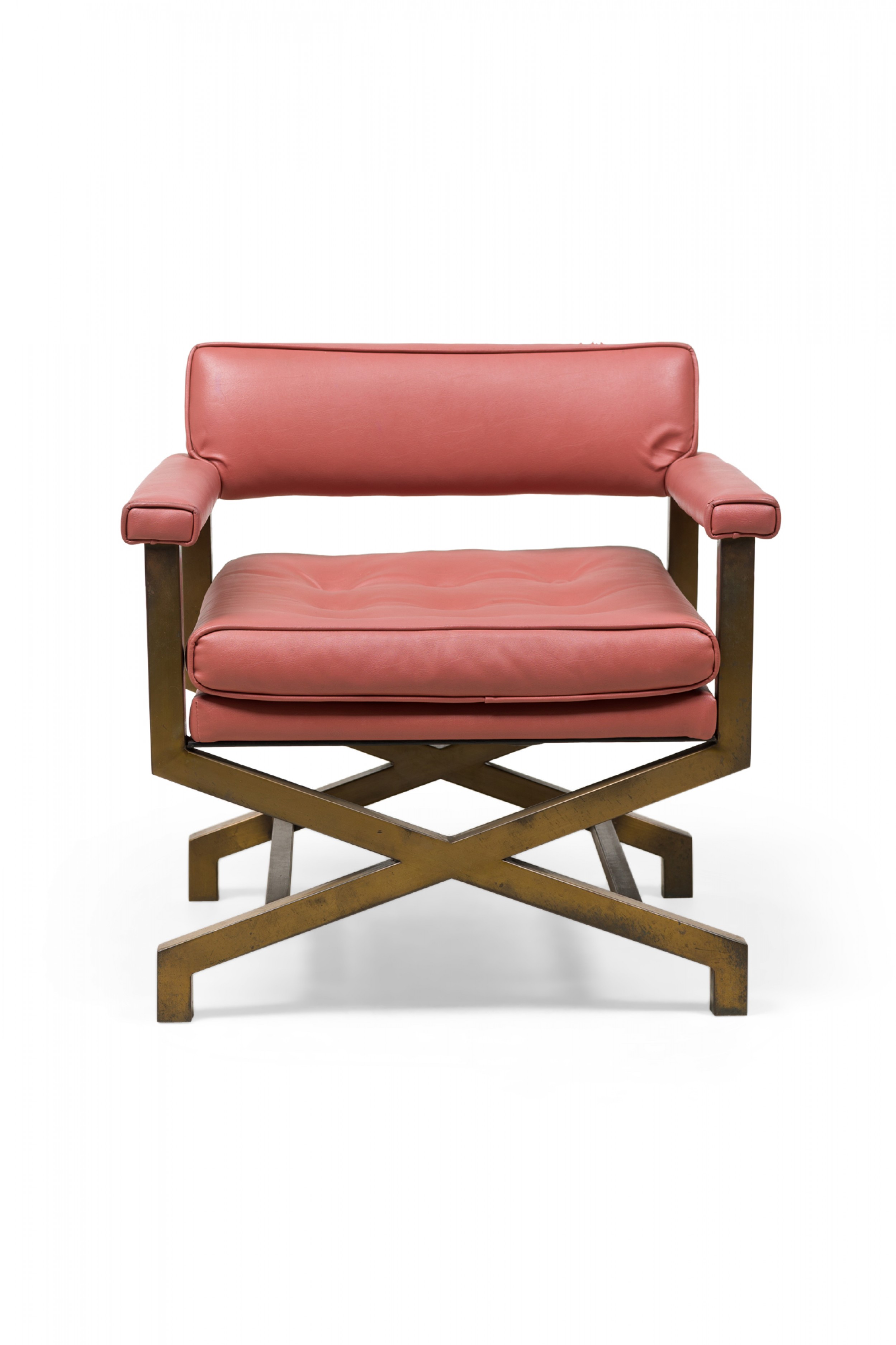 PAIR of Mid-Century American campaign / armchairs with an X-form metal frame with brushed brass finish and low backs, upholstered in dark pink / mauve leather with button tufted seats (PRICED AS PAIR) (attributed to TOMMI PARZINGER)