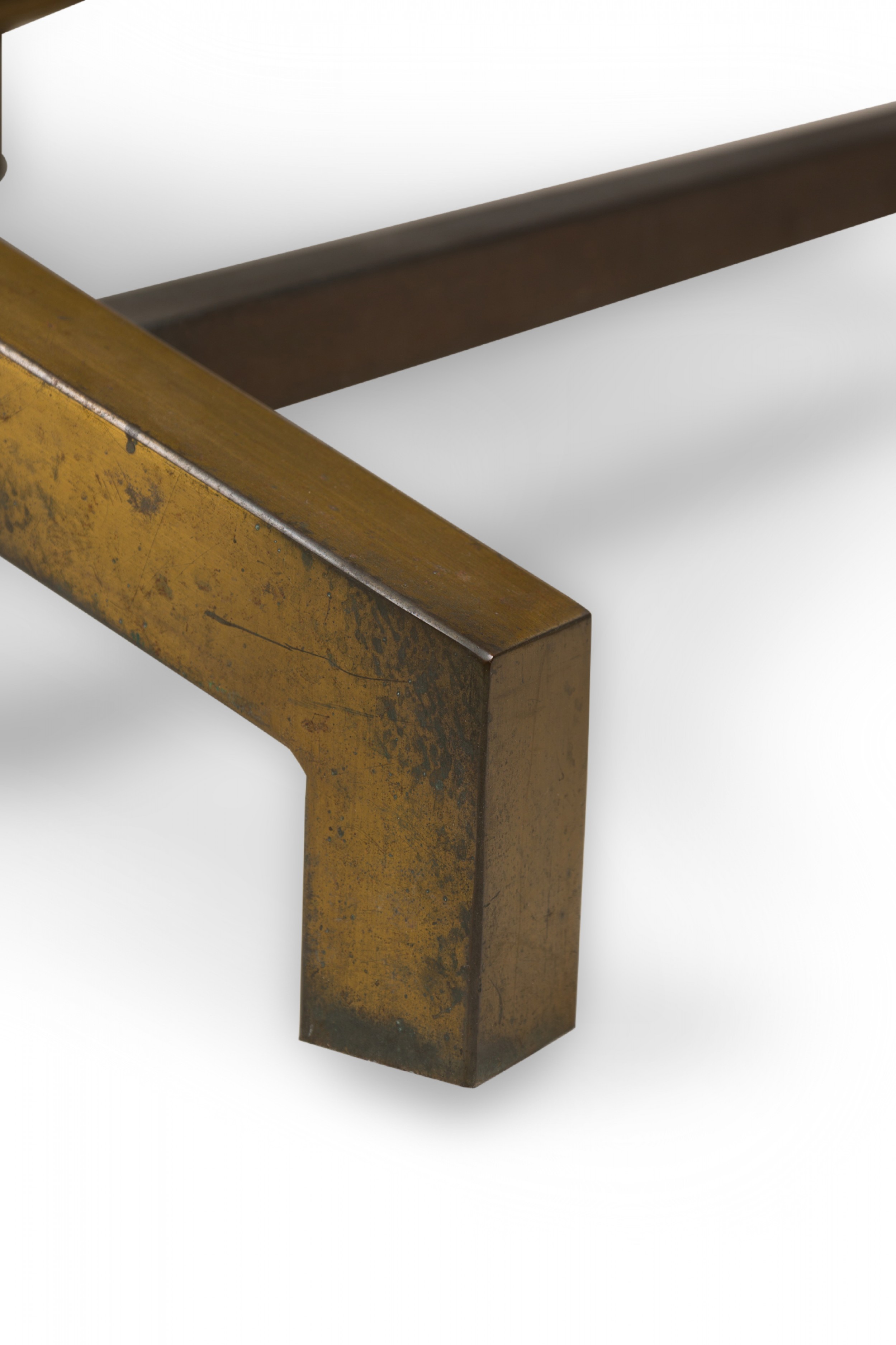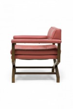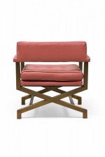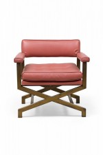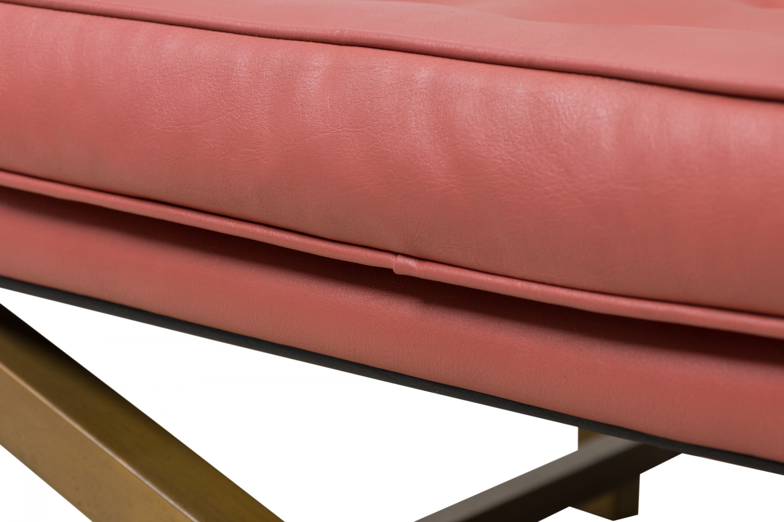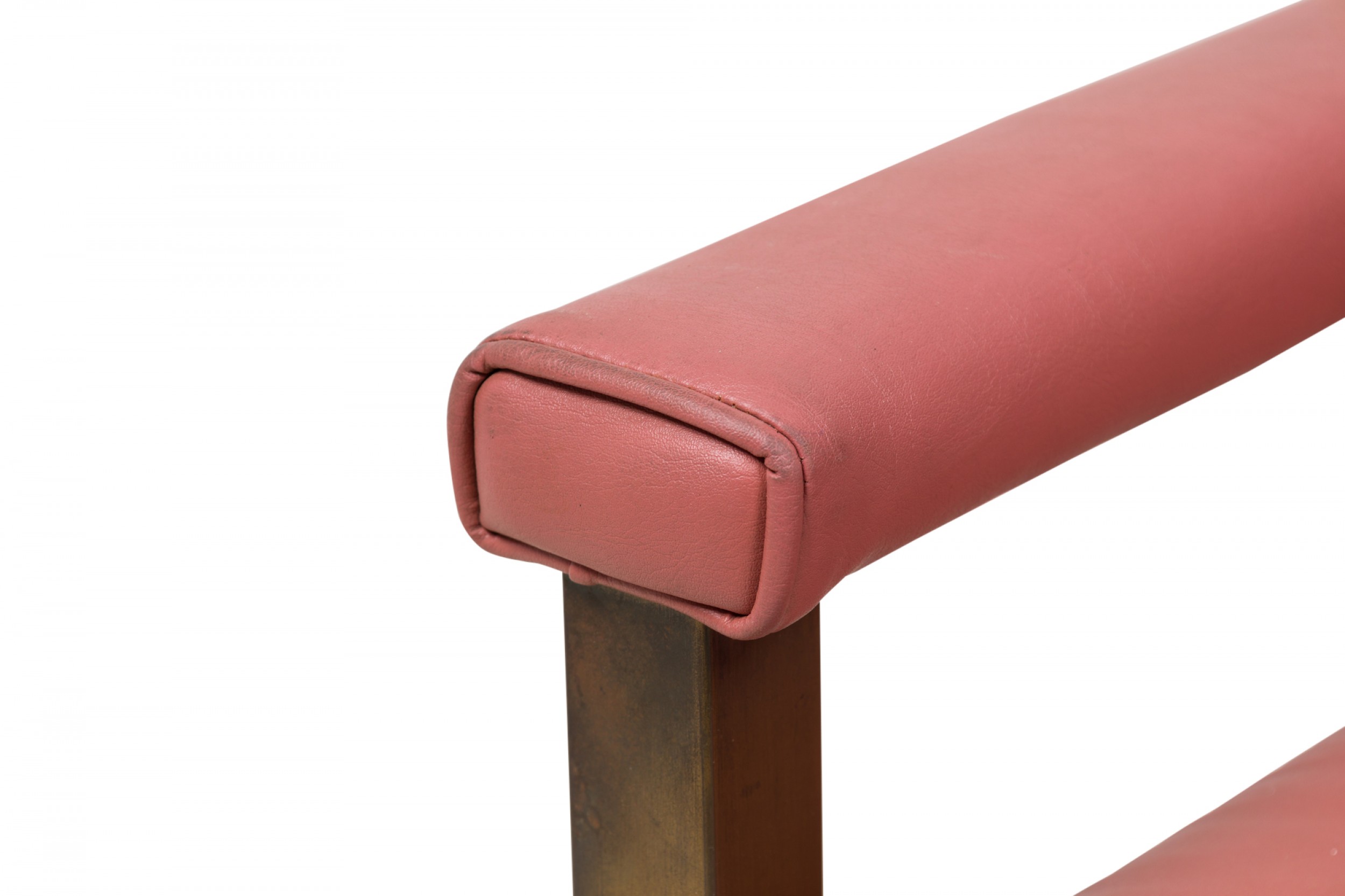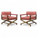 PAIR of Mid-Century American campaign / armchairs with an X-form metal frame with brushed brass finish and low backs, upholstered in dark pink / mauve leather with button tufted seats (PRICED AS PAIR) (attributed to TOMMI PARZINGER)