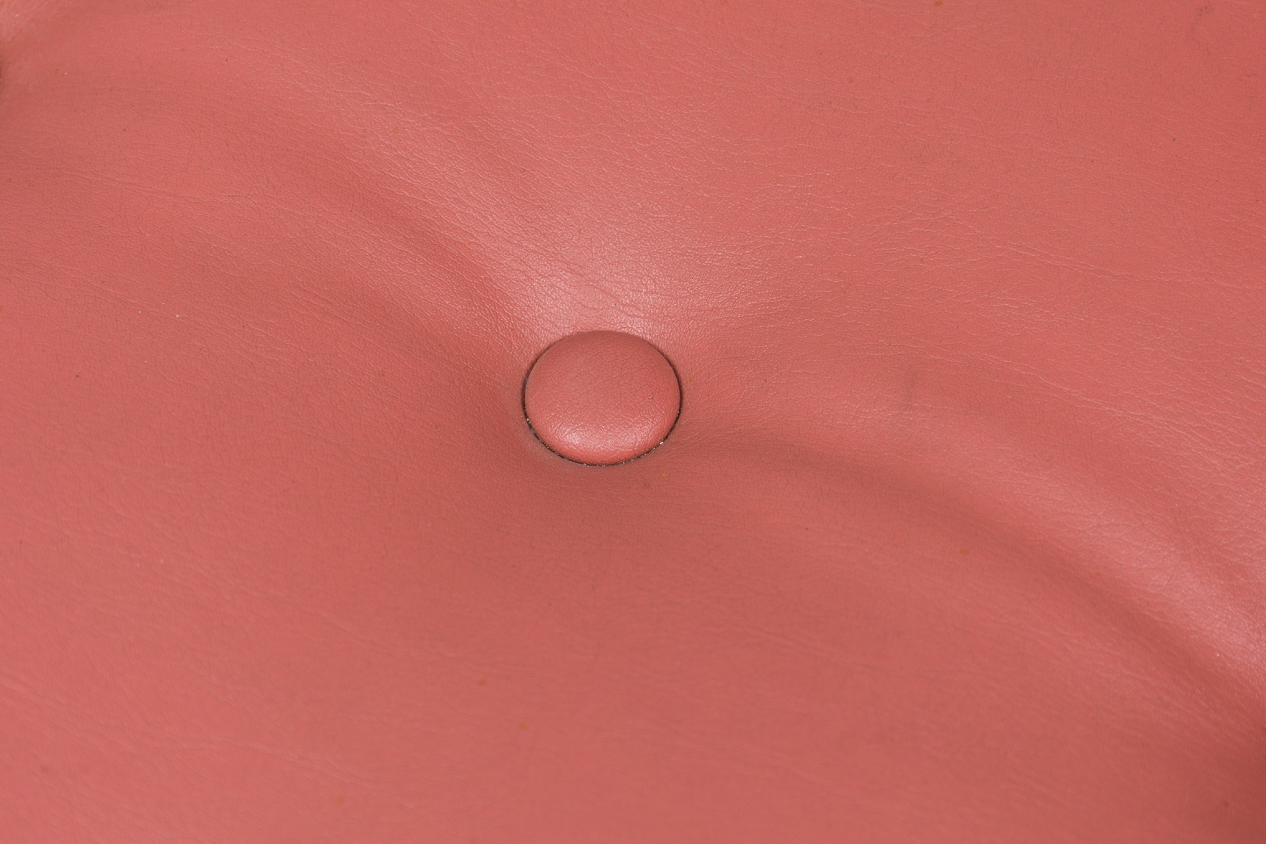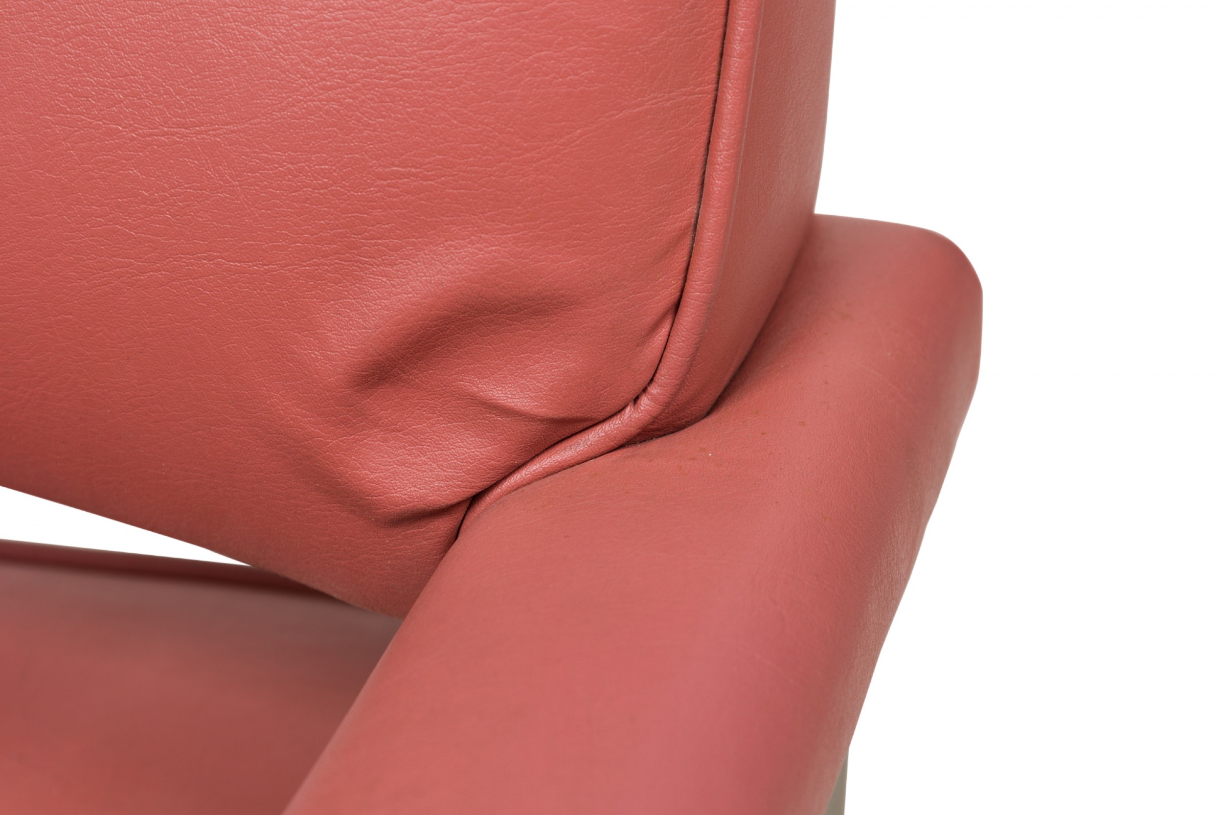 Style: Mid-Century Materials & Techniques: Leather, upholstered, wood Category: Seating Condition: Several small tears and scuffs in leather upholstery. Good; Wear consistent with age and use