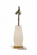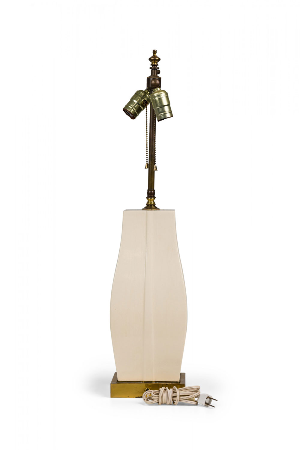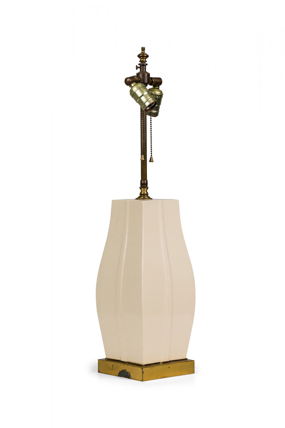 PAIR of Mid-Century American white lacquer square bombe form table lamps with finials having bodies accented by a subtle relief stripe contoured and centered on each side mounted on square form brass bases. (PRICED AS PAIR)