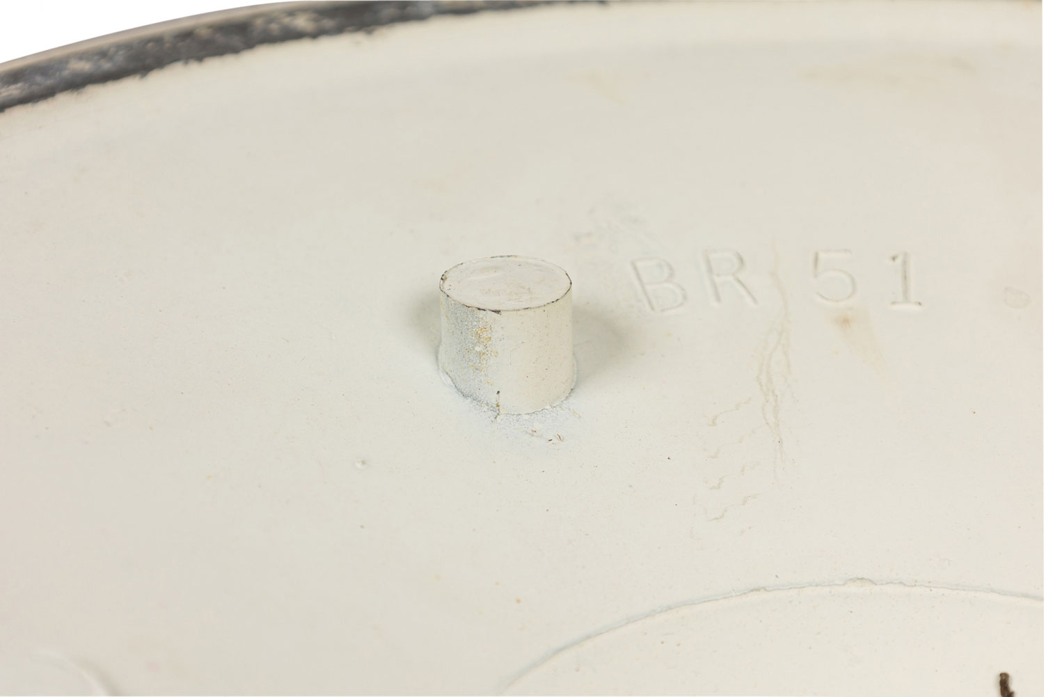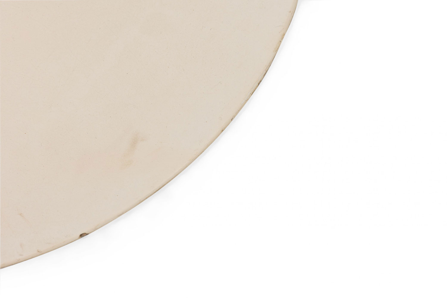 Style: Mid-Century Materials & Techniques: Enamel, leather, metal, painted, upholstered Category: Seating Condition: Base dia 14.5" Good; Wear consistent with age and use
