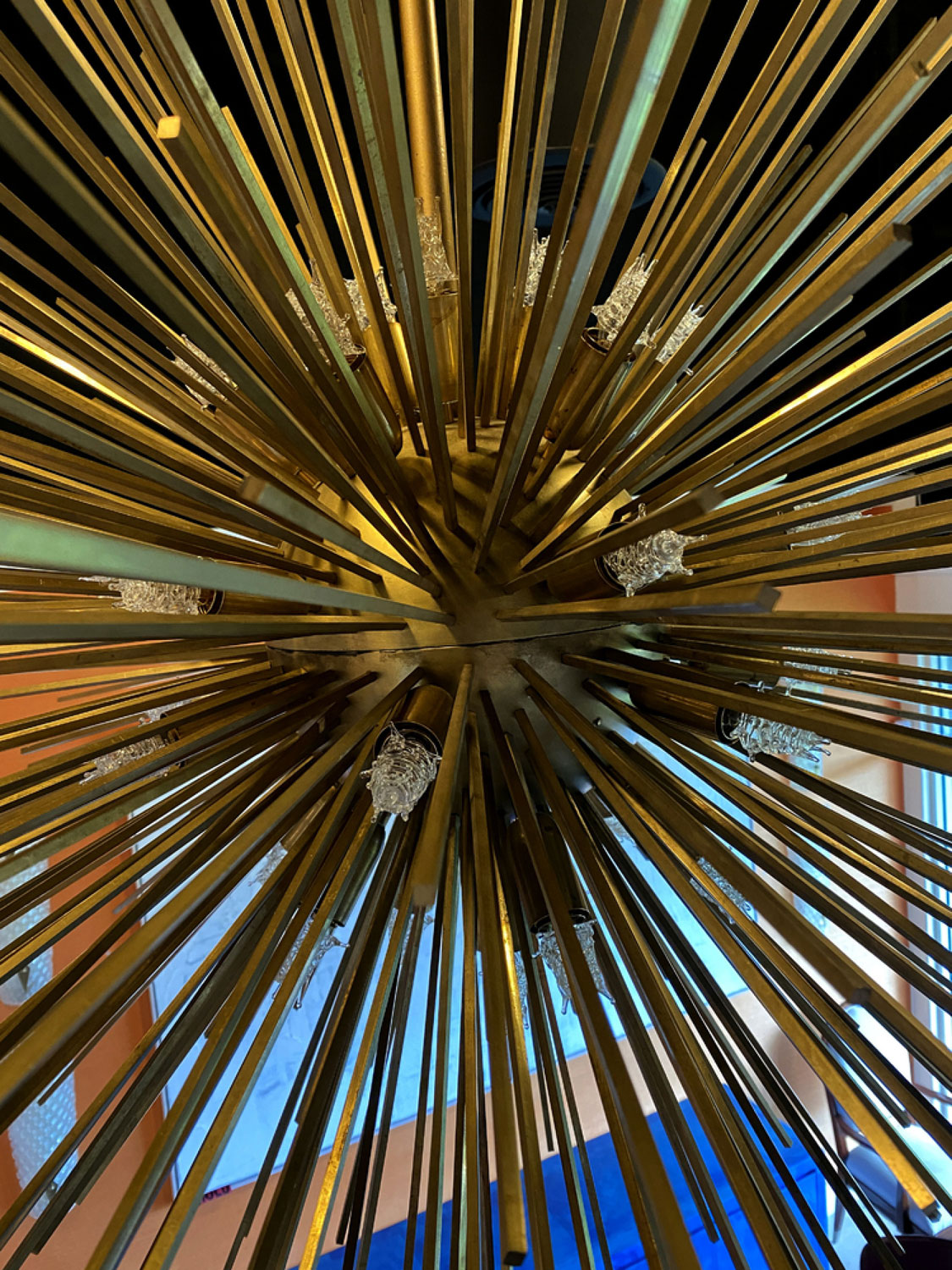 PAIR of Mid-Century Italian Modern monumental Sputnik chandeliers in brass. (PRICED AS PAIR)