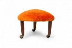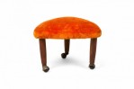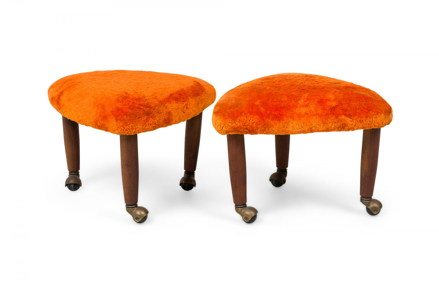 PAIR of Mid-Century Italian Modern triangular footstools, upholstered in plush orange velour, standing on 3 legs with brass casters. (manner of GIO PONTI) (PRICED AS PAIR)(Available in black: REG4086A)