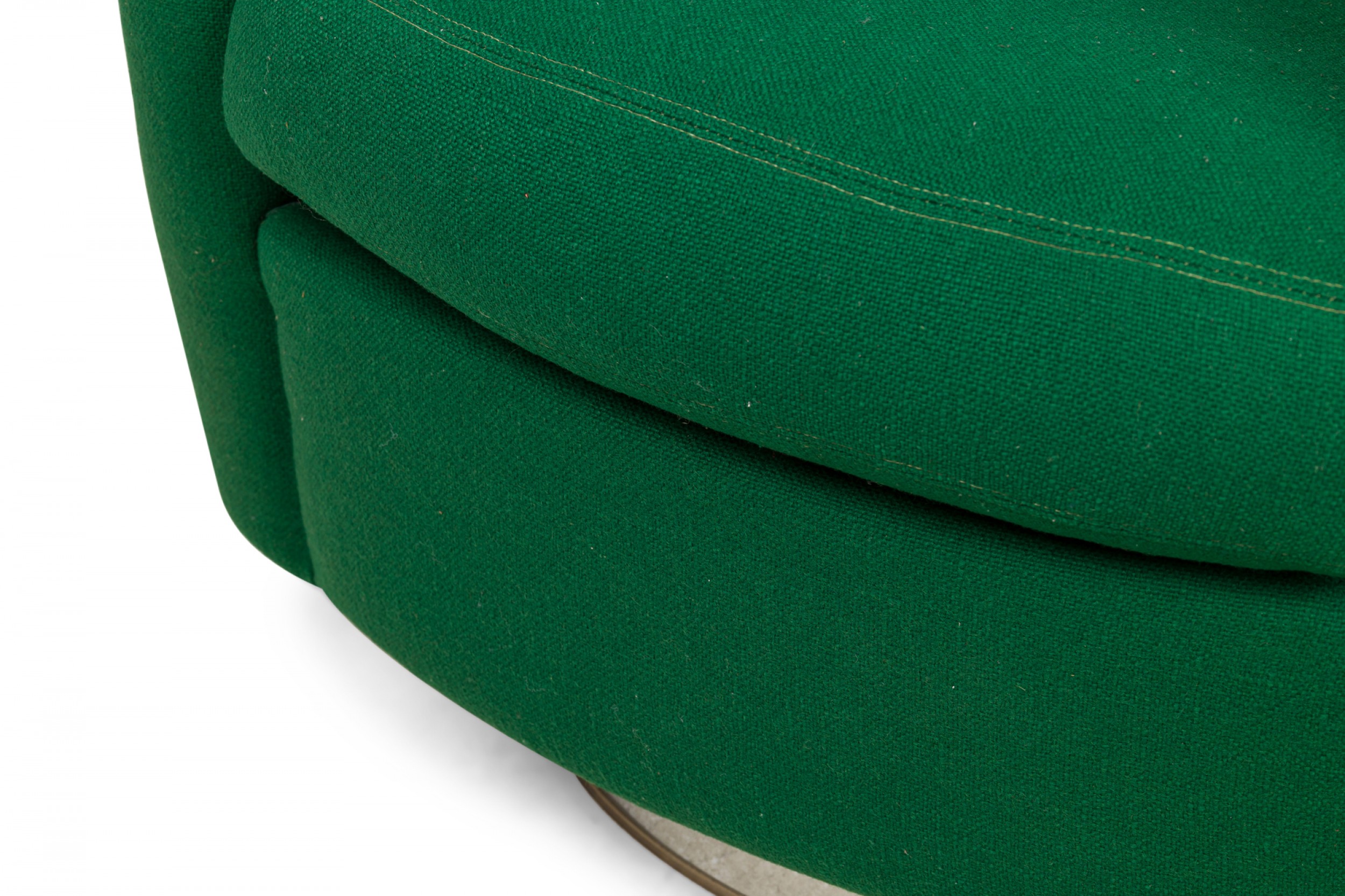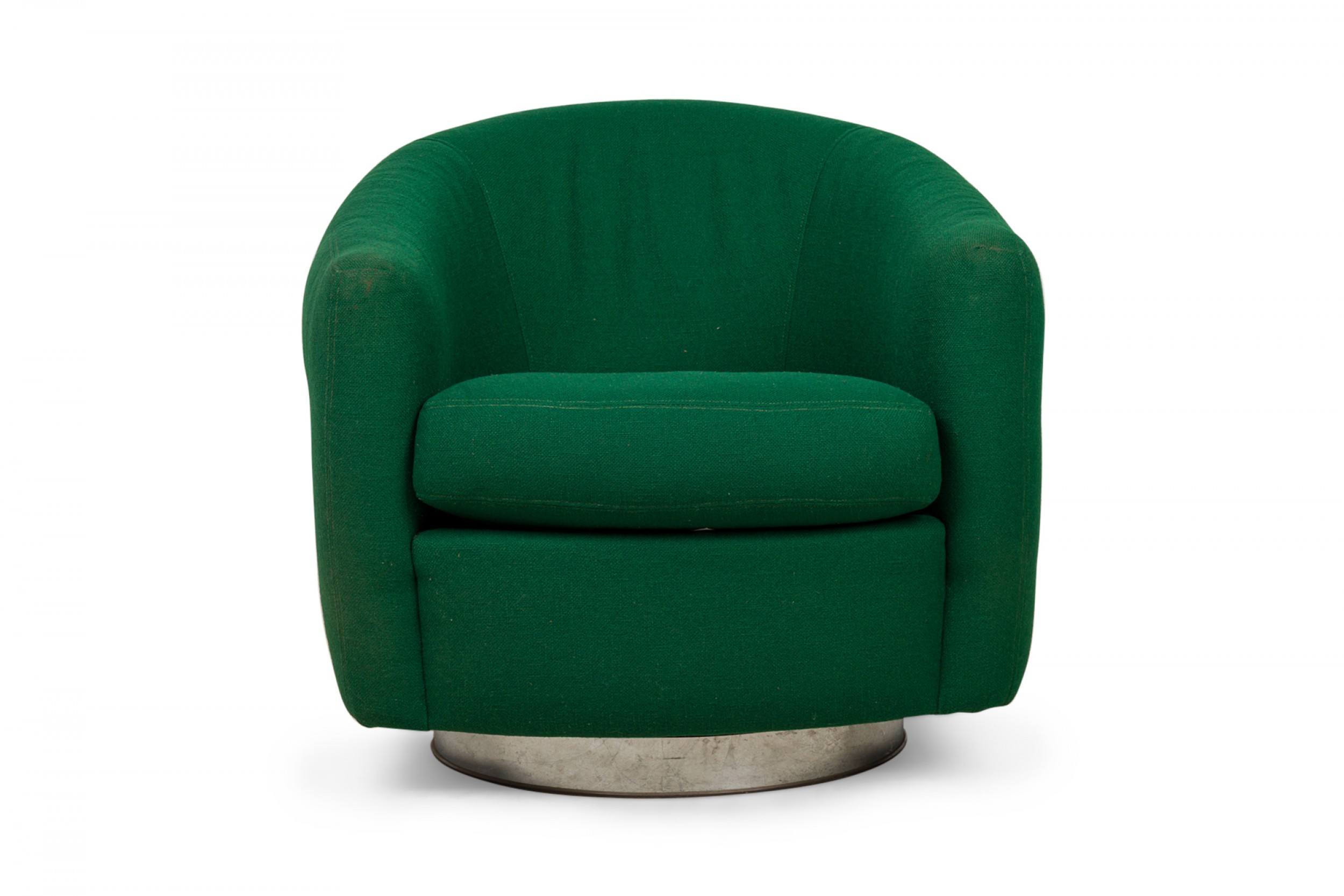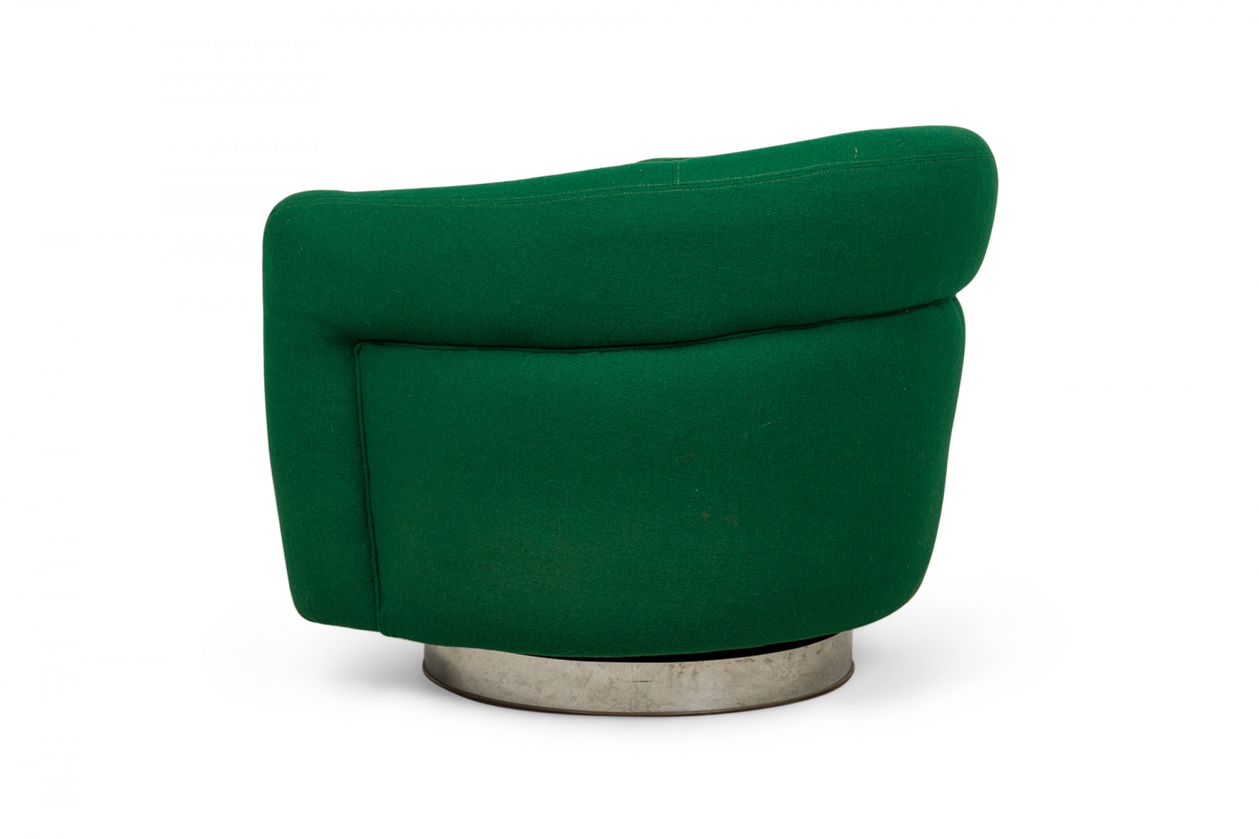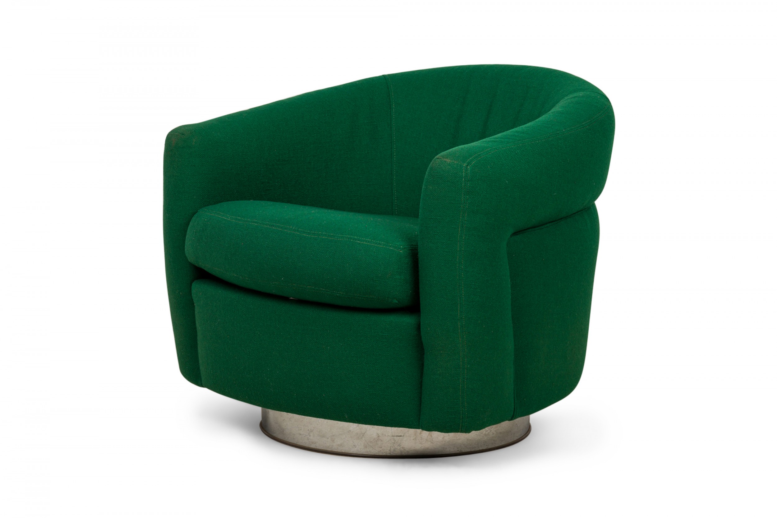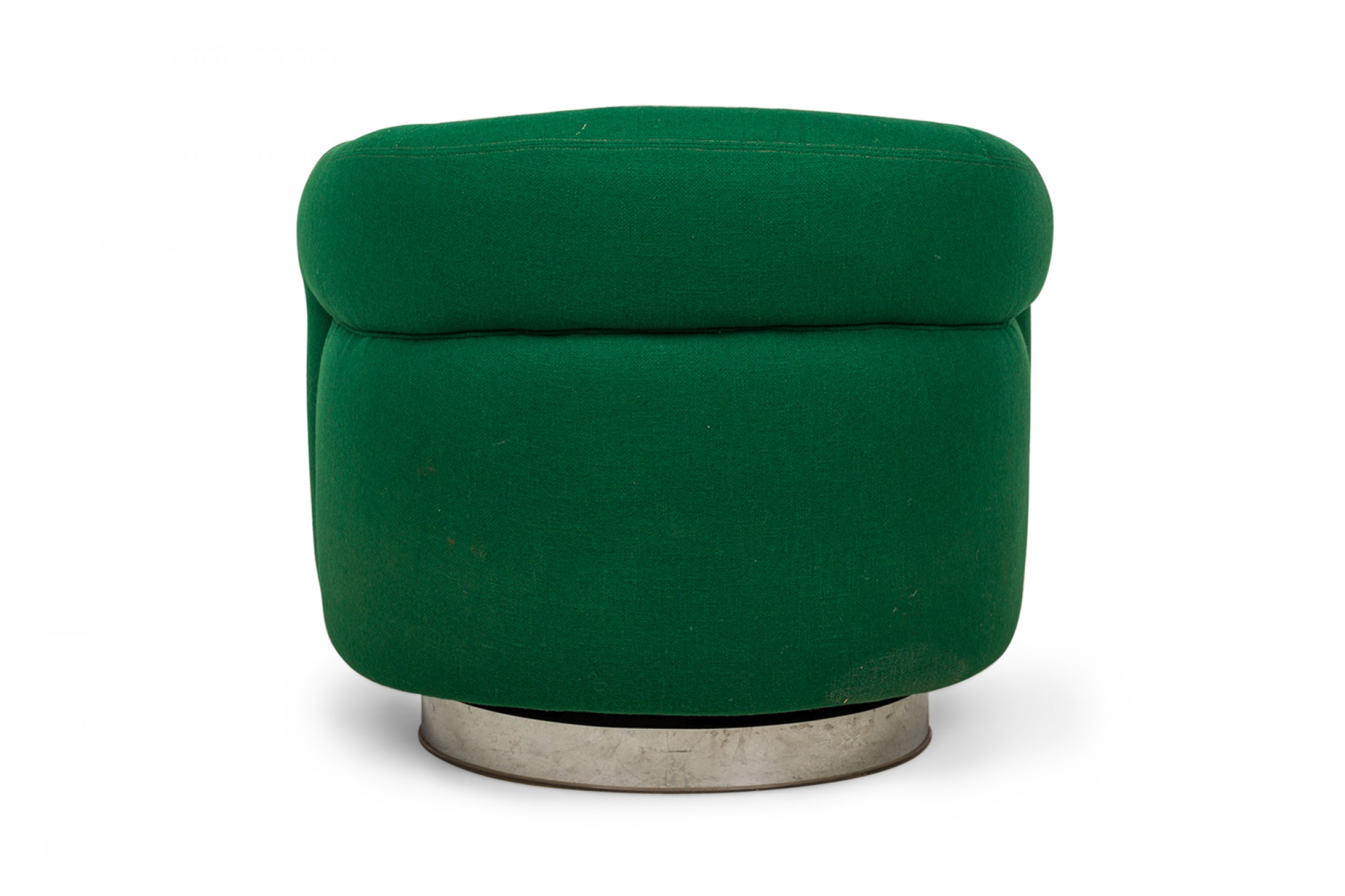 PAIR of American Mid-Century tub form swiveling lounge / armchairs upholstered in emerald green fabric and resting on circular chrome swivel bases. (MILO BAUGHMAN)(PRICED AS PAIR)