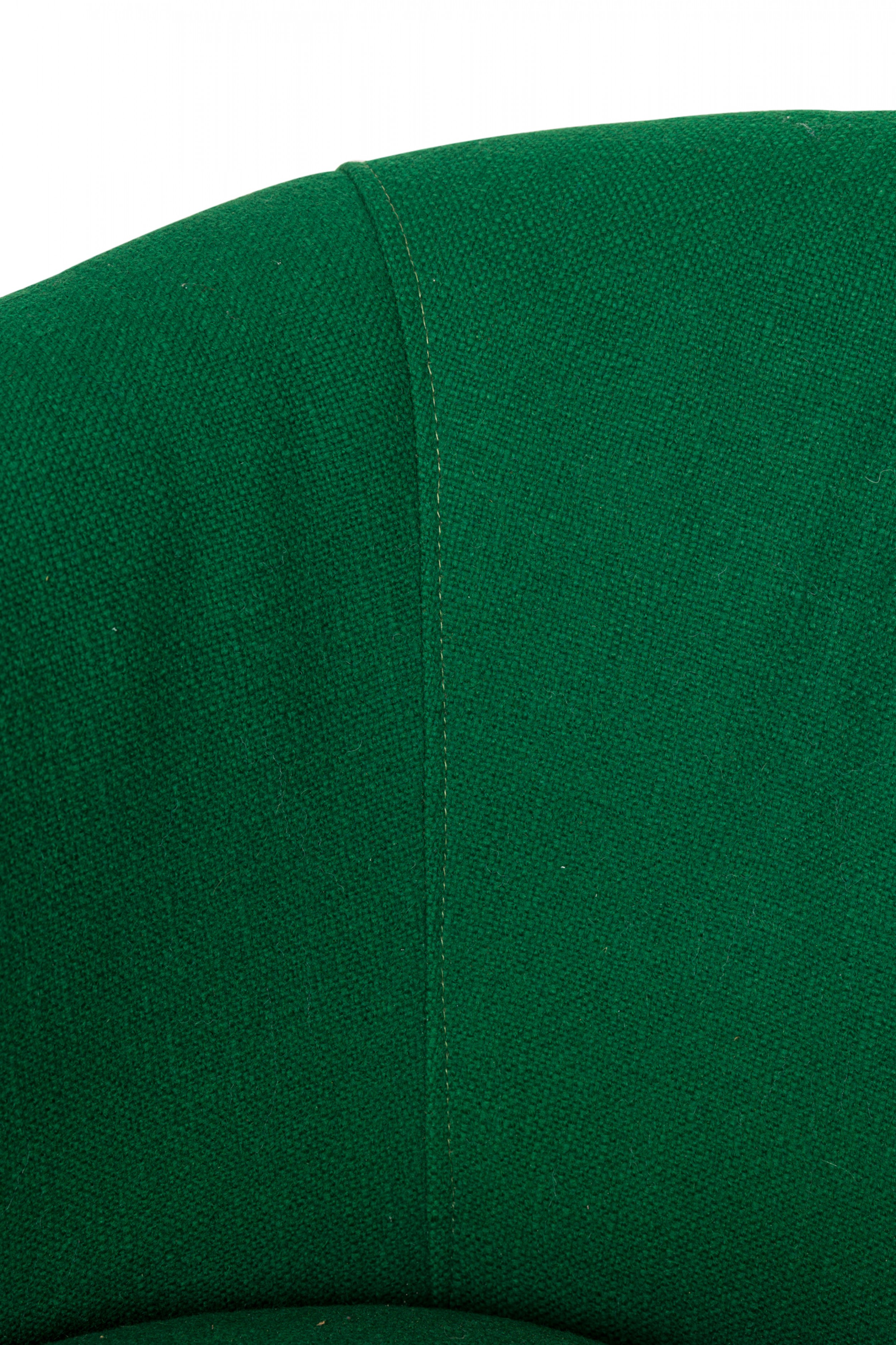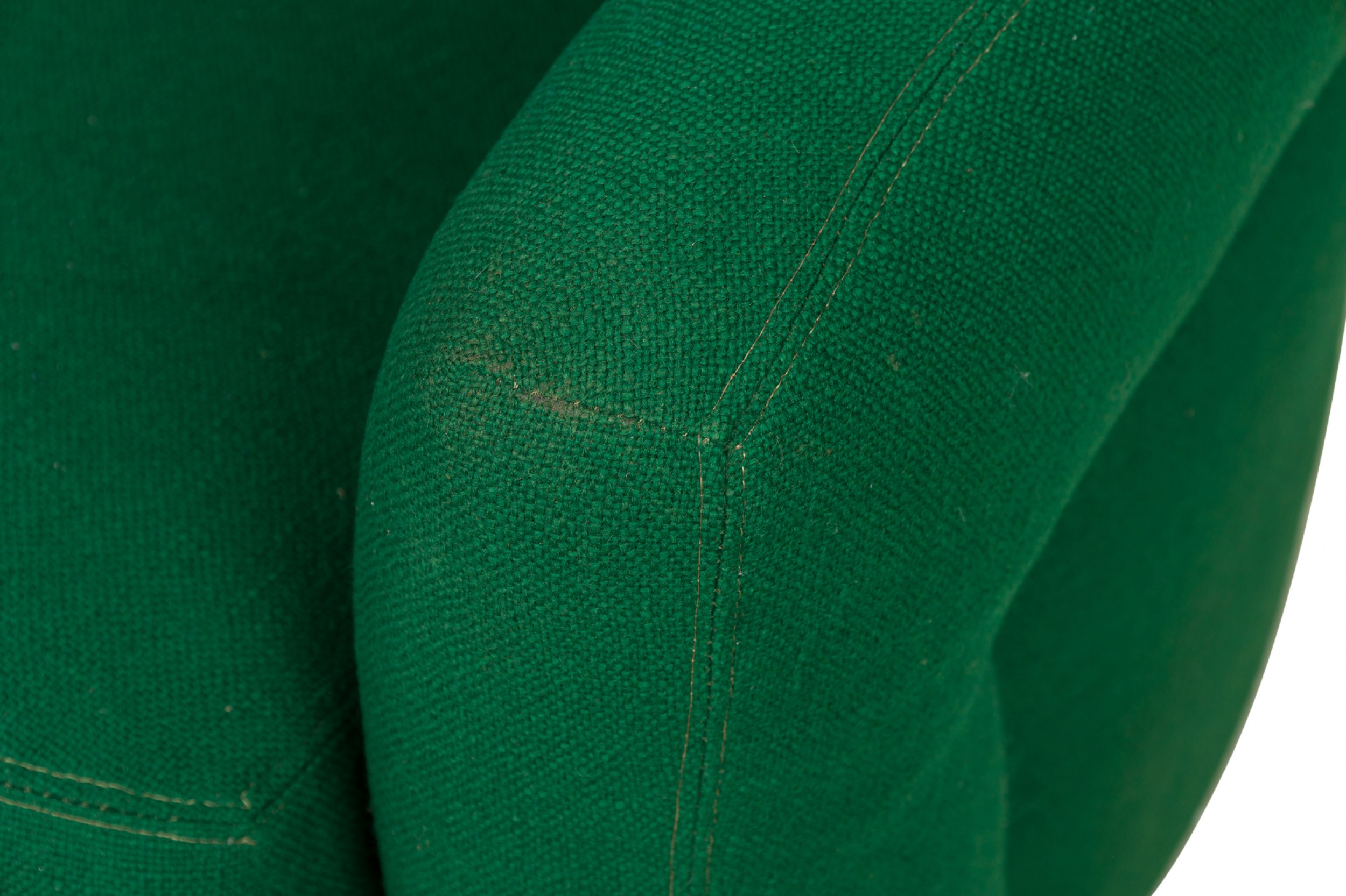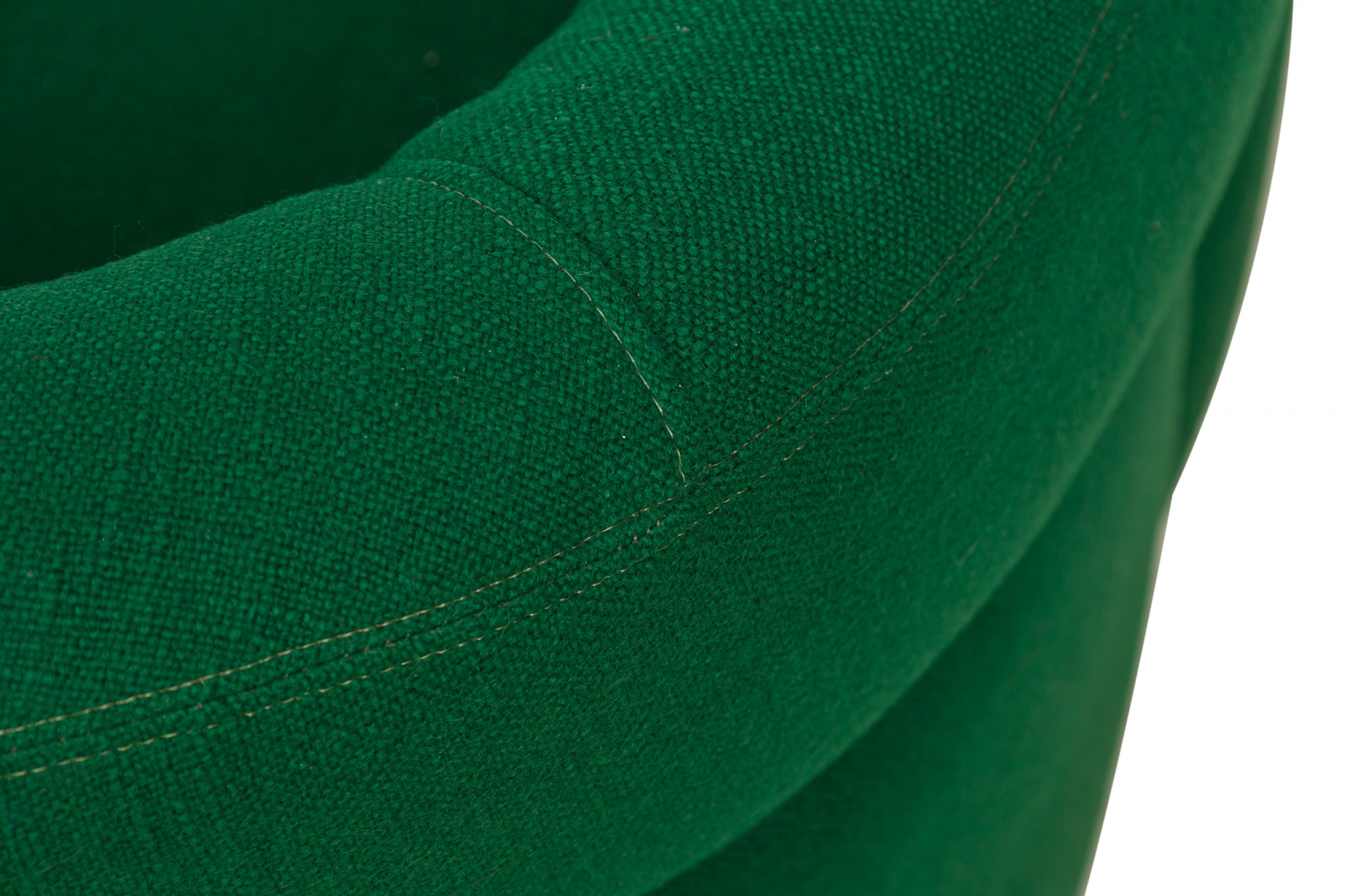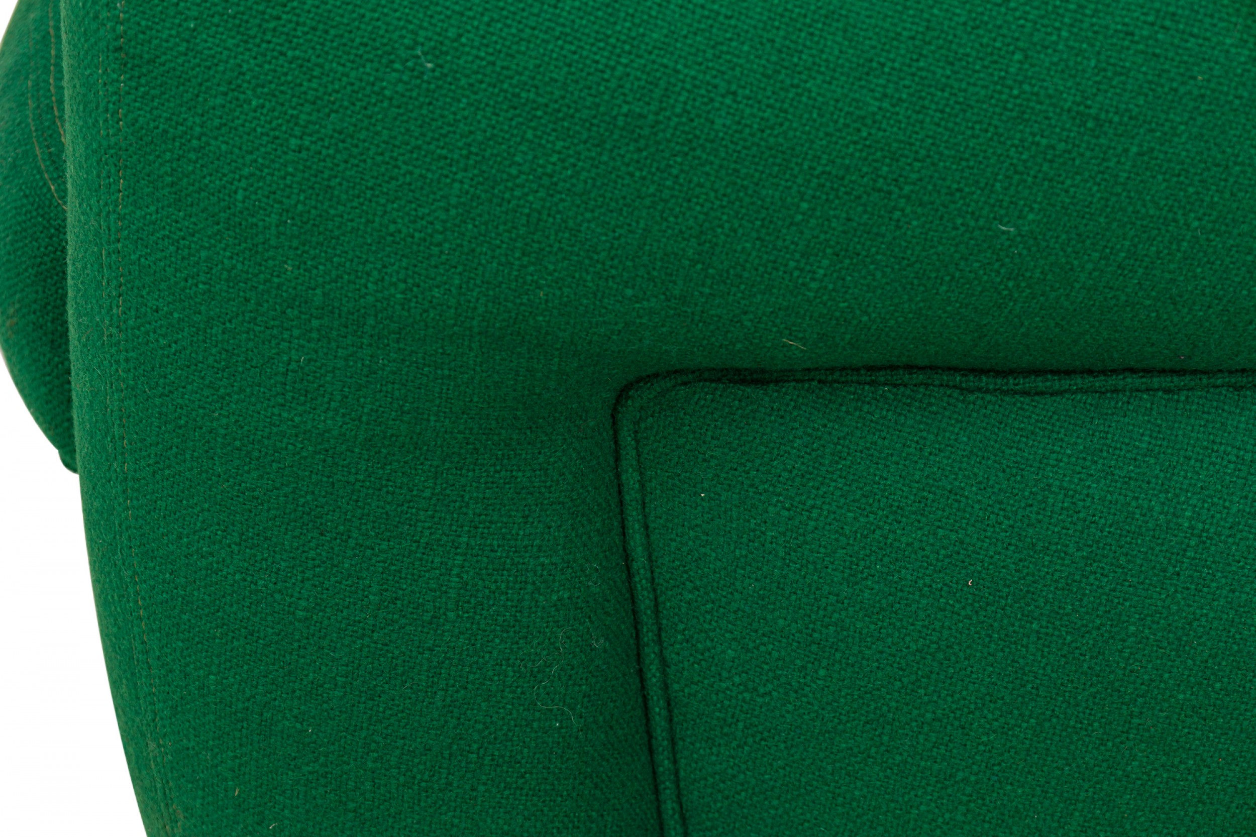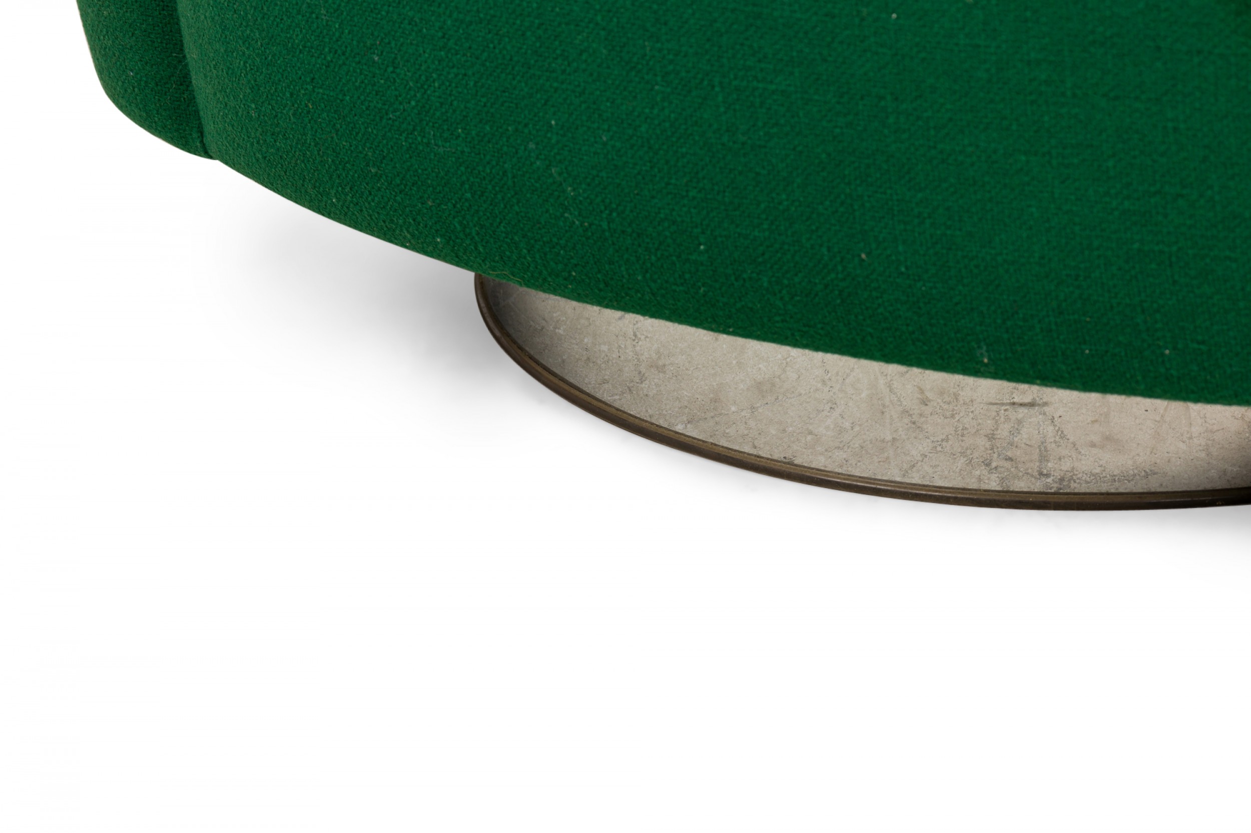 PAIR of American Mid-Century tub form swiveling lounge / armchairs upholstered in emerald green fabric and resting on circular chrome swivel bases. (MILO BAUGHMAN)(PRICED AS PAIR)
