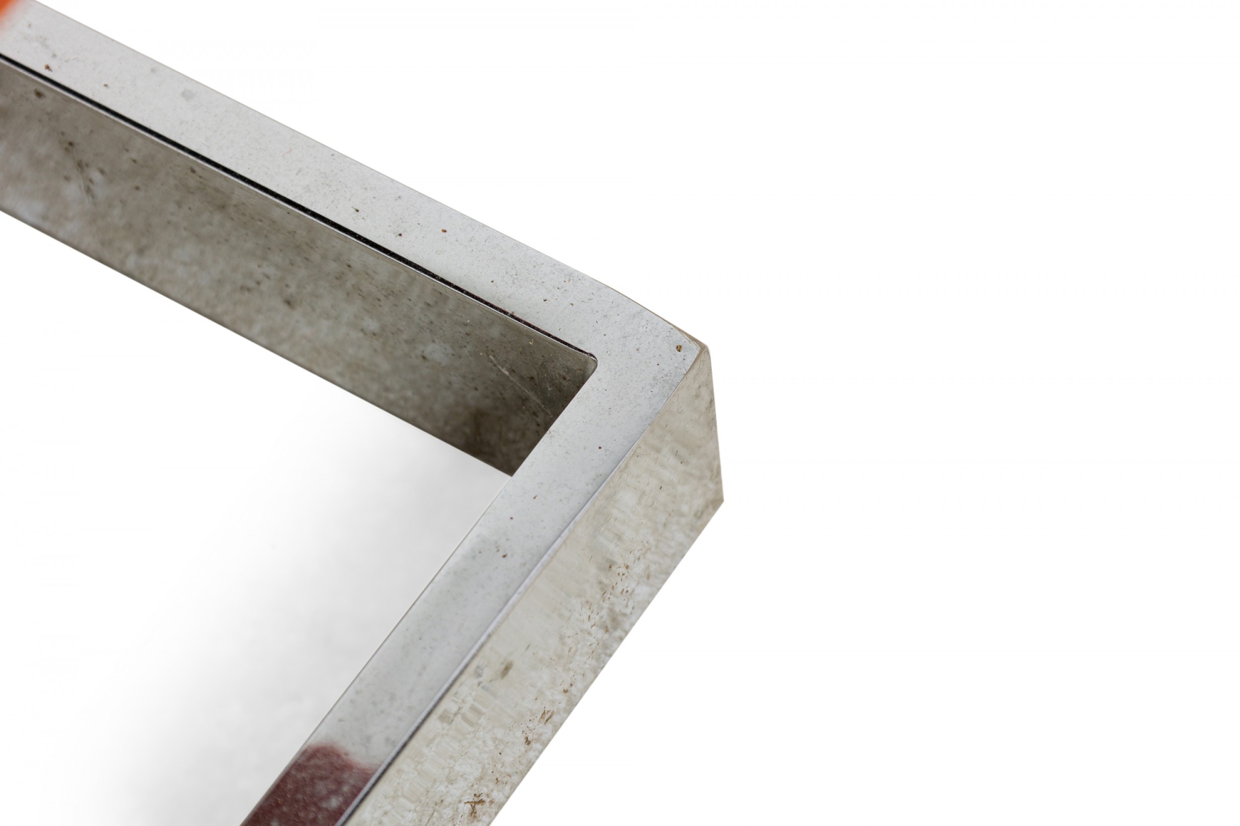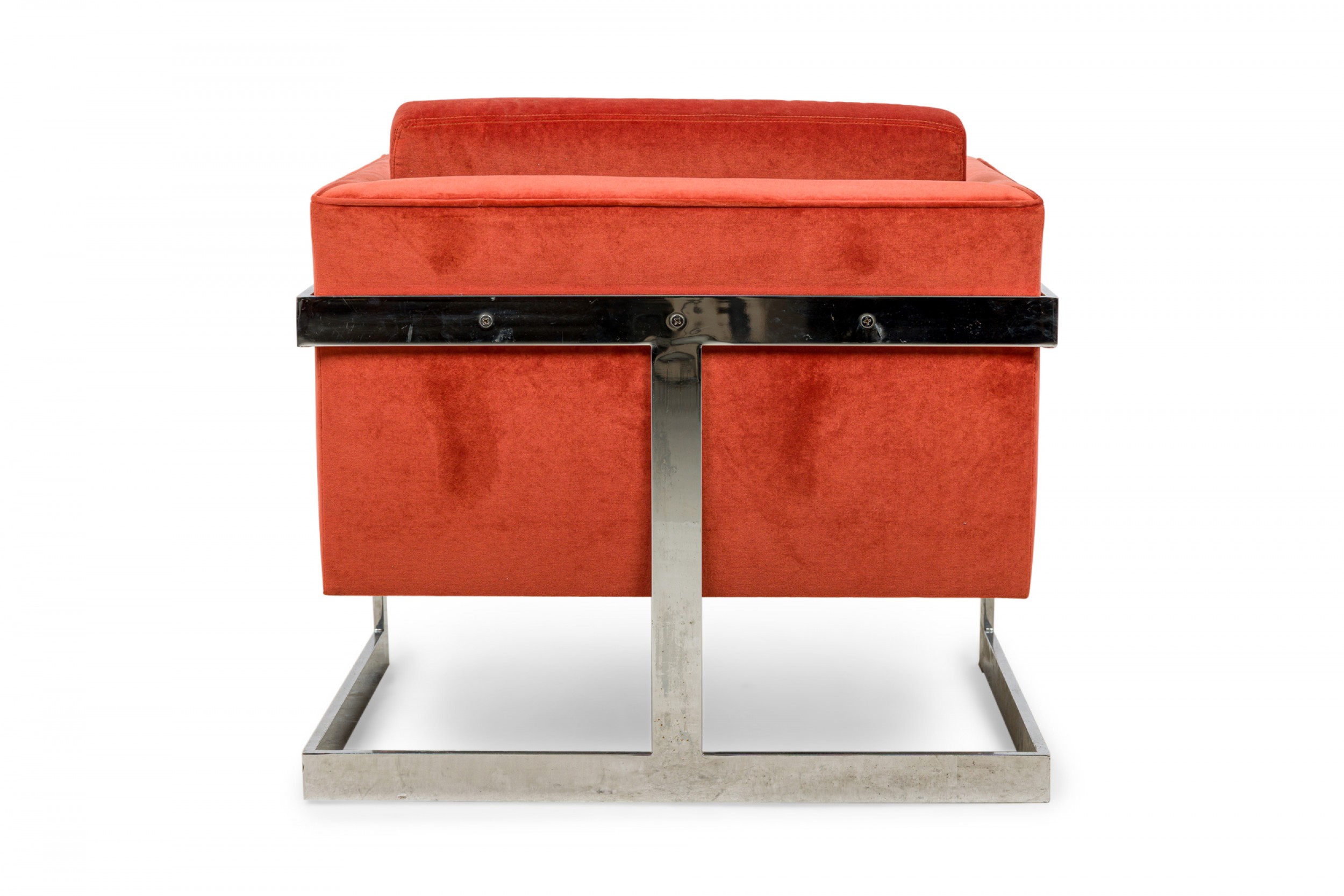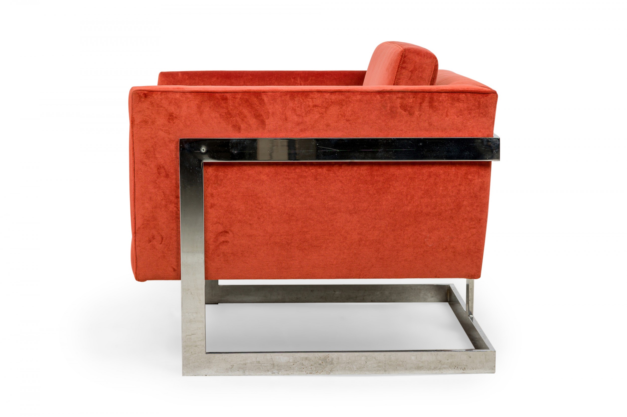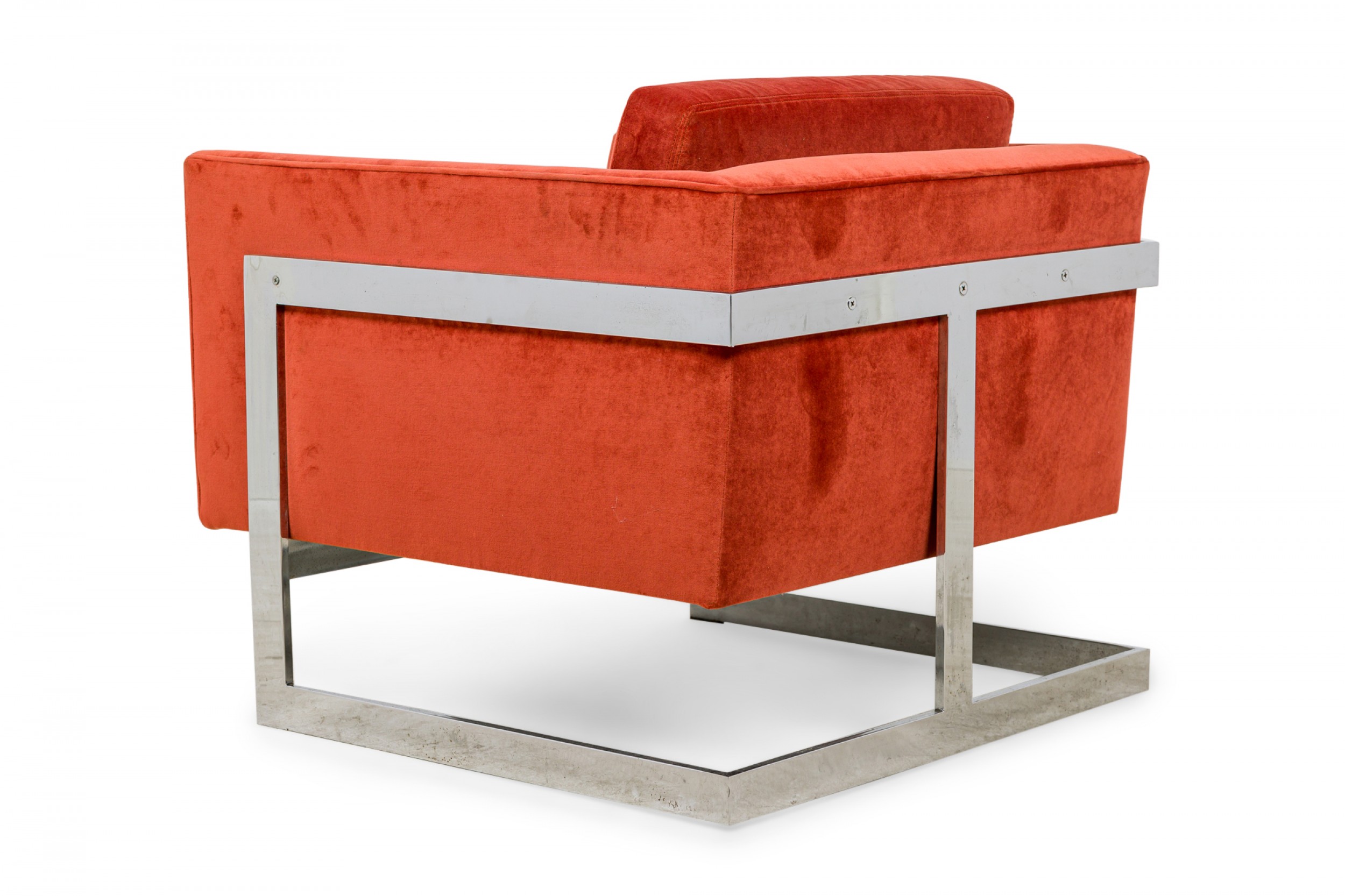 PAIR of American Mid-Century floating cube lounge /armchairs with polished chrome frames and orange velvet upholstery. (MILO BAUGHMAN FOR THAYER COGGIN)(PRICED AS PAIR).