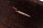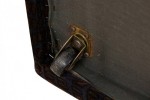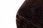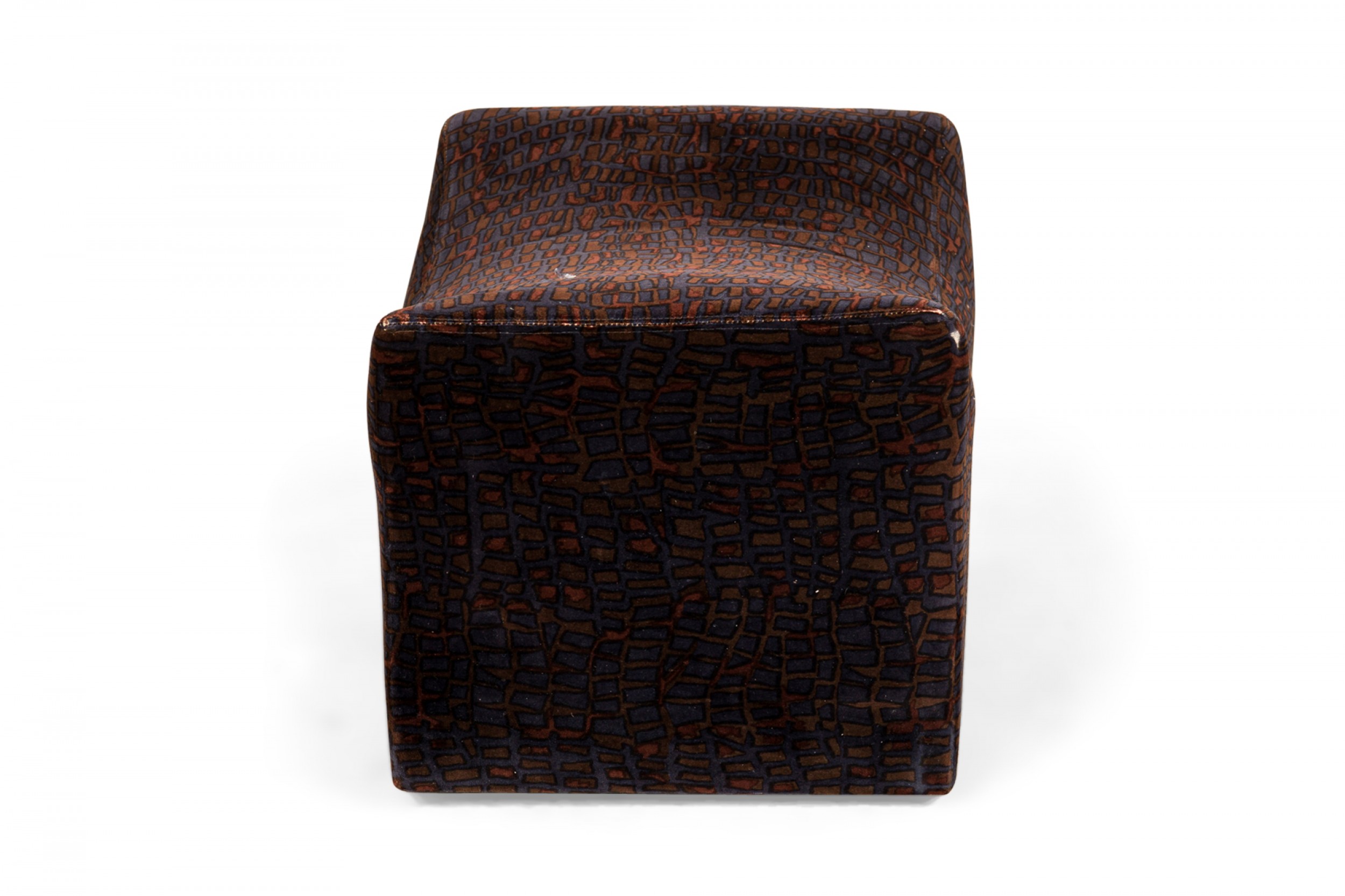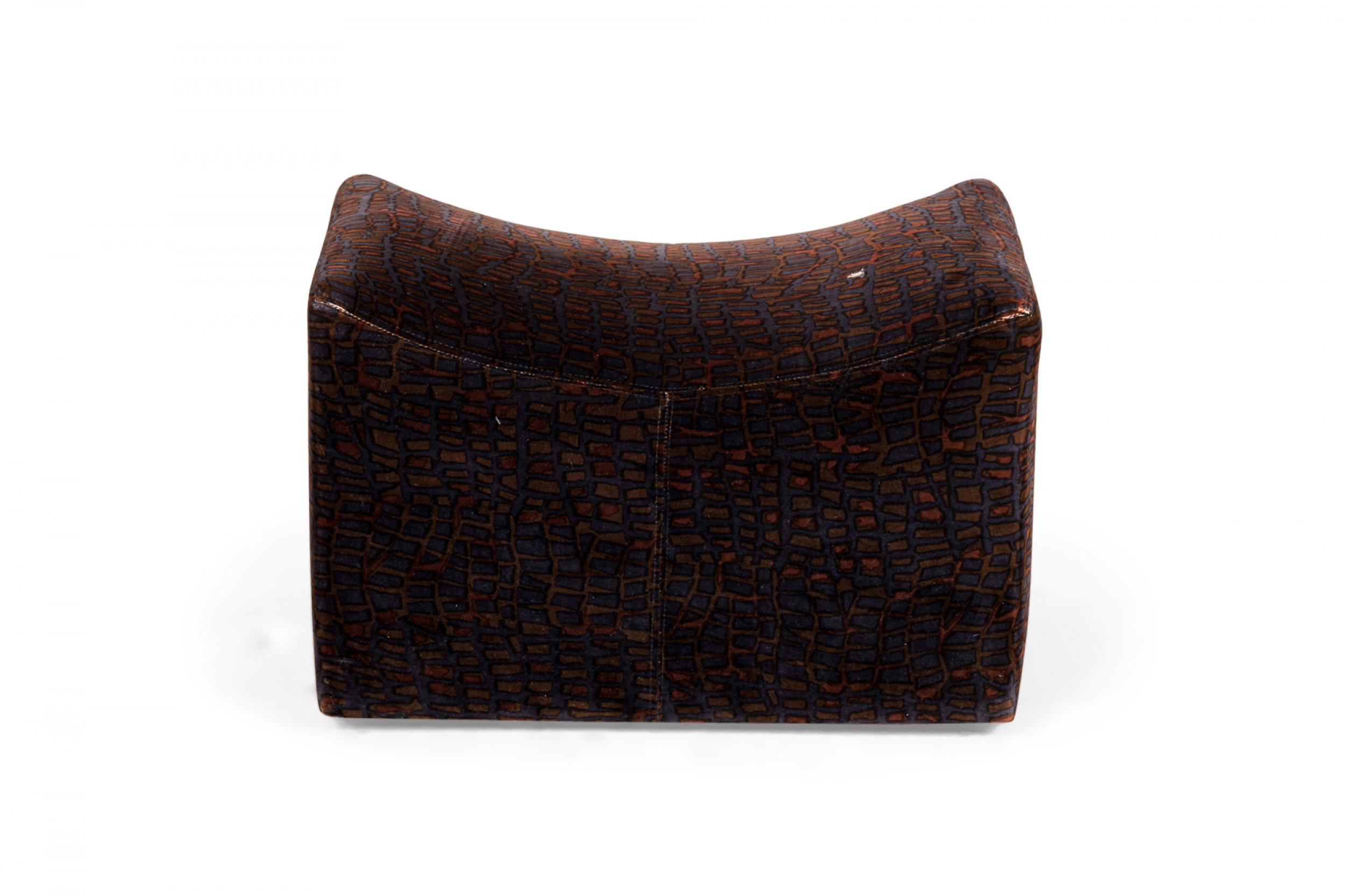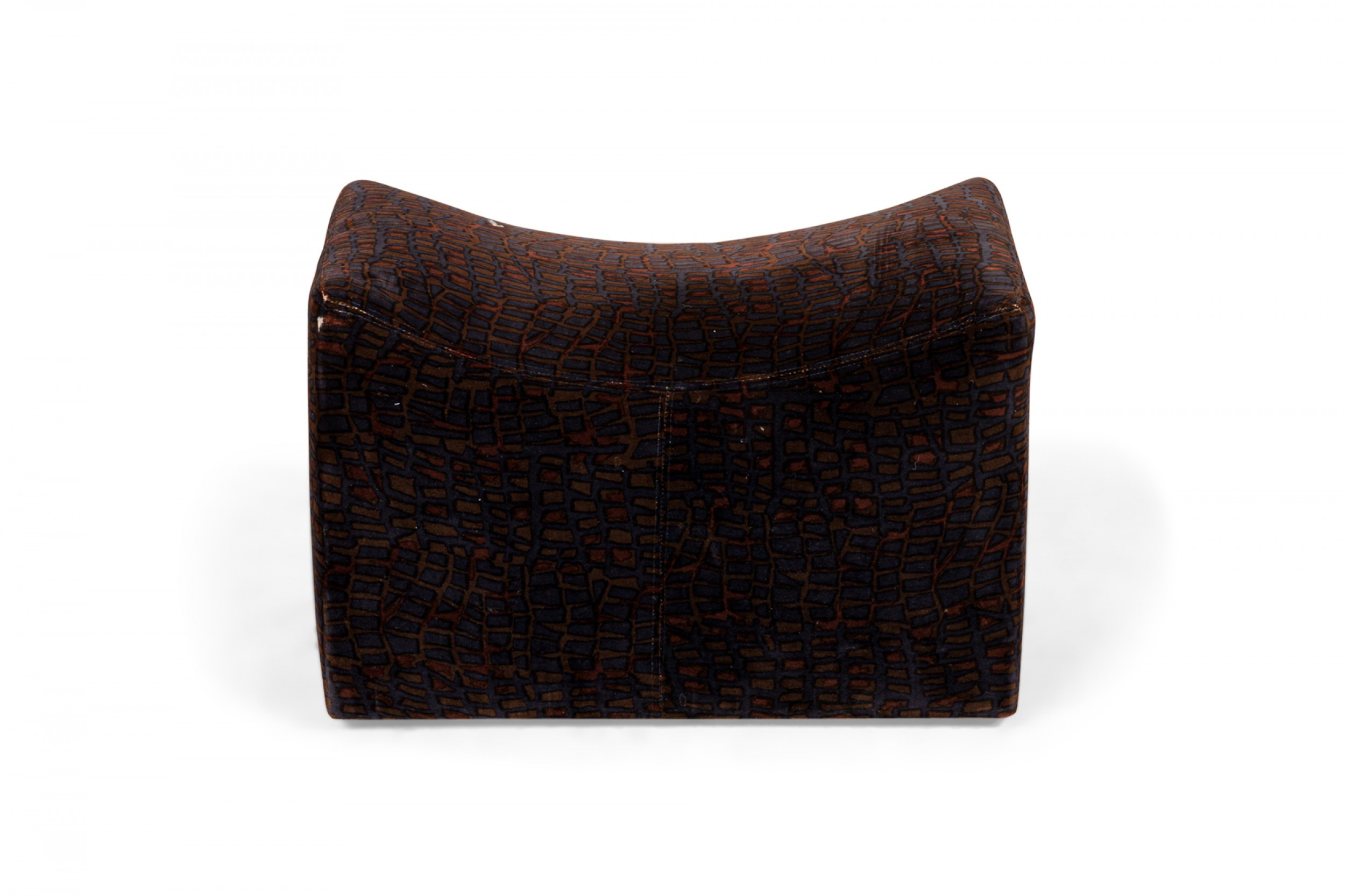 PAIR of American Mid-Century rectangular saddle form ottomans with velvet faux crocodile patterned purple, black, and brown upholstery and scooped tops, resting on four concealed casters. (MILO BAUGHMAN)(PRICED AS PAIR)