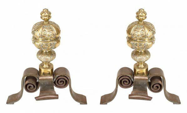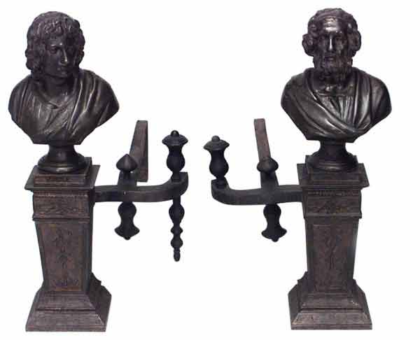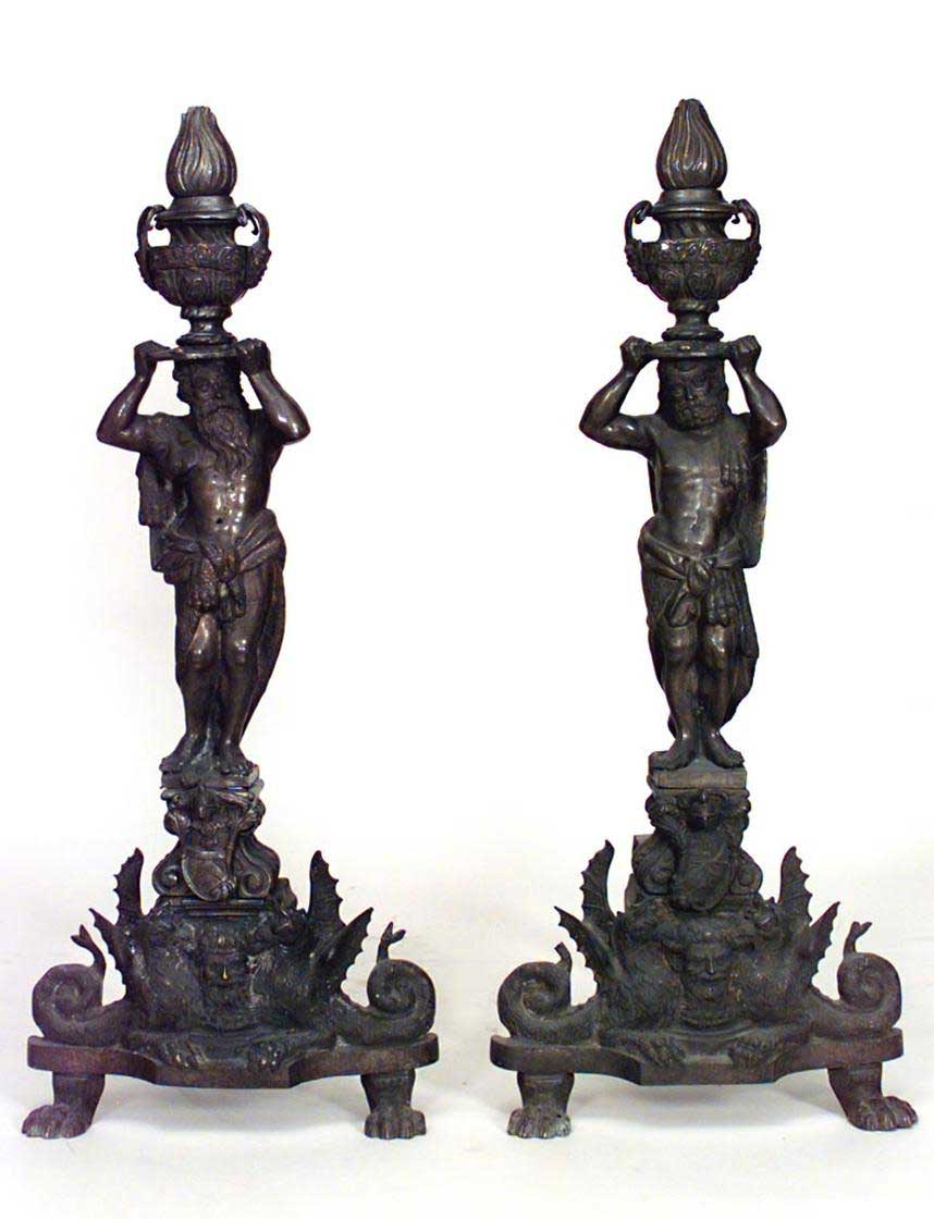 PAIR of Italian Renaissance-style (19th Century) bronze andirons with a classical figure holding urn with flame above his head all supported on a double griffin base (PRICED AS PAIR).