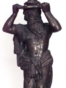 PAIR of Italian Renaissance-style (19th Century) bronze andirons with a classical figure holding urn with flame above his head all supported on a double griffin base (PRICED AS PAIR)