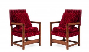 PAIR of English Renaissance-style oak Armchairs with square backs and seats seat with red velvet upholstery and oak legs joined by box stretchers. (PRICED AS PAIR)