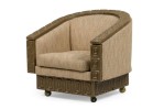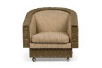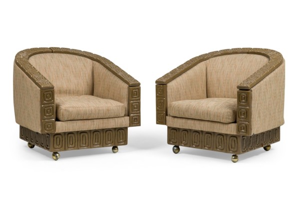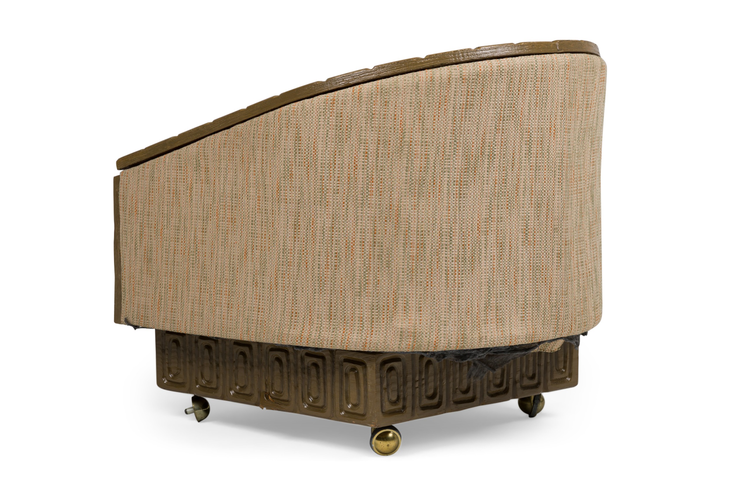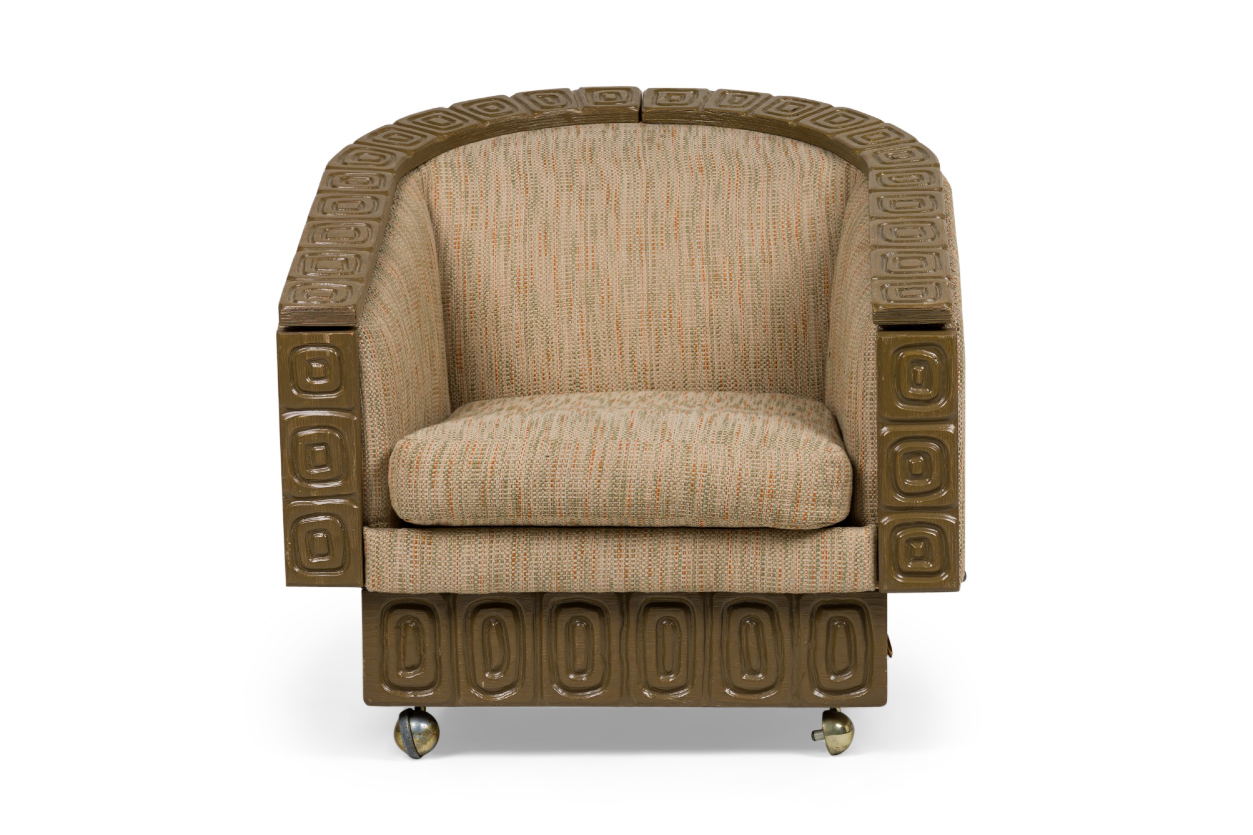 PAIR of Mid-Century American (1960s) limed oak revolving club / armchairs, the frames featuring a carved elliptical pattern, upholstered in a textured beige weave with orange and green highlights, resting on 4 ball casters. (ROMWEBER) (PRICED AS PAIR).