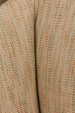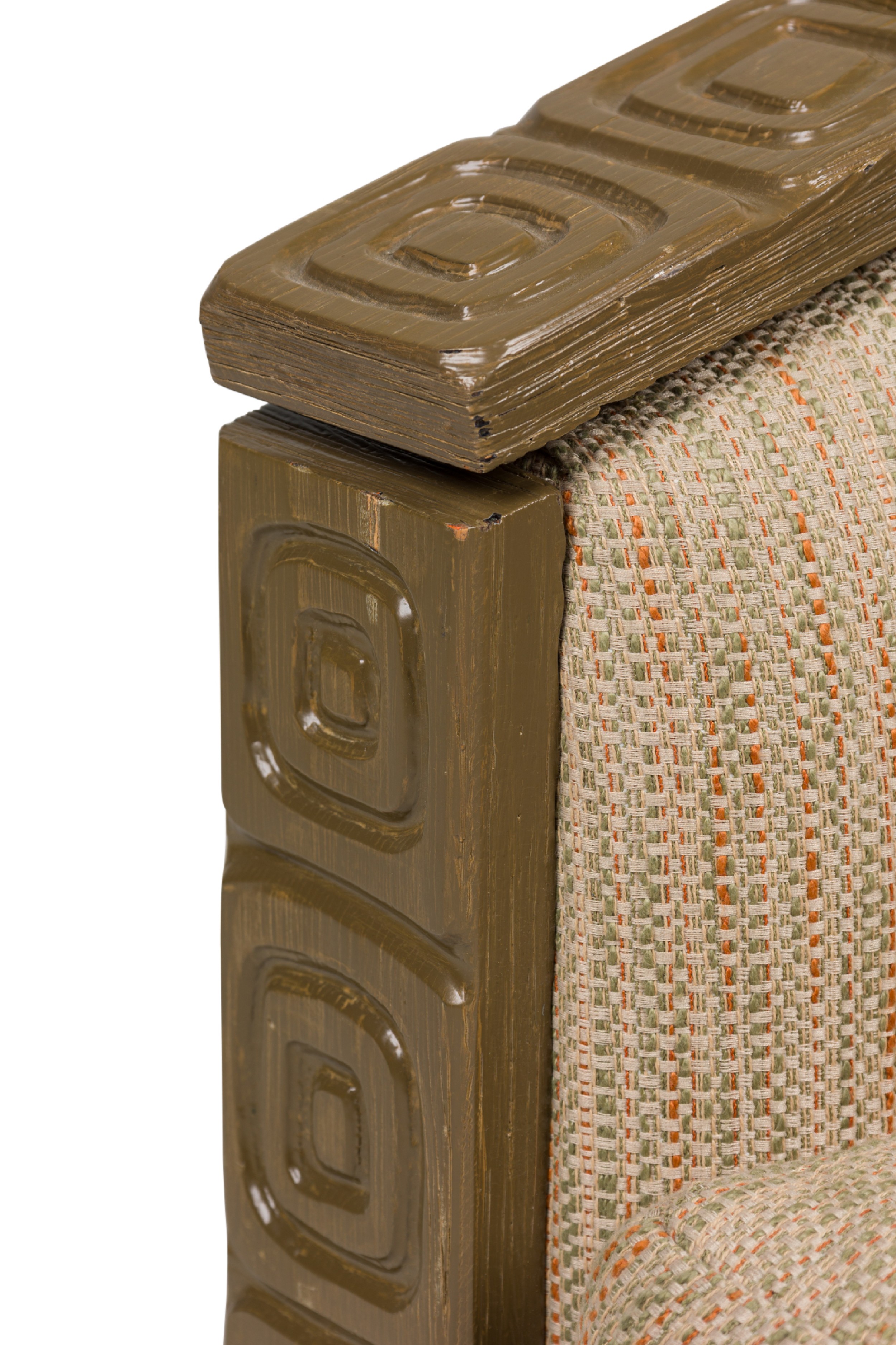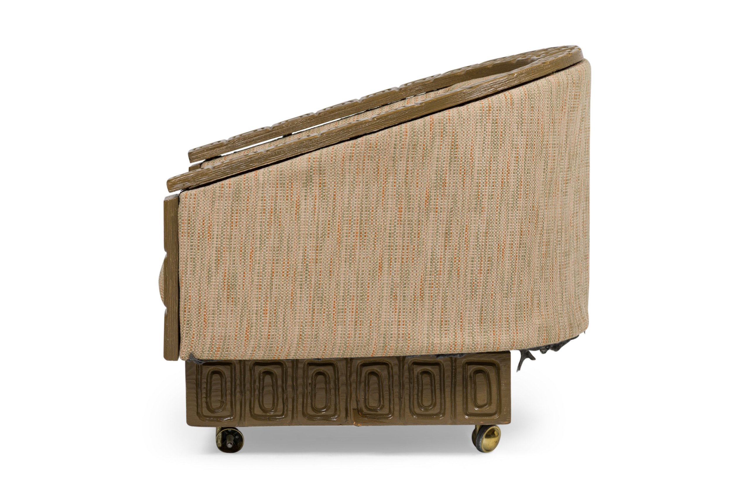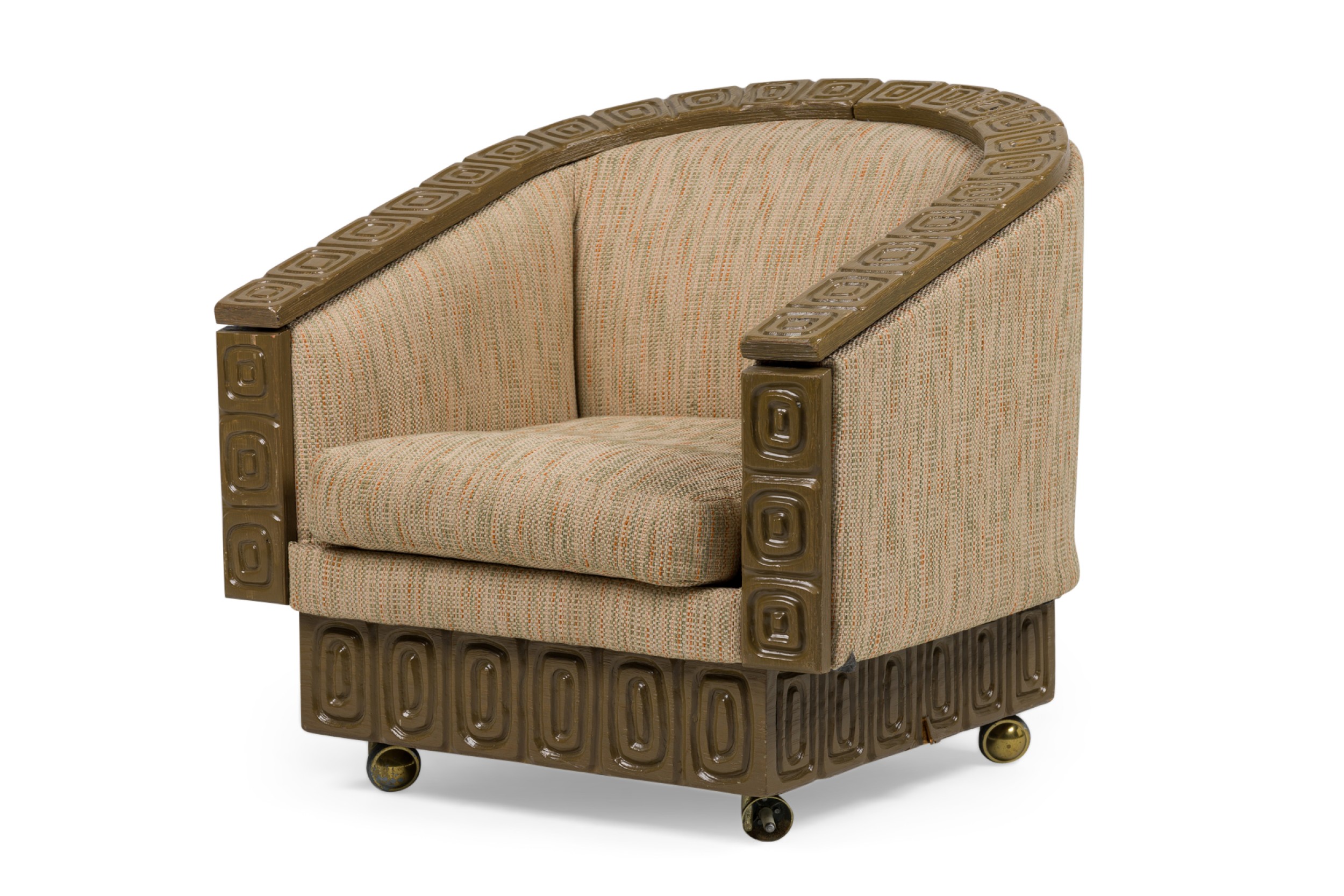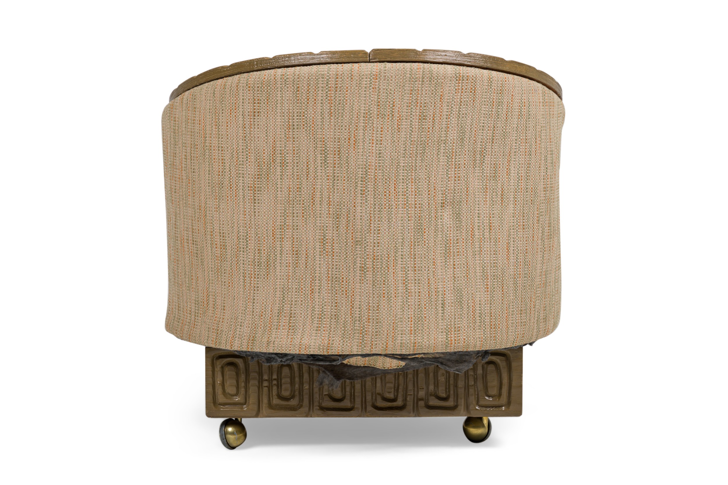 PAIR of Mid-Century American (1960s) limed oak revolving club / armchairs, the frames featuring a carved elliptical pattern, upholstered in a textured beige weave with orange and green highlights, resting on 4 ball casters. (ROMWEBER) (PRICED AS PAIR)