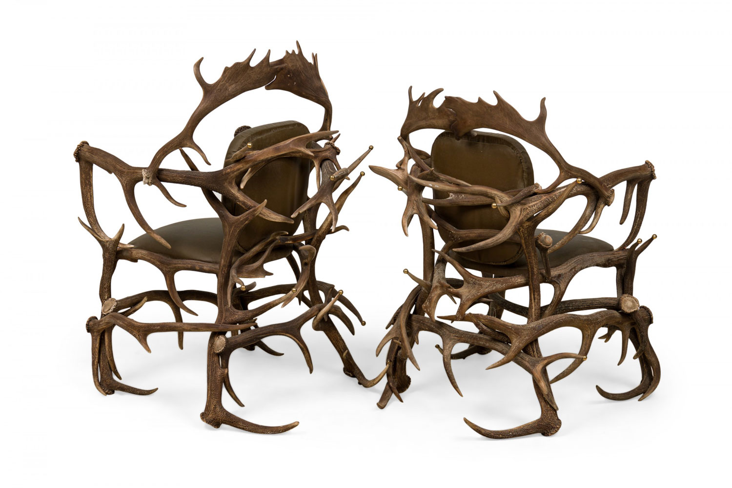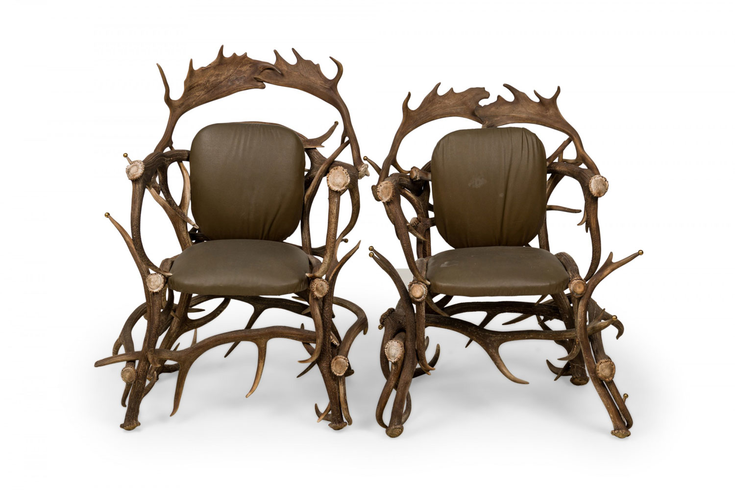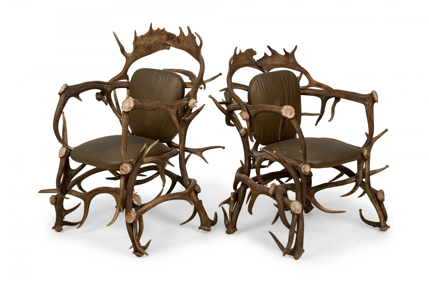 Pair of Rustic Continental Style Dark Olive Green Leather and Faux Antler Armchairs