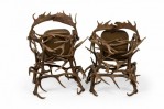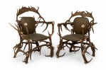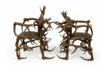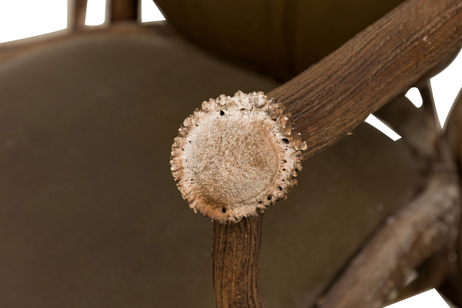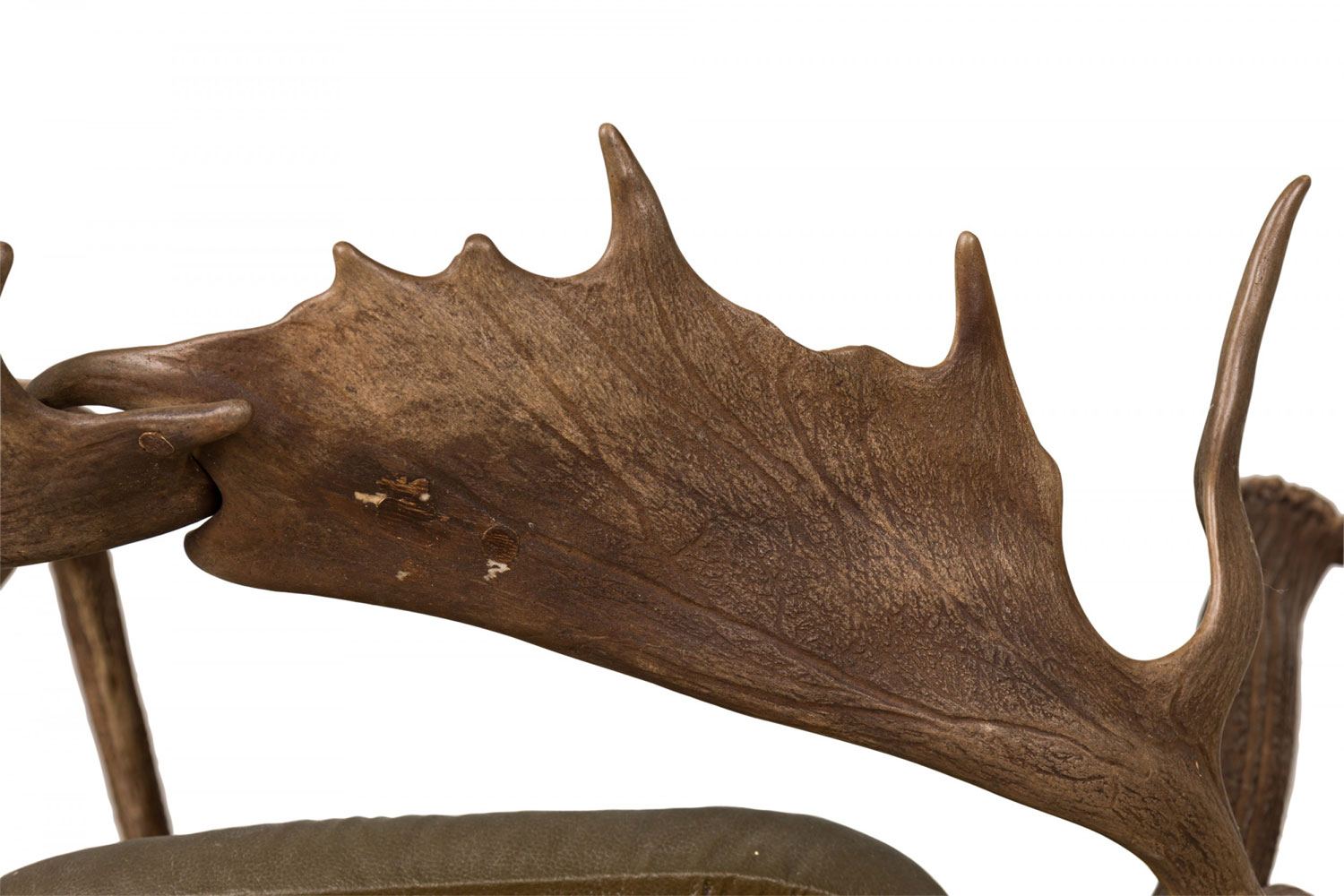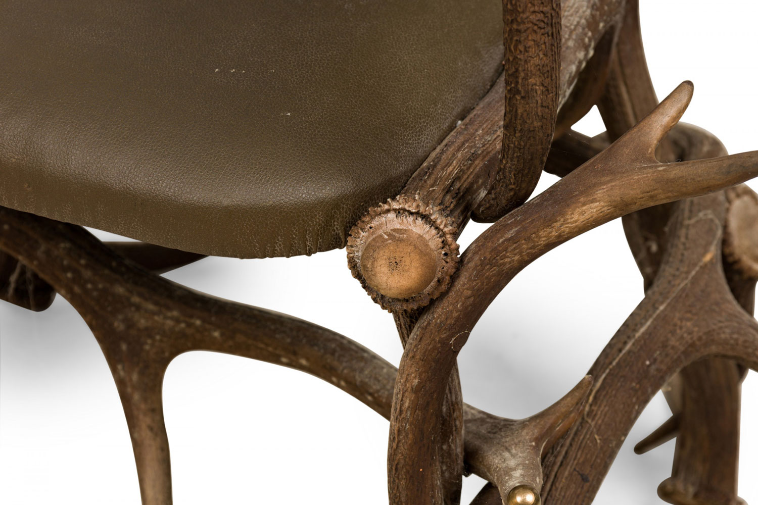 Pair of Rustic Continental Style Dark Olive Green Leather and Faux Antler Armchairs
