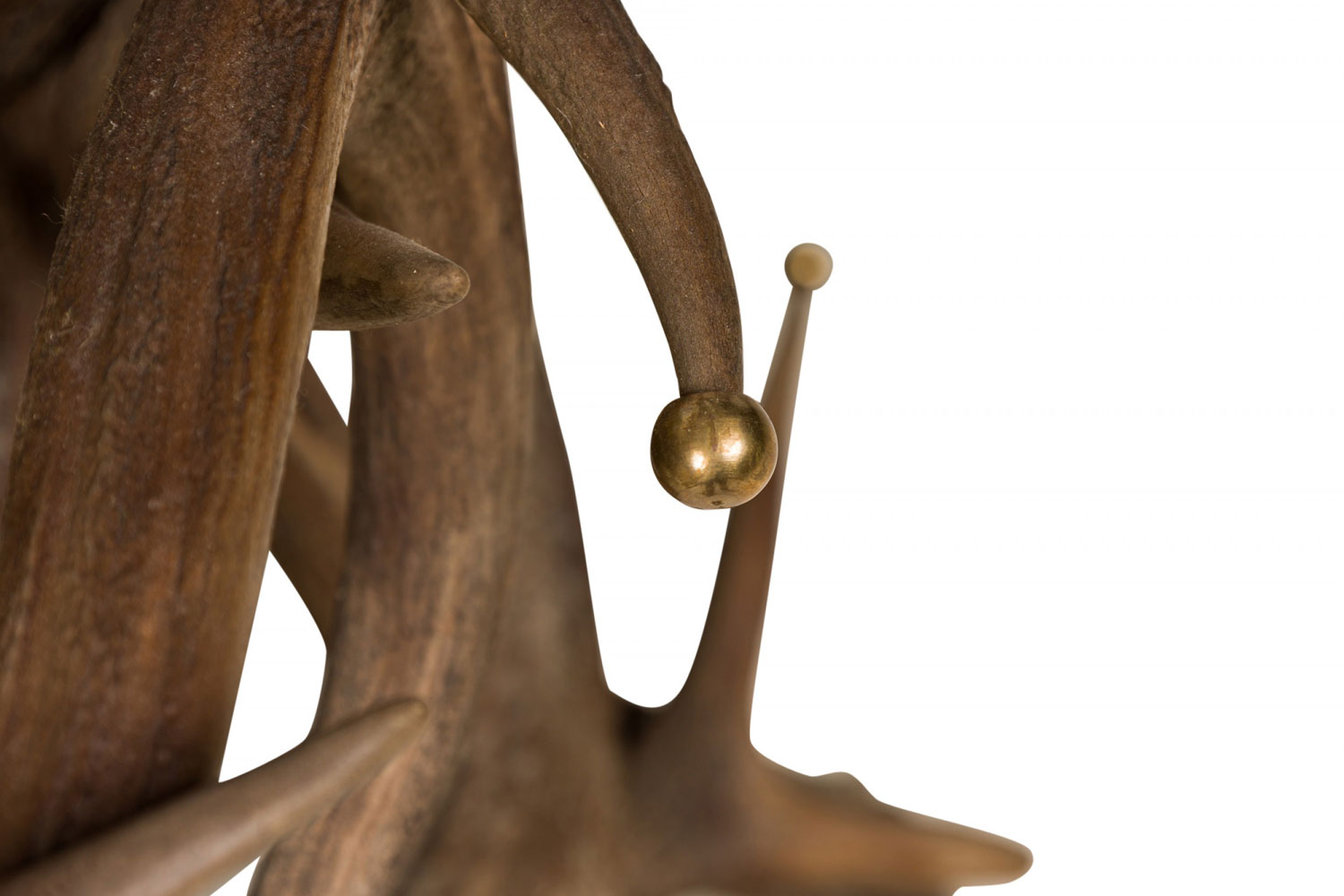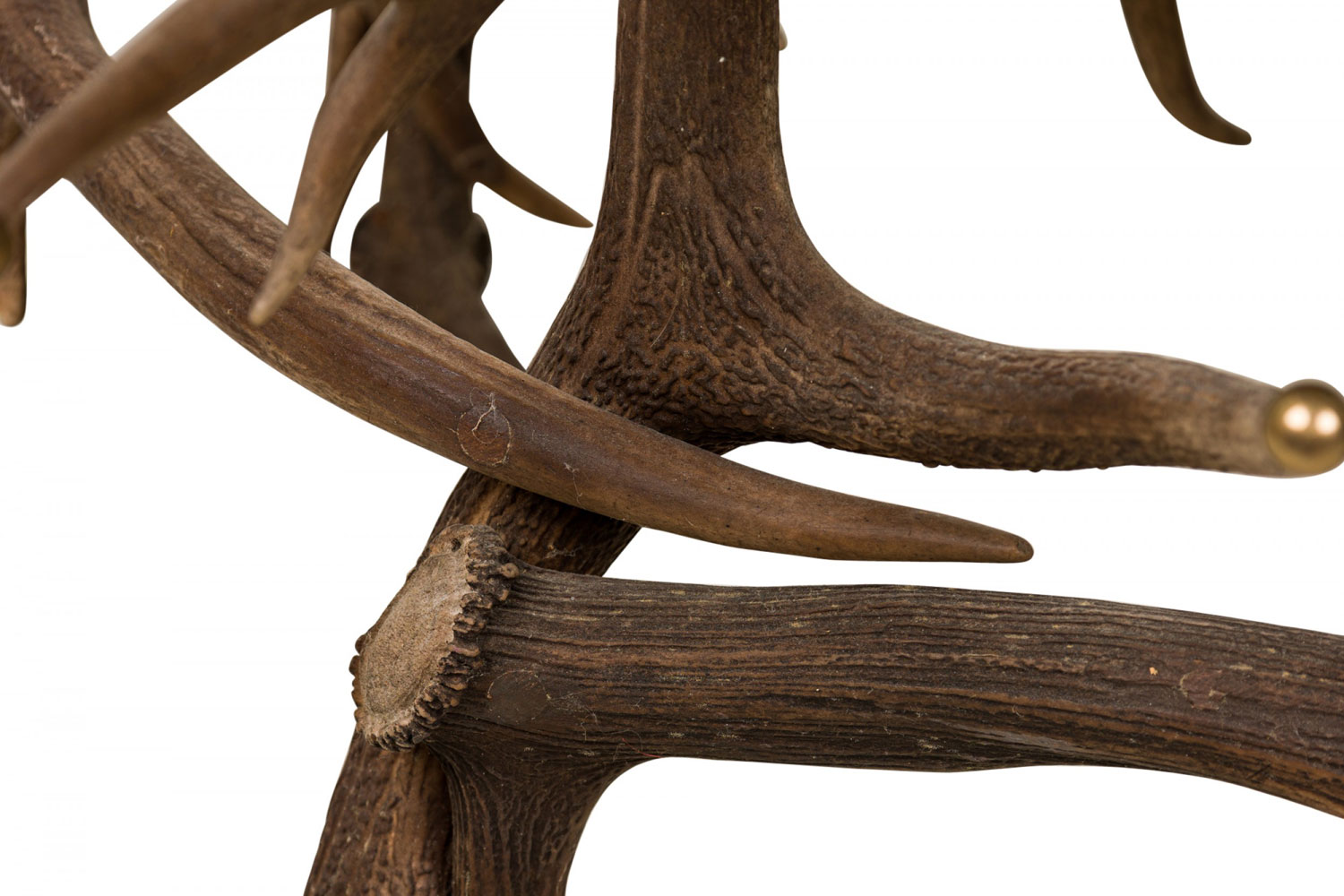 PAIR of Rustic Continental-style armchairs with resin faux moose and deer antler constructed frame with points capped with decorative brass balls, and dark olive green upholstered seats and backs. (PRICED AS PAIR)(Similar settee: 063381)