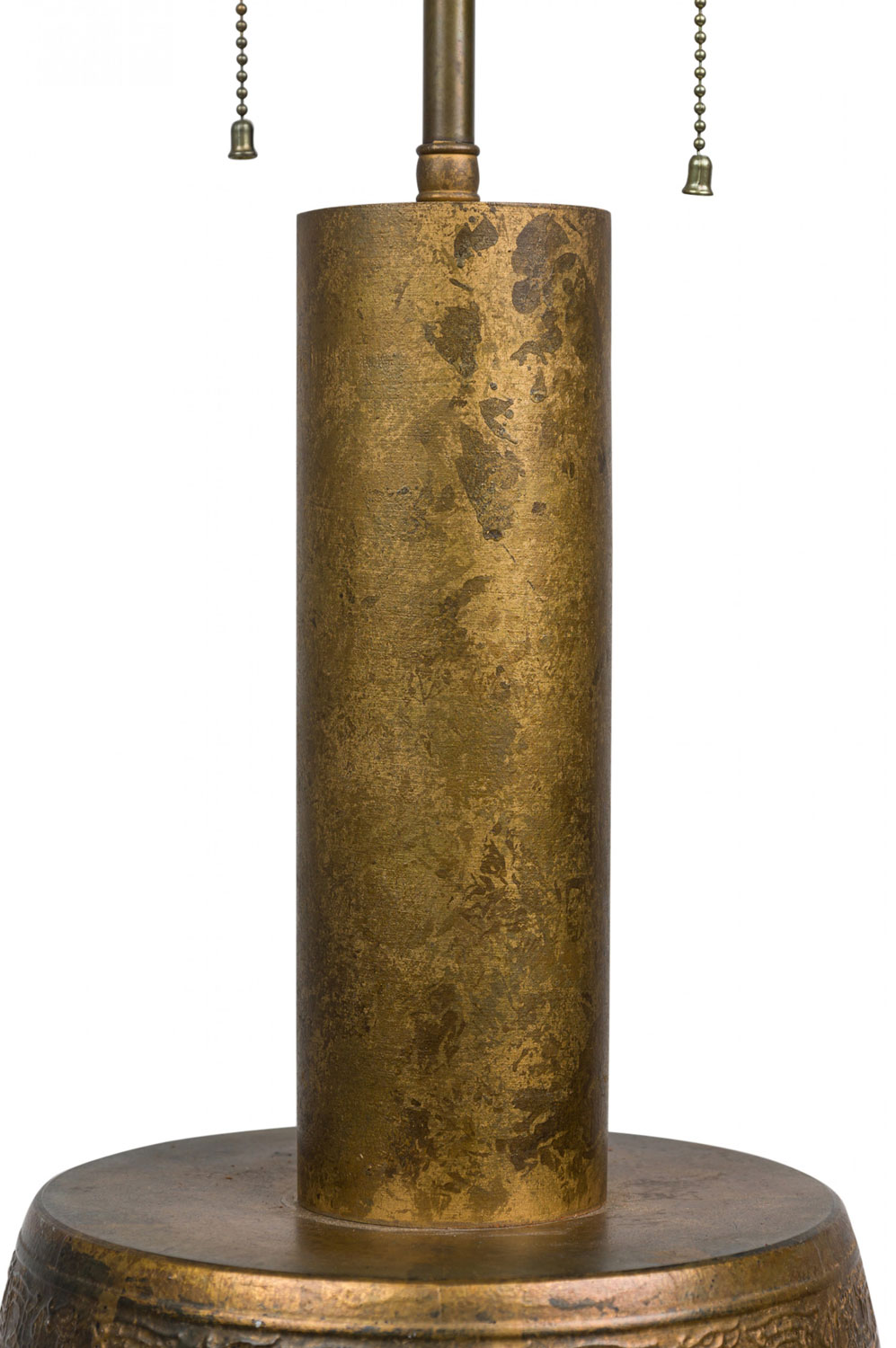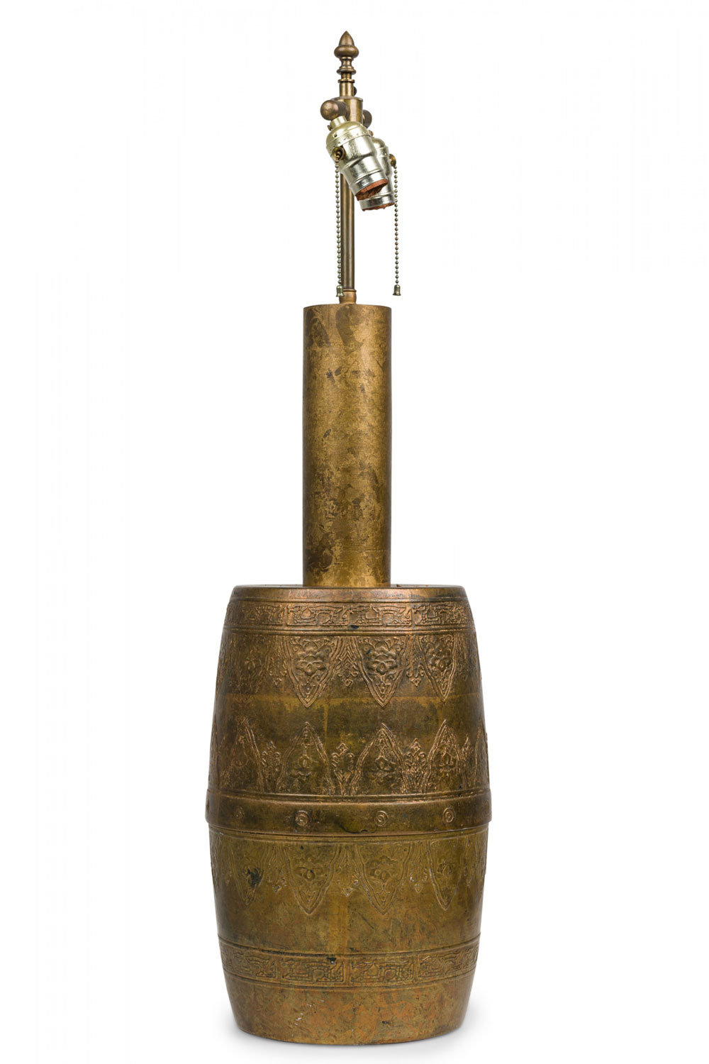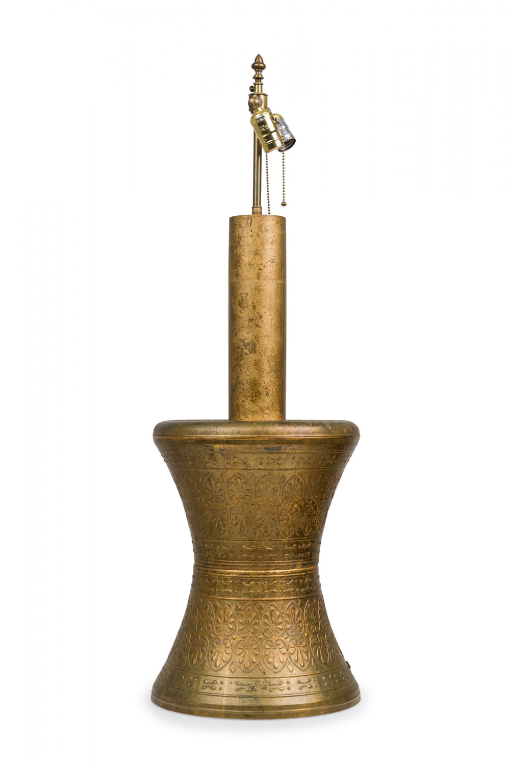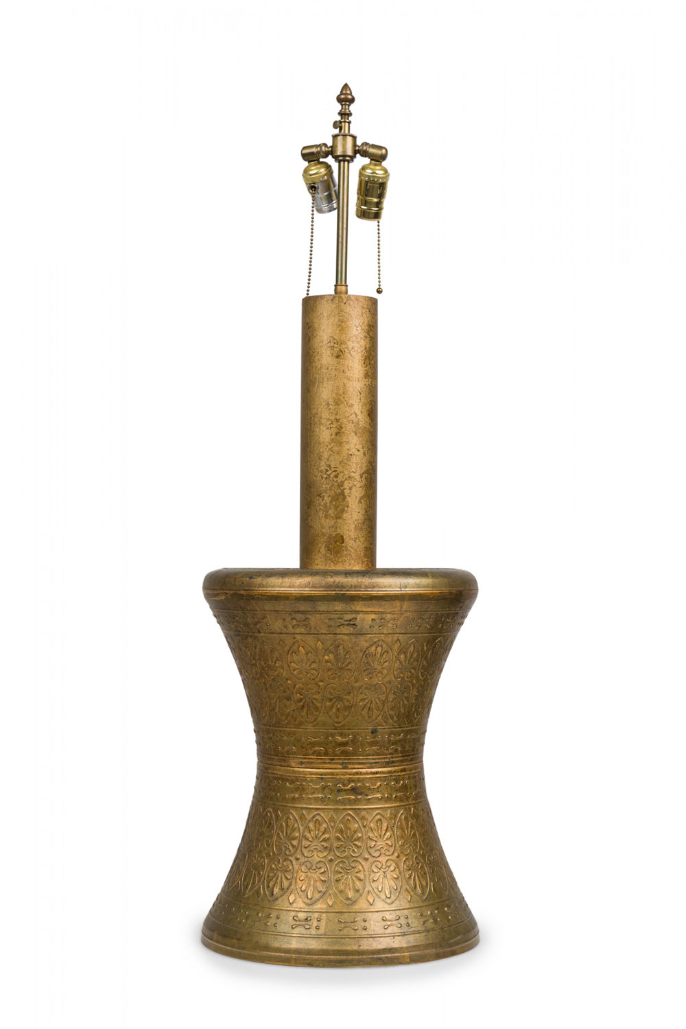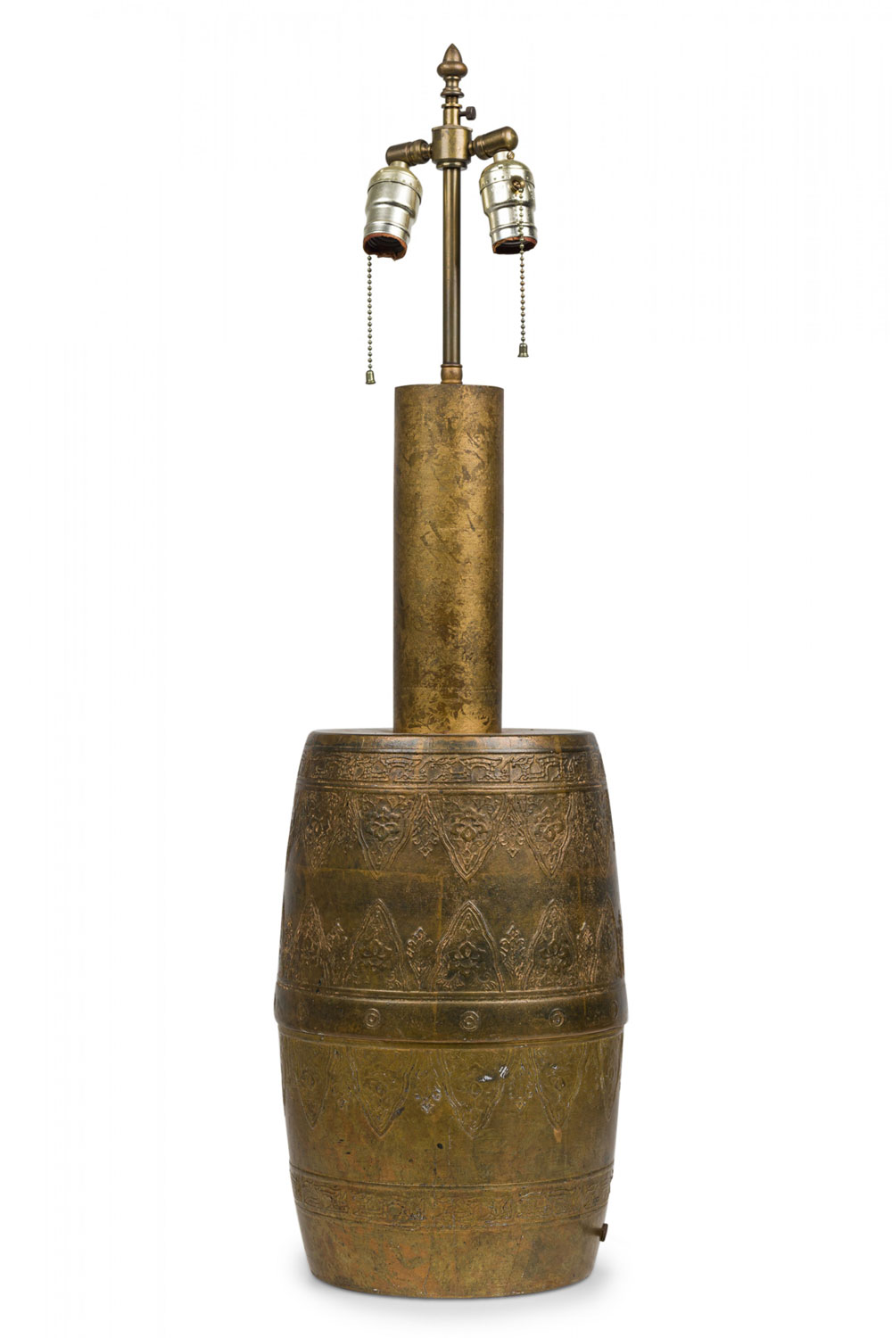 PAIR of similar Mid-Century American gilt metal Moroccan Style table lamps; the taller in hour glass form and the shorter, barrel-shaped. Both feature cylindrical wood stems, brass spindle finials, functioning light sockets which are adjustable and on / off switches located at the lower sections. The bodies are cast in repoussé scroll patterns and finished off with a gilt glaze. (HARVEY PROBBER)(PRICED AS PAIR).