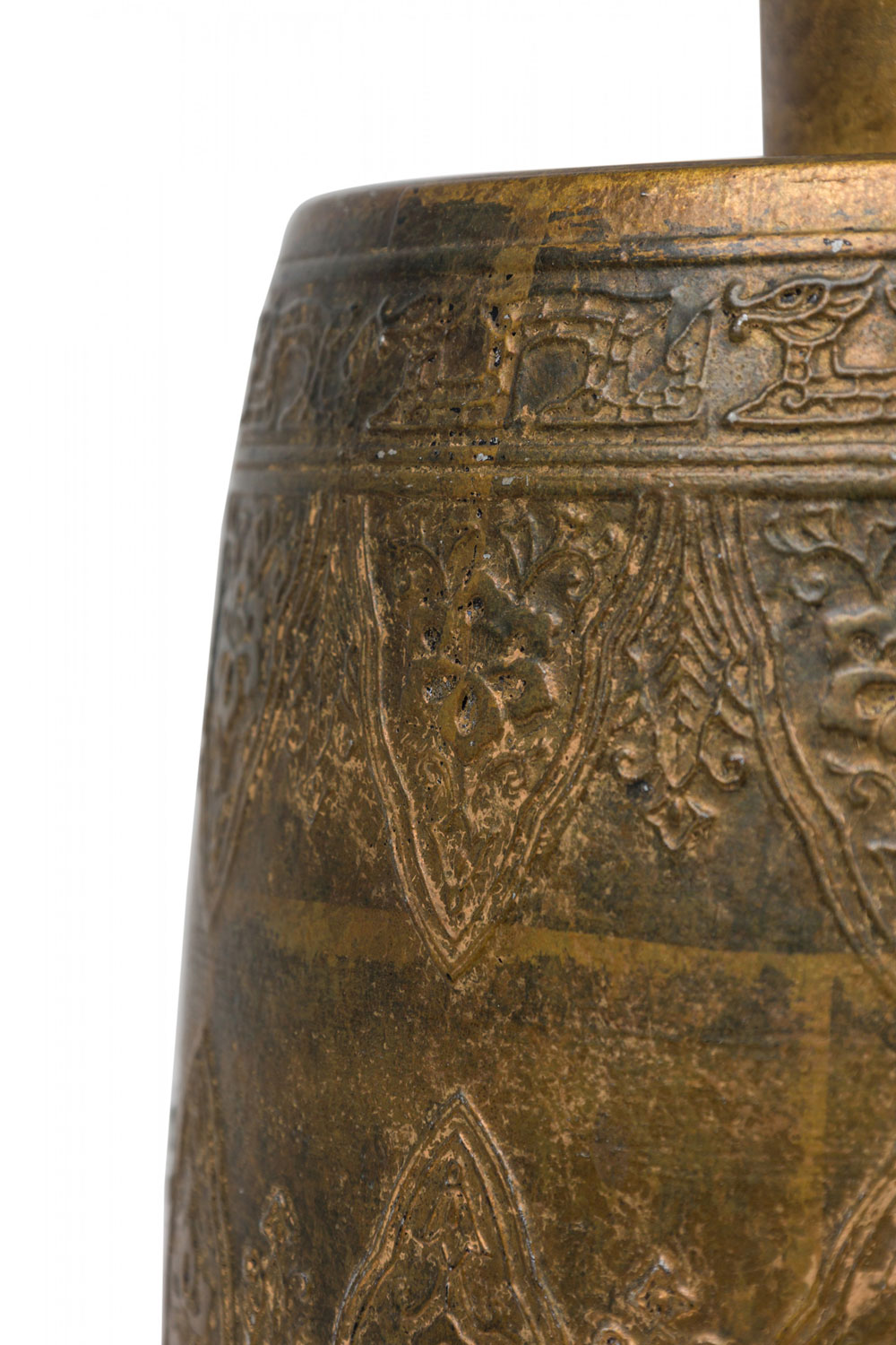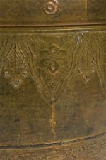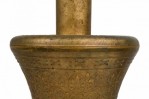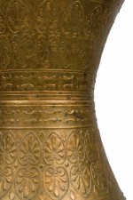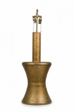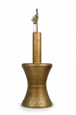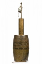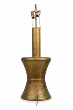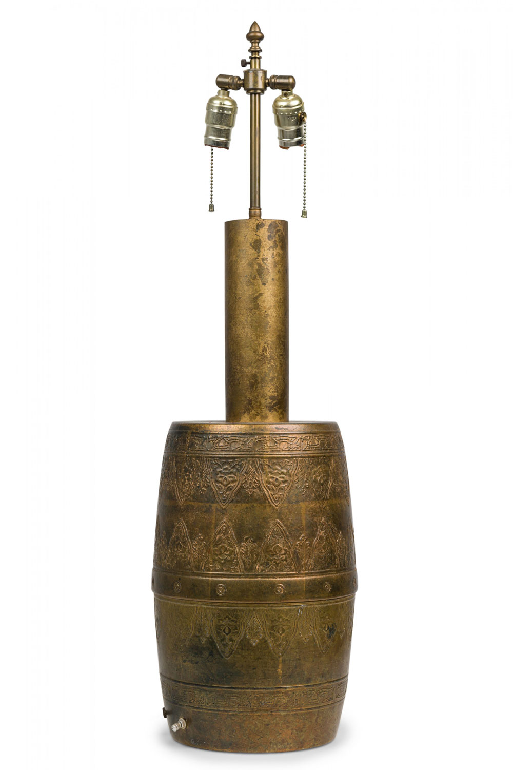 PAIR of similar Mid-Century American gilt metal Moroccan Style table lamps; the taller in hour glass form and the shorter, barrel-shaped. Both feature cylindrical wood stems, brass spindle finials, functioning light sockets which are adjustable and on / off switches located at the lower sections. The bodies are cast in repoussé scroll patterns and finished off with a gilt glaze. (HARVEY PROBBER)(PRICED AS PAIR)