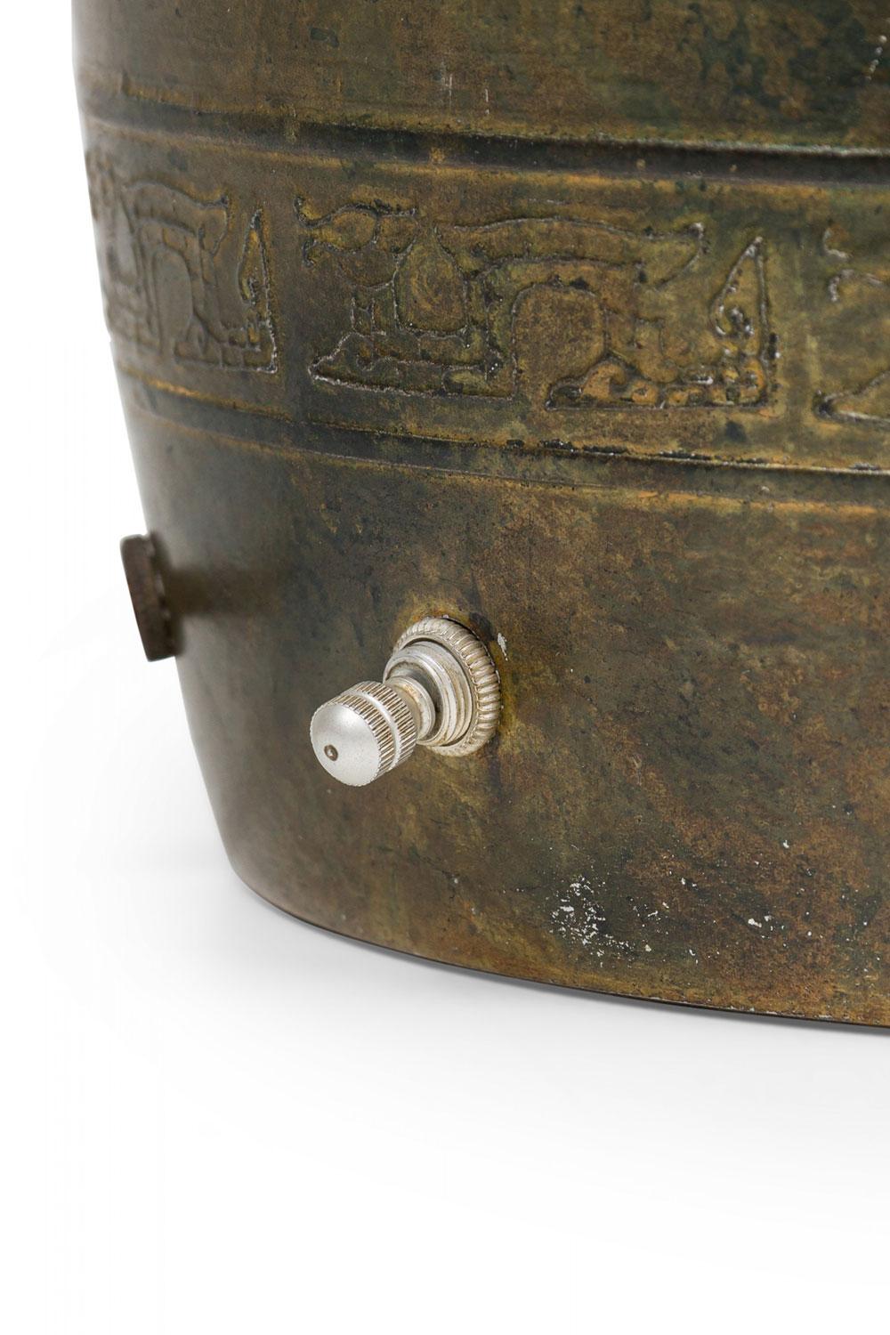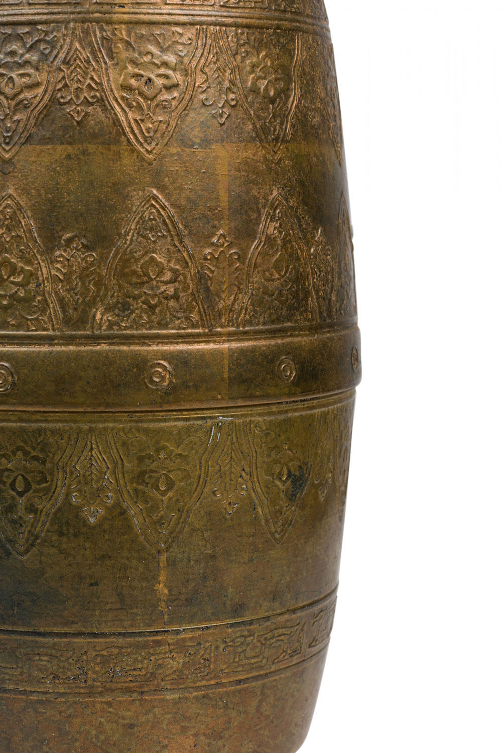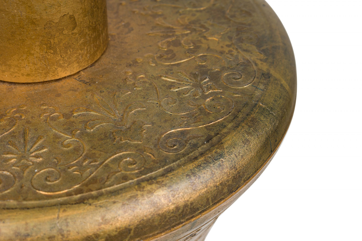 PAIR of similar Mid-Century American gilt metal Moroccan Style table lamps; the taller in hour glass form and the shorter, barrel-shaped. Both feature cylindrical wood stems, brass spindle finials, functioning light sockets which are adjustable and on / off switches located at the lower sections. The bodies are cast in repoussé scroll patterns and finished off with a gilt glaze. (HARVEY PROBBER)(PRICED AS PAIR)